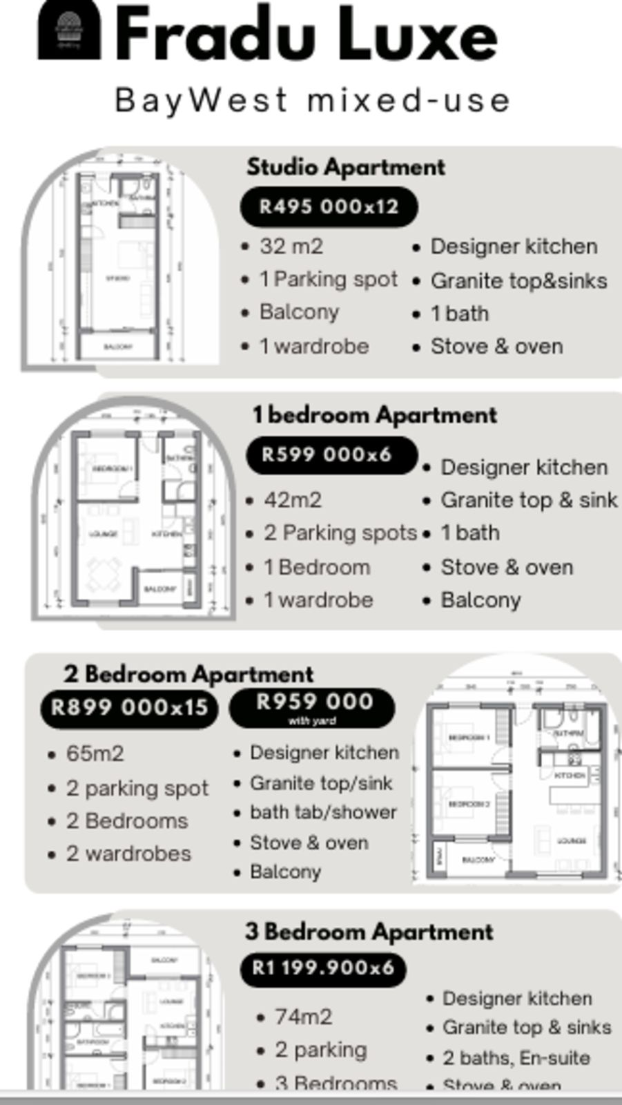 Brand-new 74m2 3-bedroom apartment with balcony in the sought-after Baywest Precinct. Features three bedrooms with built-in wardrobes, a designer kitchen with granite countertops, modern finishes, two secure parking bays, and 24-hour security.