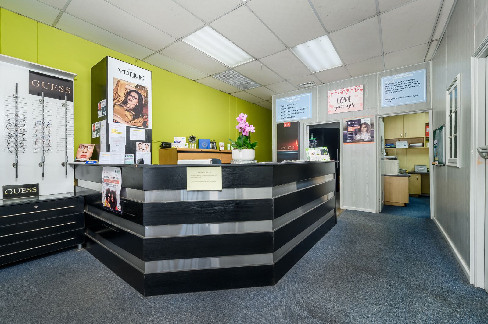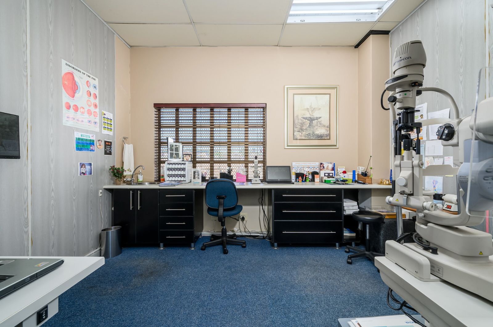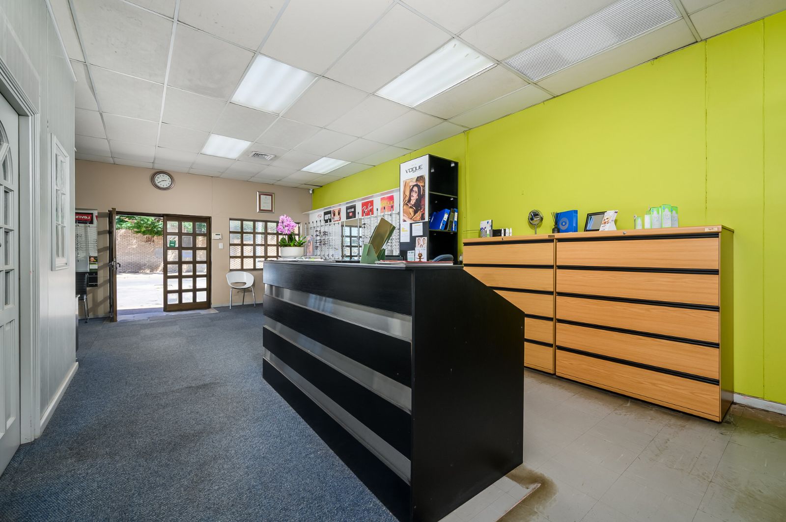 Measuring approximately 117 square metres, the modern business space offers a versatile layout adaptable to a variety of professional uses. Currently operating as an optometrist practice, the property is thoughtfully configured with reception, consultation rooms, and functional workspace areas.
