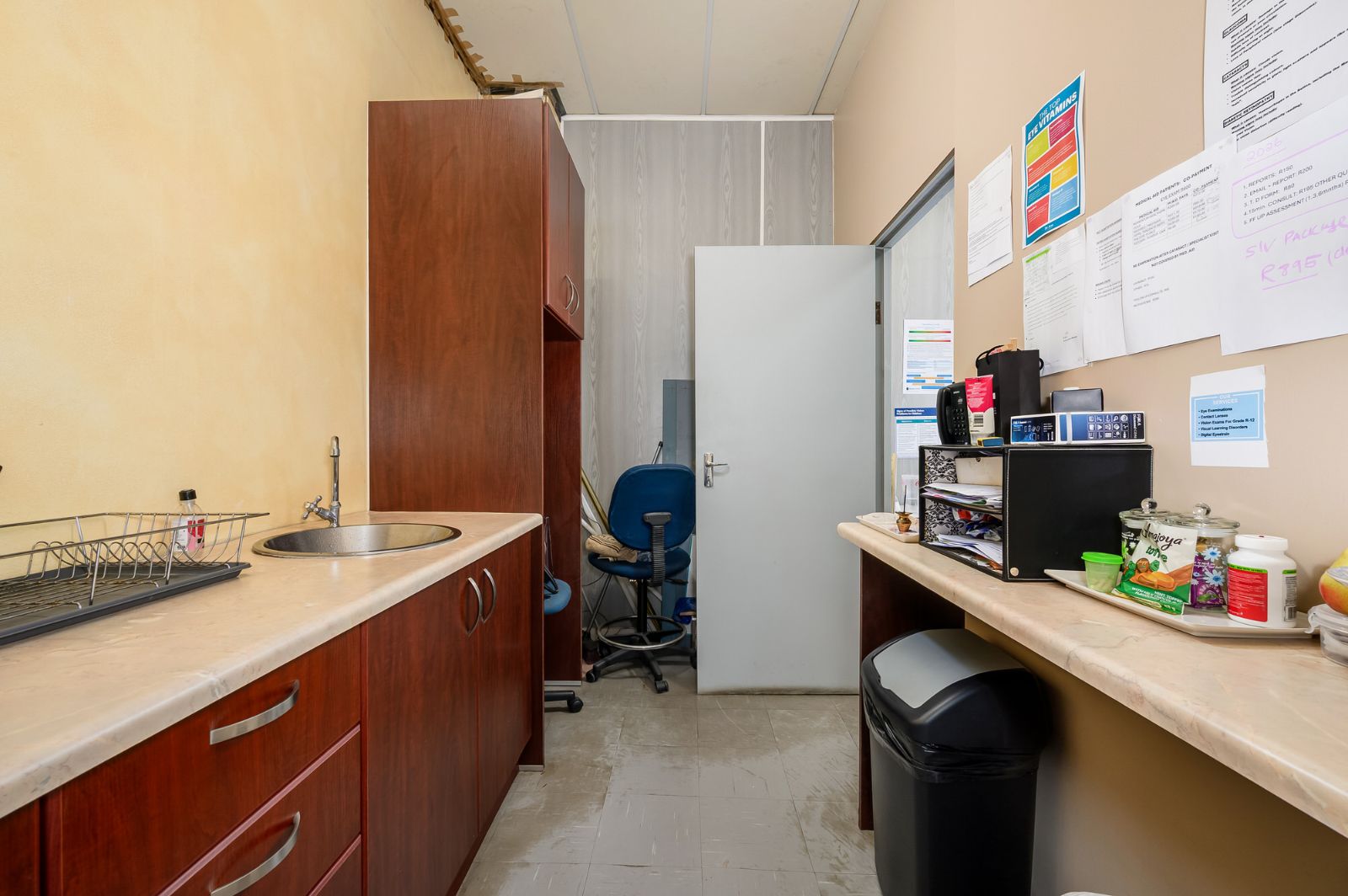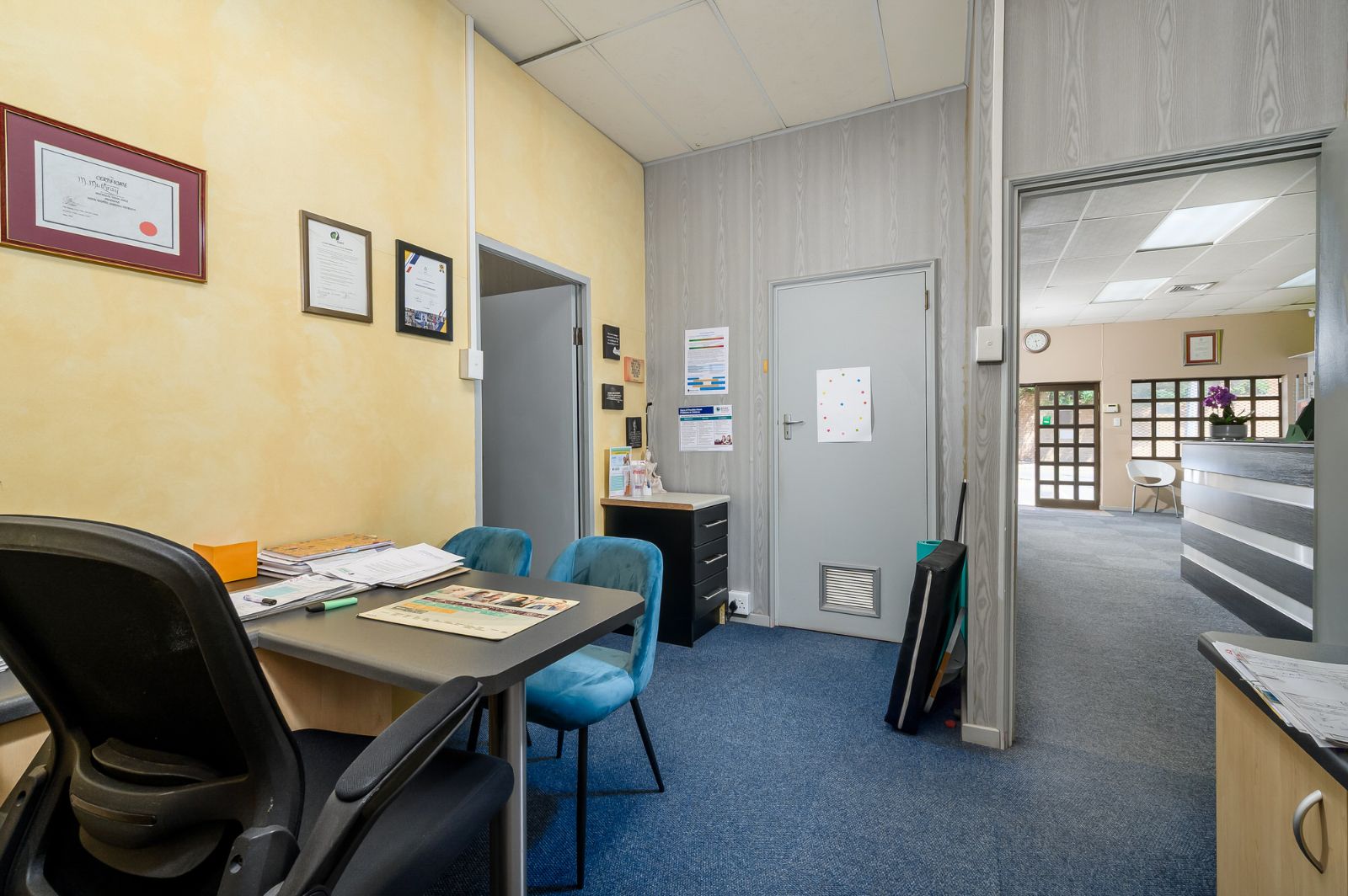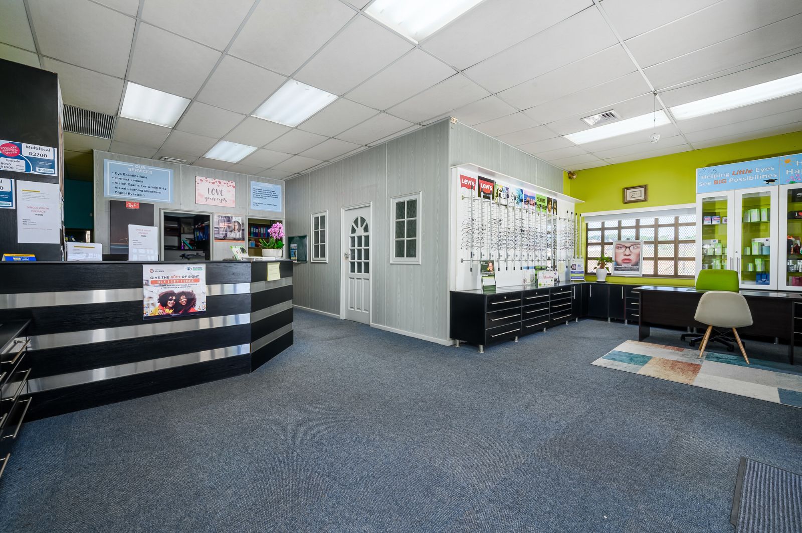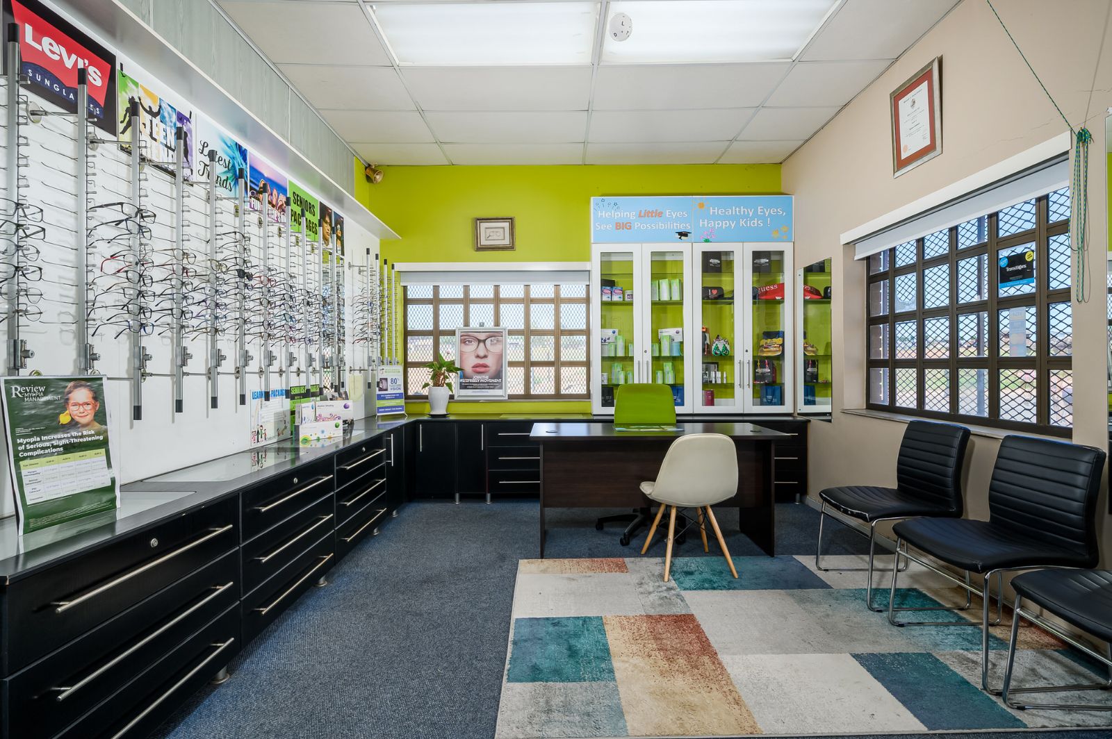 Measuring approximately 117 square metres, the modern business space offers a versatile layout adaptable to a variety of professional uses. Currently operating as an optometrist practice, the property is thoughtfully configured with reception, consultation rooms, and functional workspace areas.