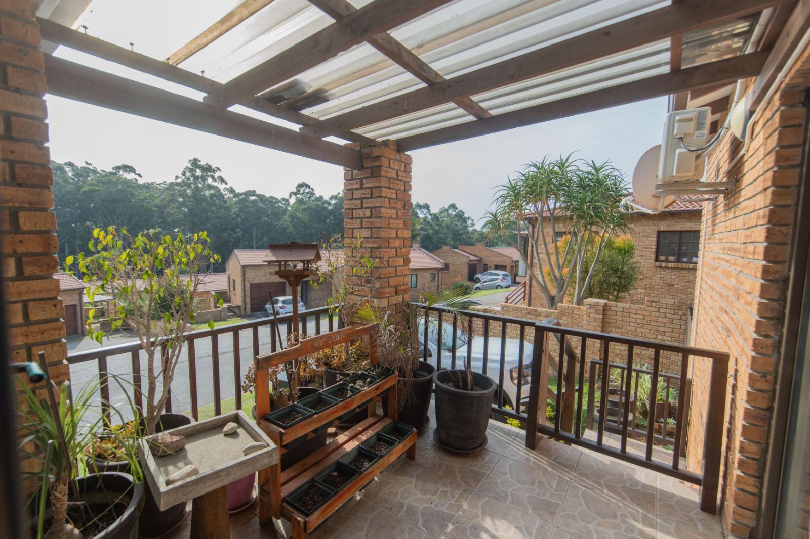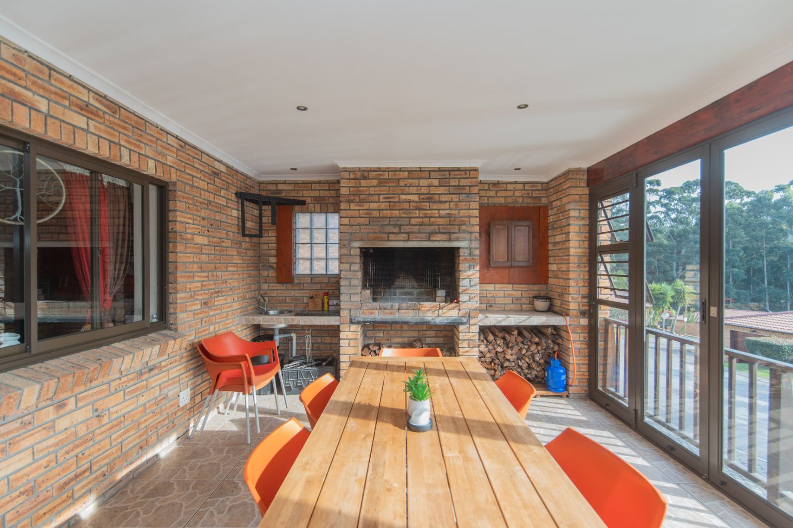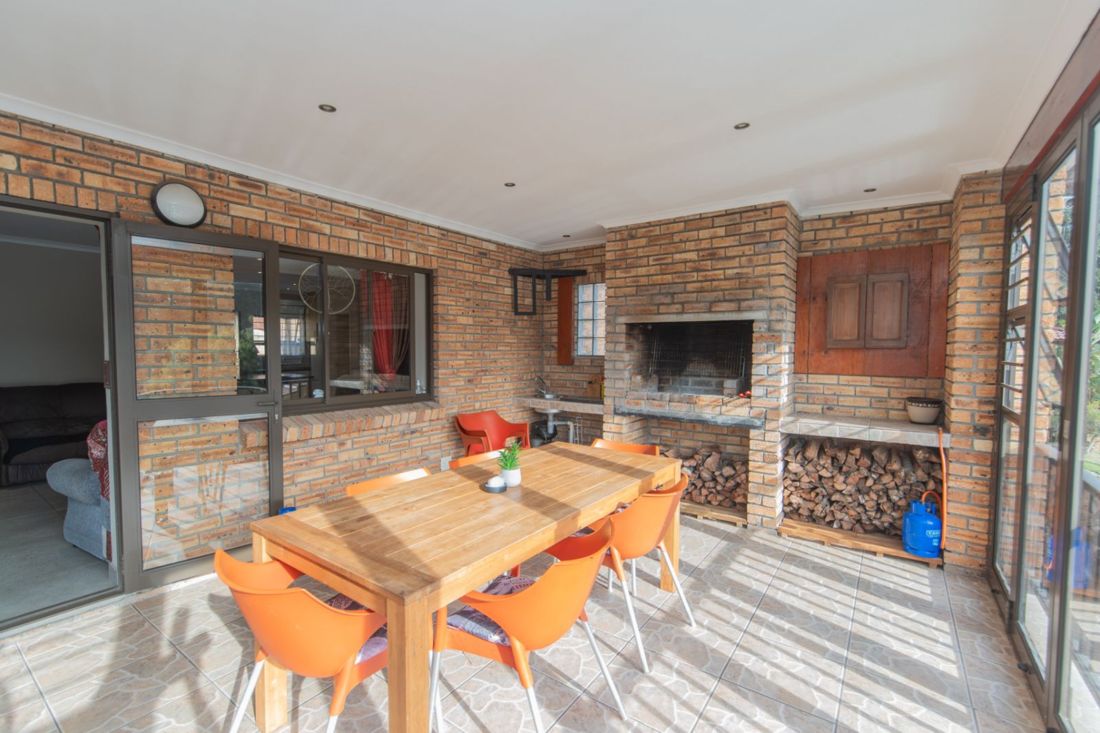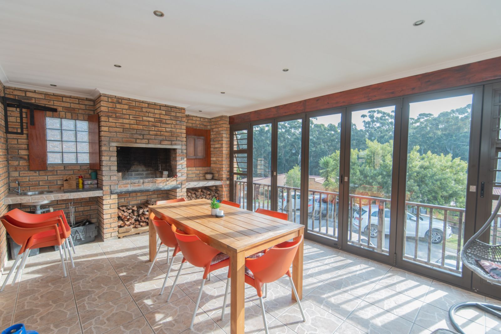 Fully tiled entertainment area with built-in braai, overlooking the lush greenbelt — perfect for weekend relaxation