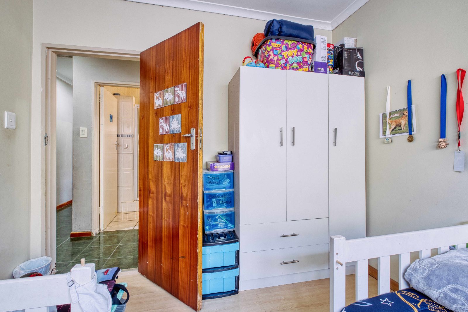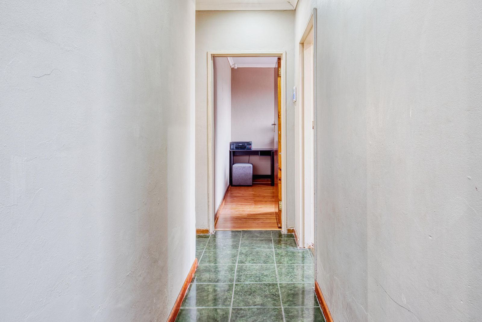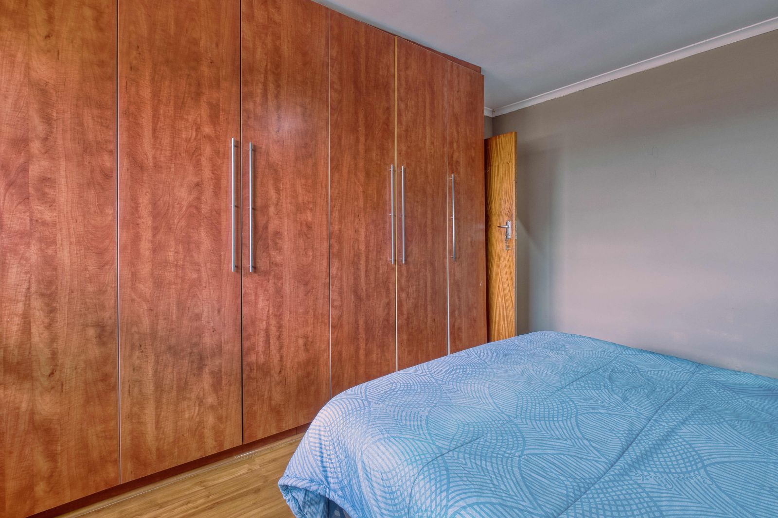 Along the passage you will find three stunning bedrooms. The middle room is the very big room. It has wooden flooring and built in cupboards. The second bedroom has laminated flooring and built in cupboards as well. The third bedroom has laminated flooring as well and down lights for that extra touch. Also with build in cupboards.