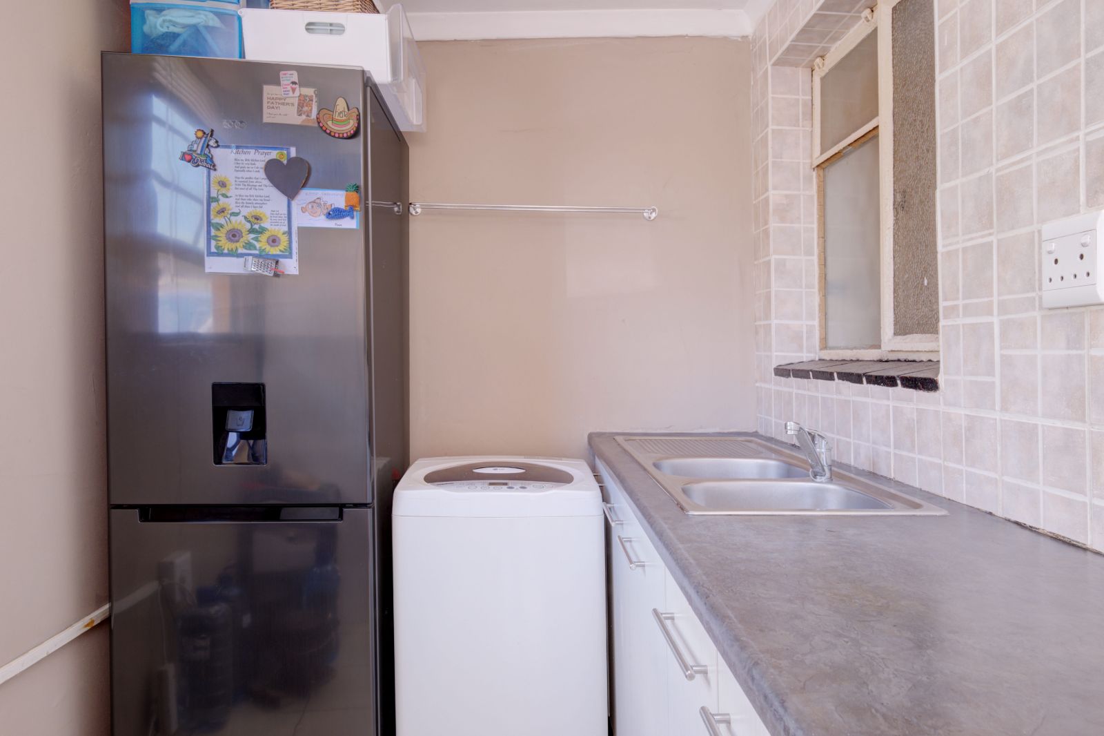 There is another addition to the kitchen. A extra space where you have two sinks where dishes can be washed. Your fridge has a space there and you can even house a deep freezer or any other kitchen goodies. There is even space for a washing machine. And there is built in cupboards as well. This is such a big plus to this home. Down your passage you will find a nice size bathroom with a bath, basin, toilet and a shower. All in one.