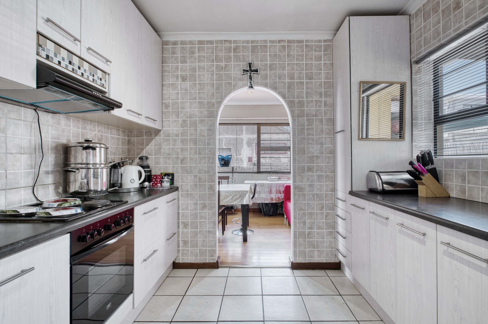 Moving down on this passage you can find a spacious kitchen with lots of built in cupboards. And a built in stove and oven. Plus extractor fan.