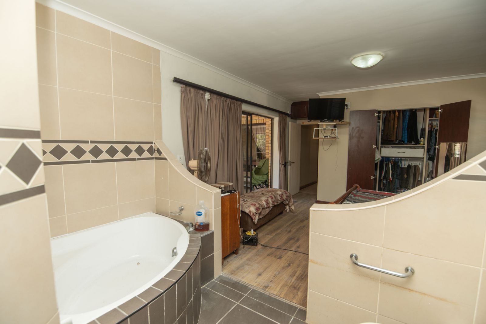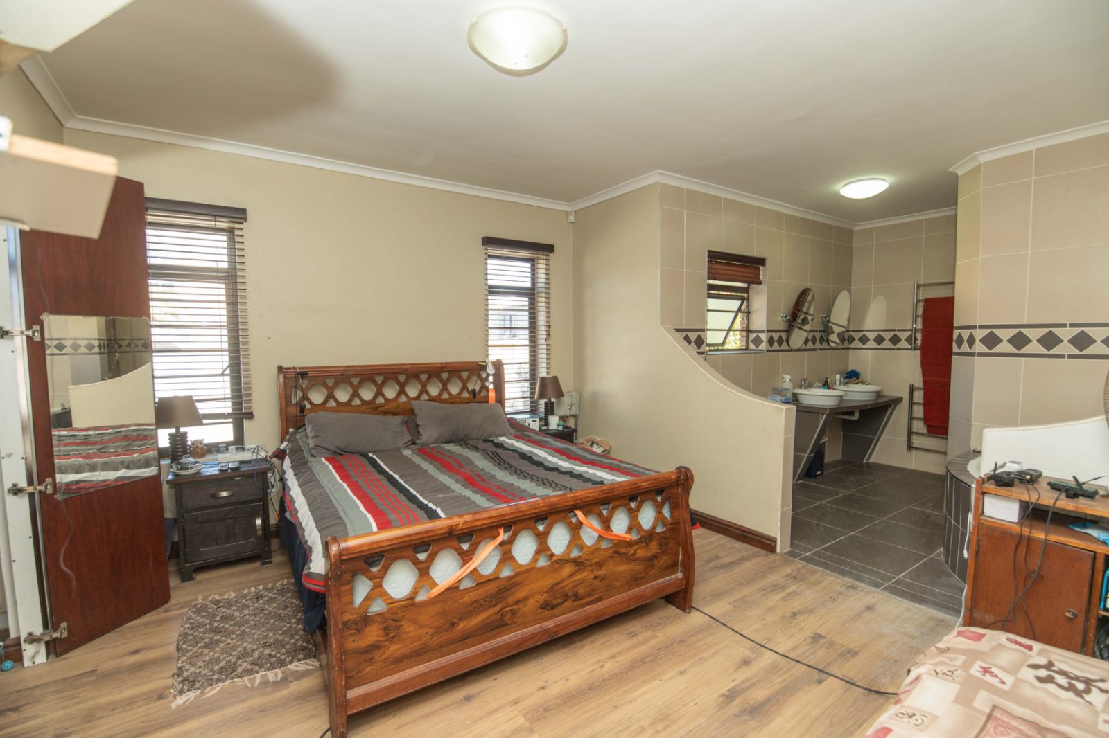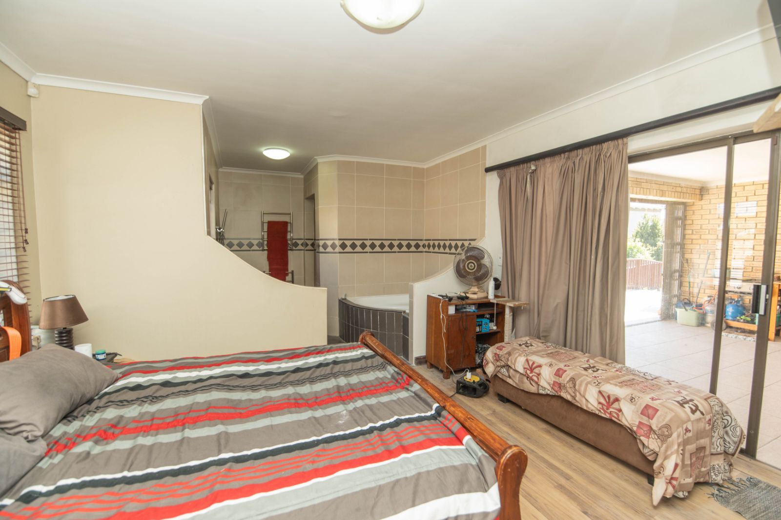 All three bedrooms are generously sized and fitted with built-in cupboards, providing comfortable accommodation for the whole family. The main bedroom is a true retreat, complete with a walk-in closet and a full ensuite bathroom featuring a luxurious spa bath. Sliding doors open directly onto the patio, creating a peaceful connection to the outdoor living space.