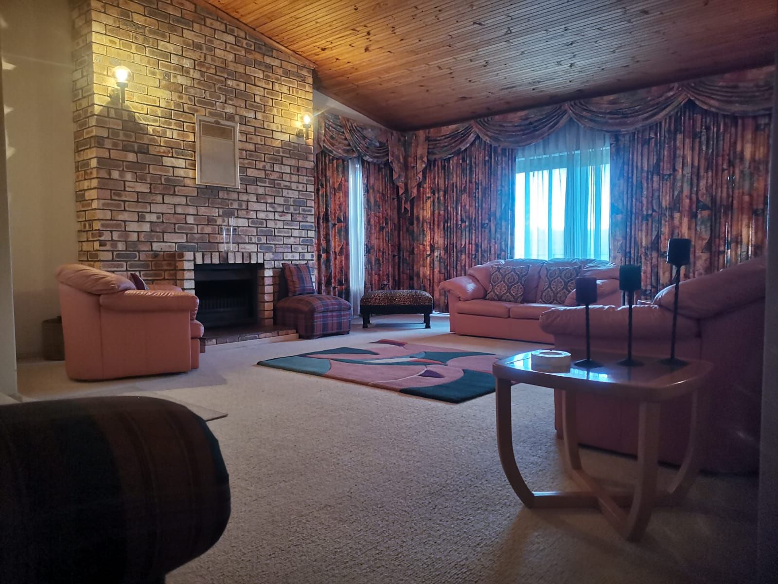 The spacious lounge boasts heated flooring and a cozy fireplace, with direct access to the veranda, creating a seamless indoor-outdoor flow.