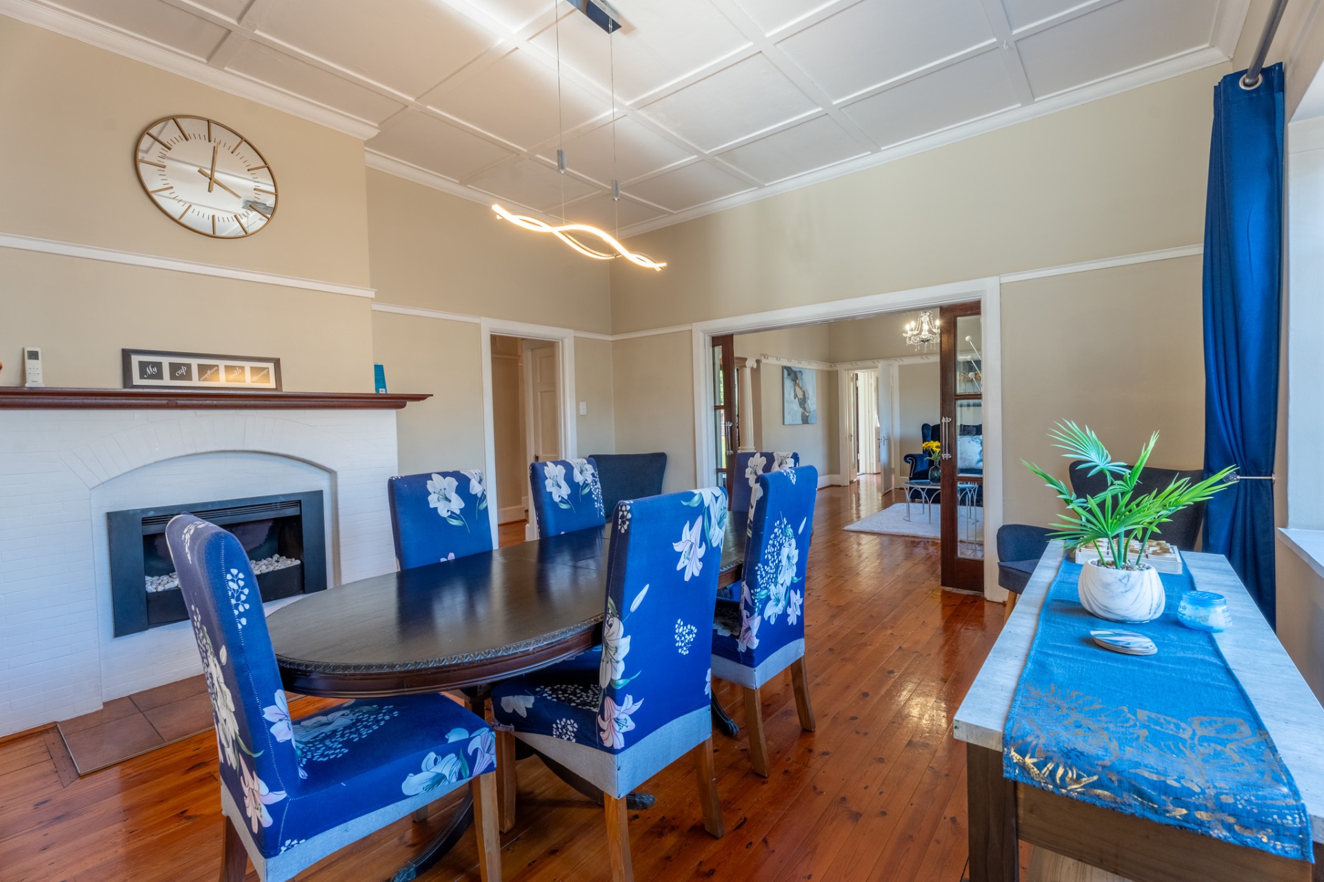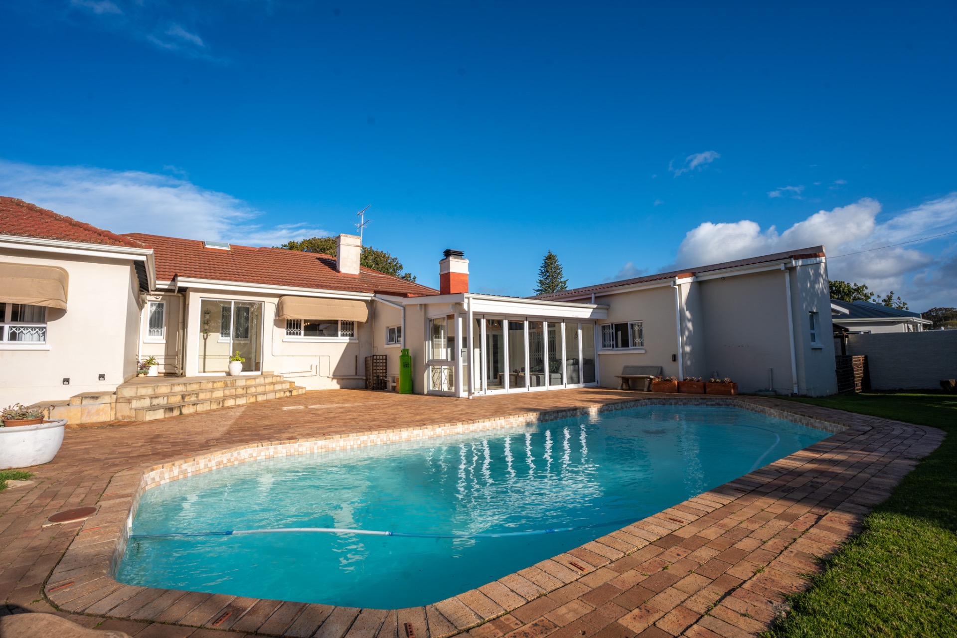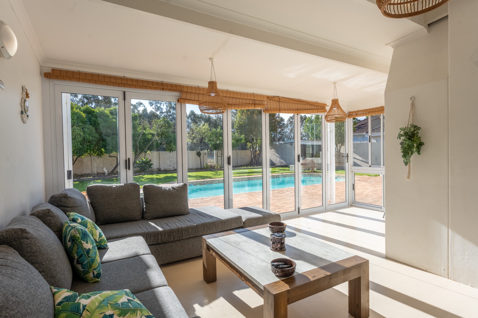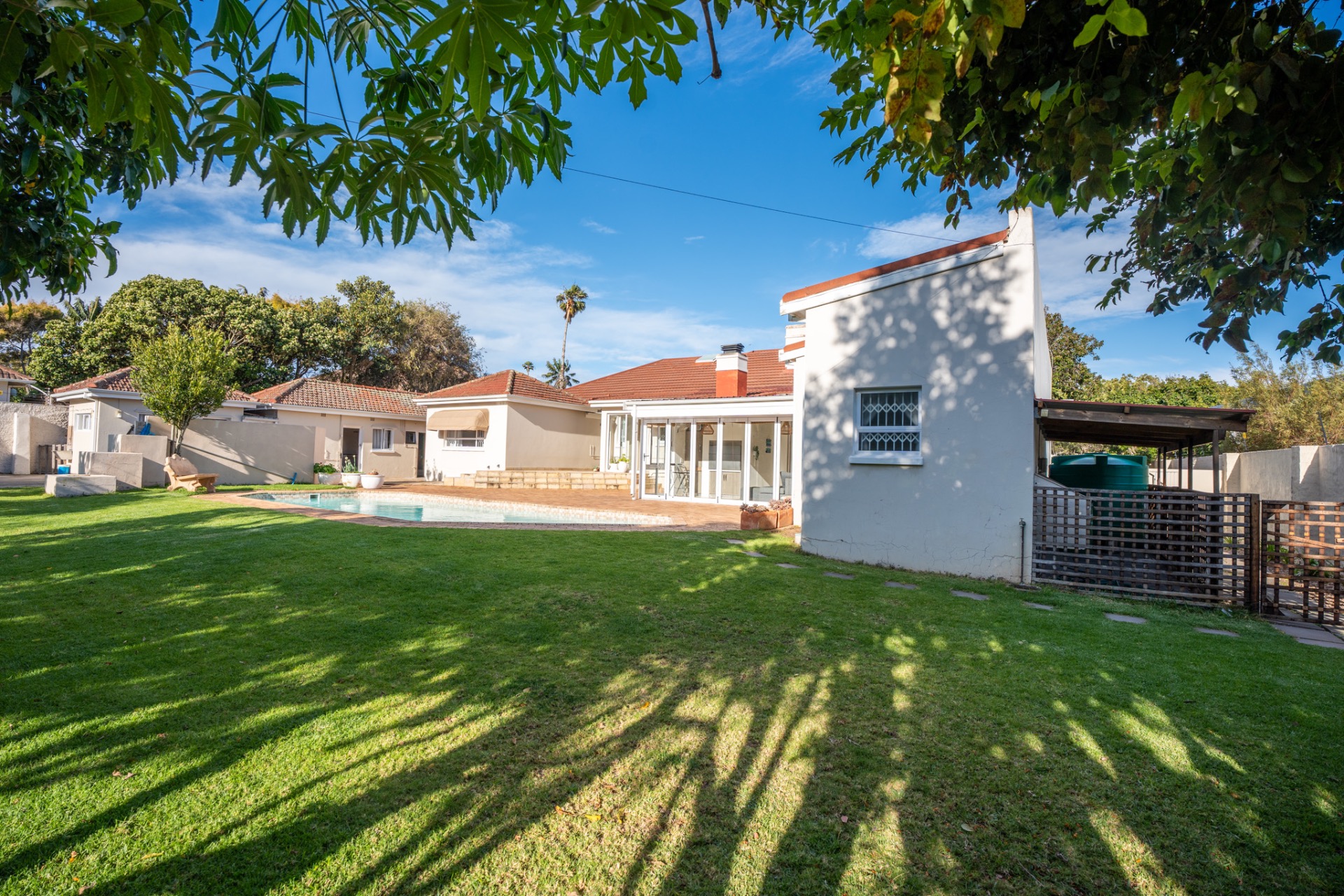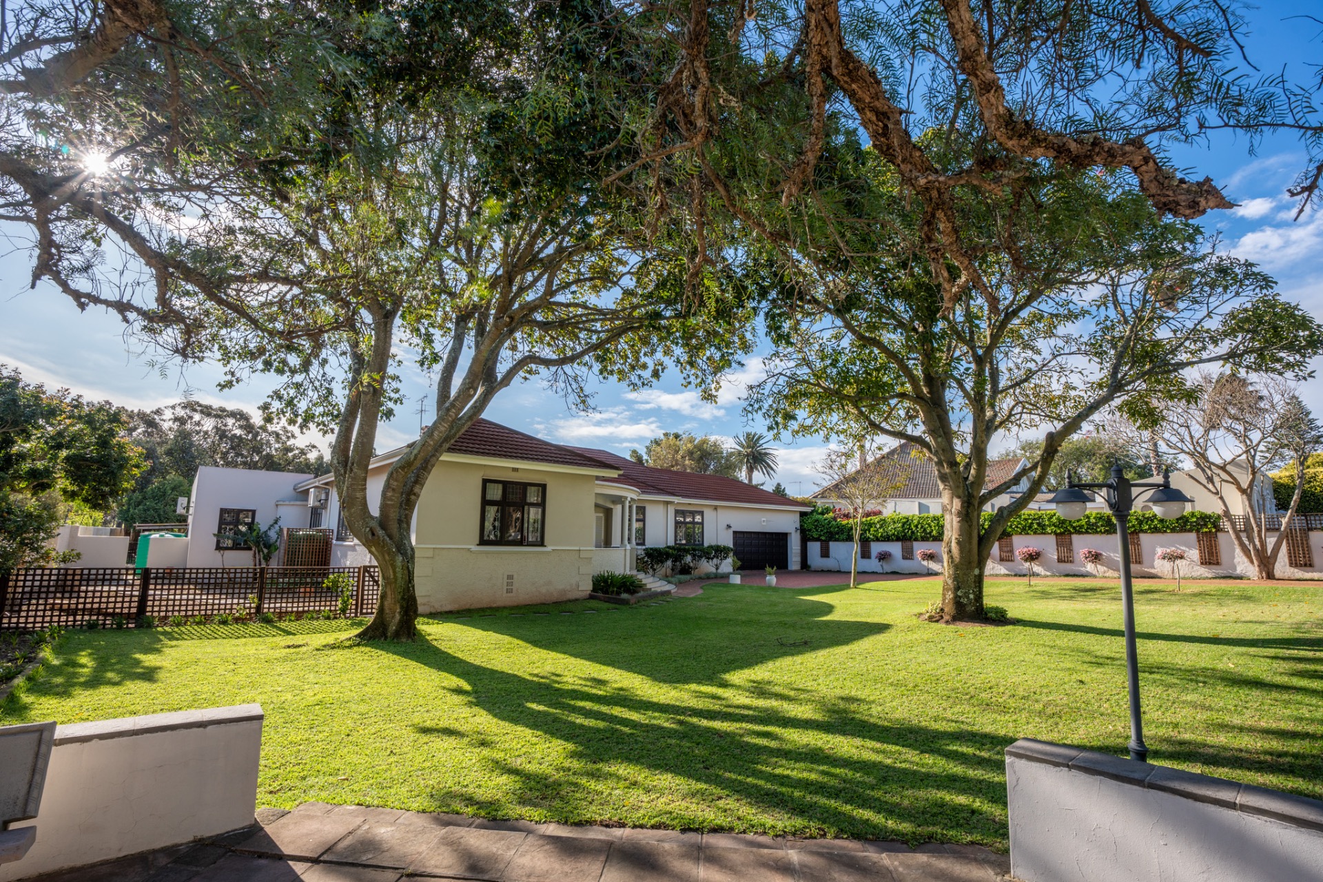 An impressive, generously proportioned Mill Park residence, with beautiful level gardens and top-quality finishes throughout, this home offers a warm and welcoming blend of colonial nostalgia and quality, with an easy flow from the entrance hall to living areas. The open plan lounge, TV room and dining room with a fireplace are versatile spaces that lead to the lovely kitchen with caesar stone countertops and cherry wood cabinets. The living rooms flow to the enclosed braai area with stacker doors that lead to a beautiful pool and immaculate, indigenous garden.