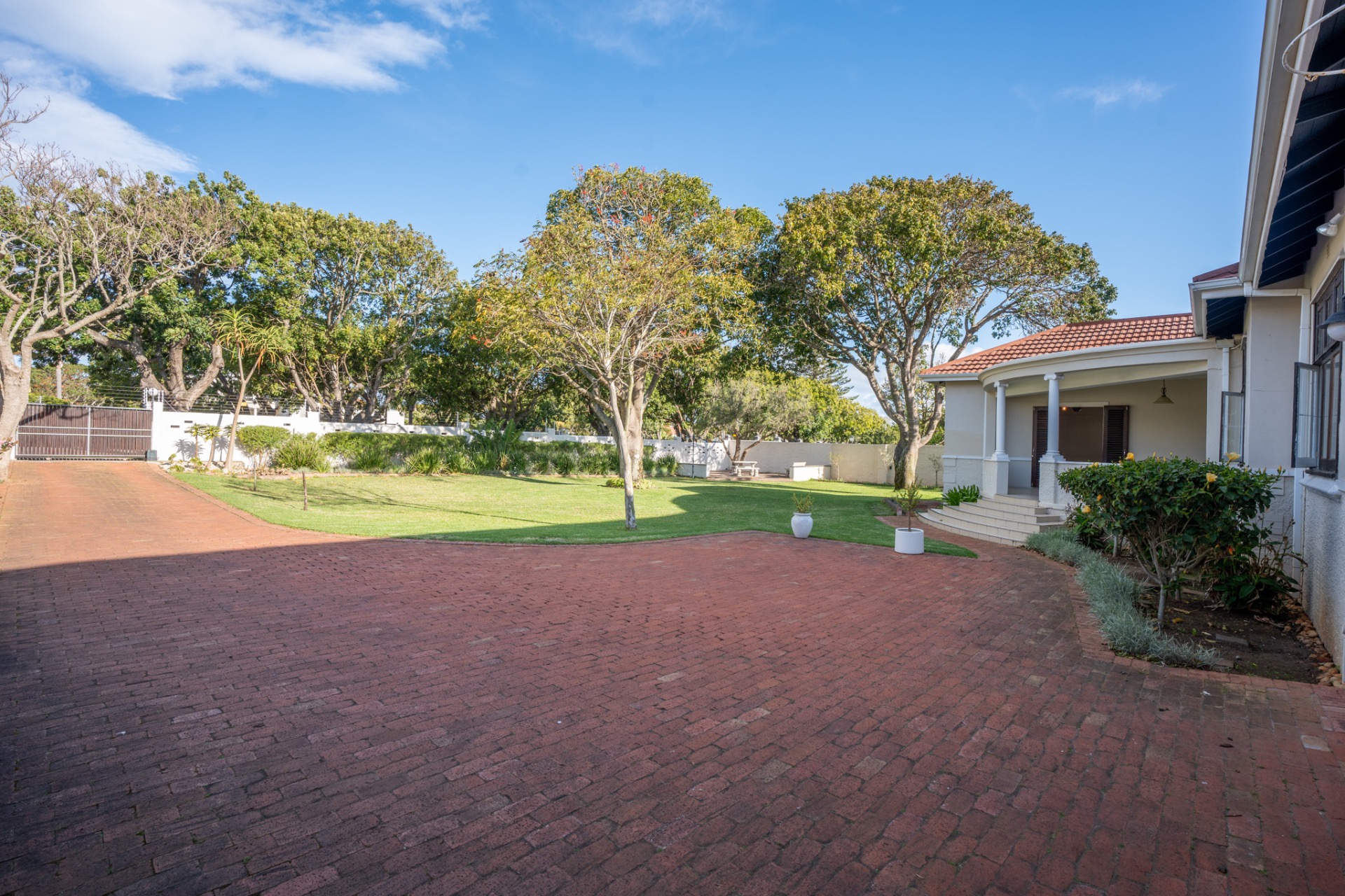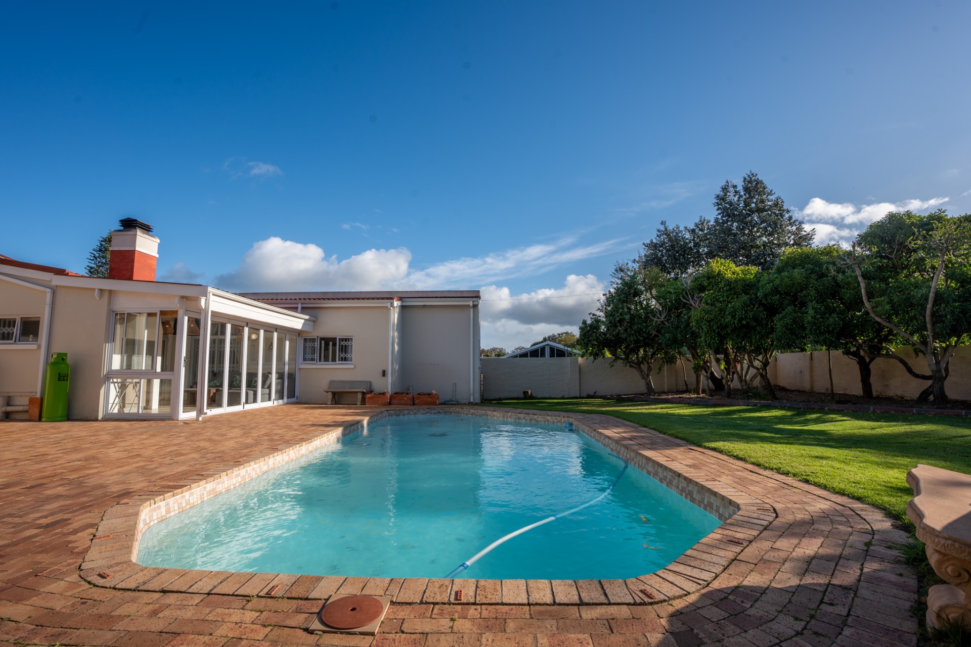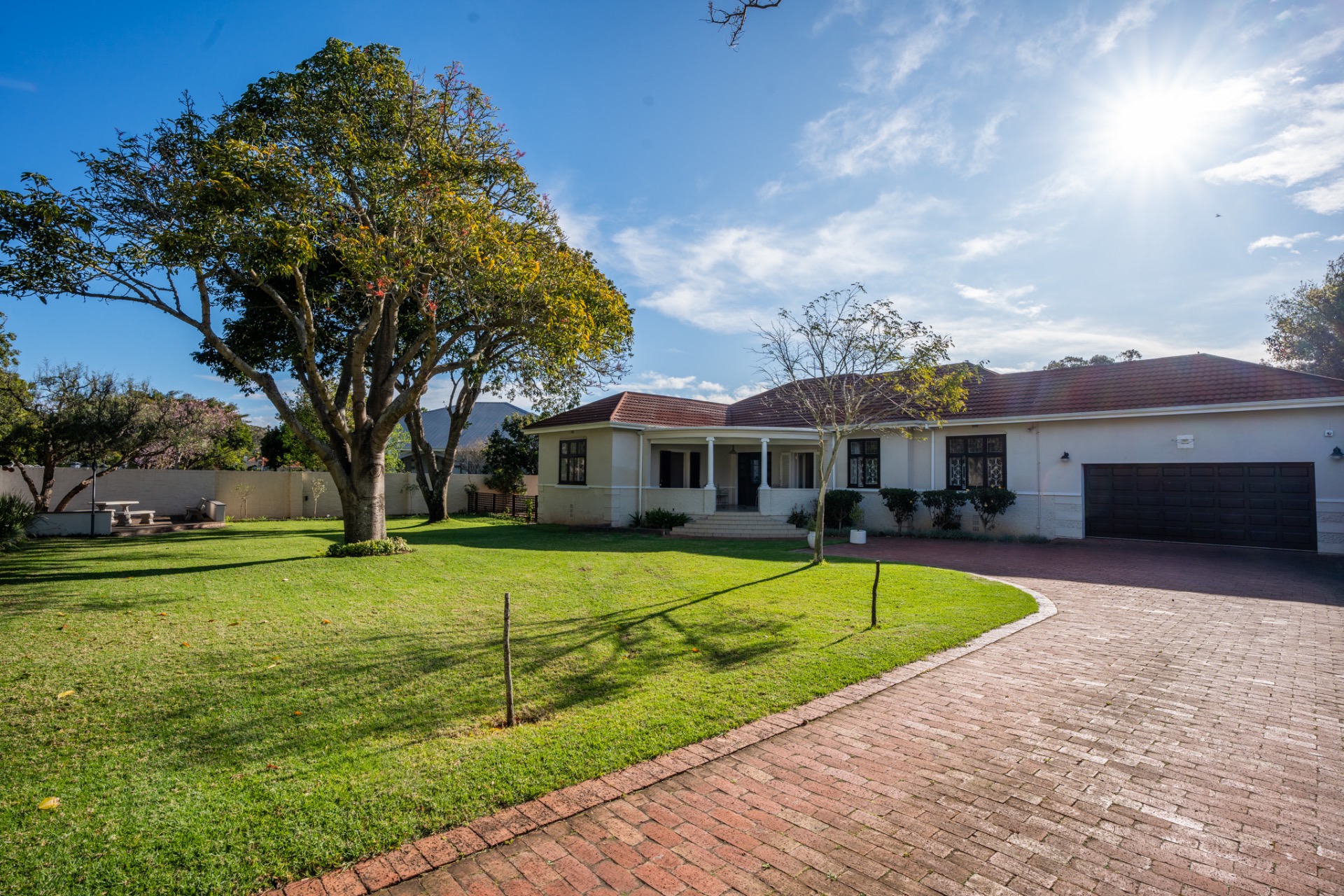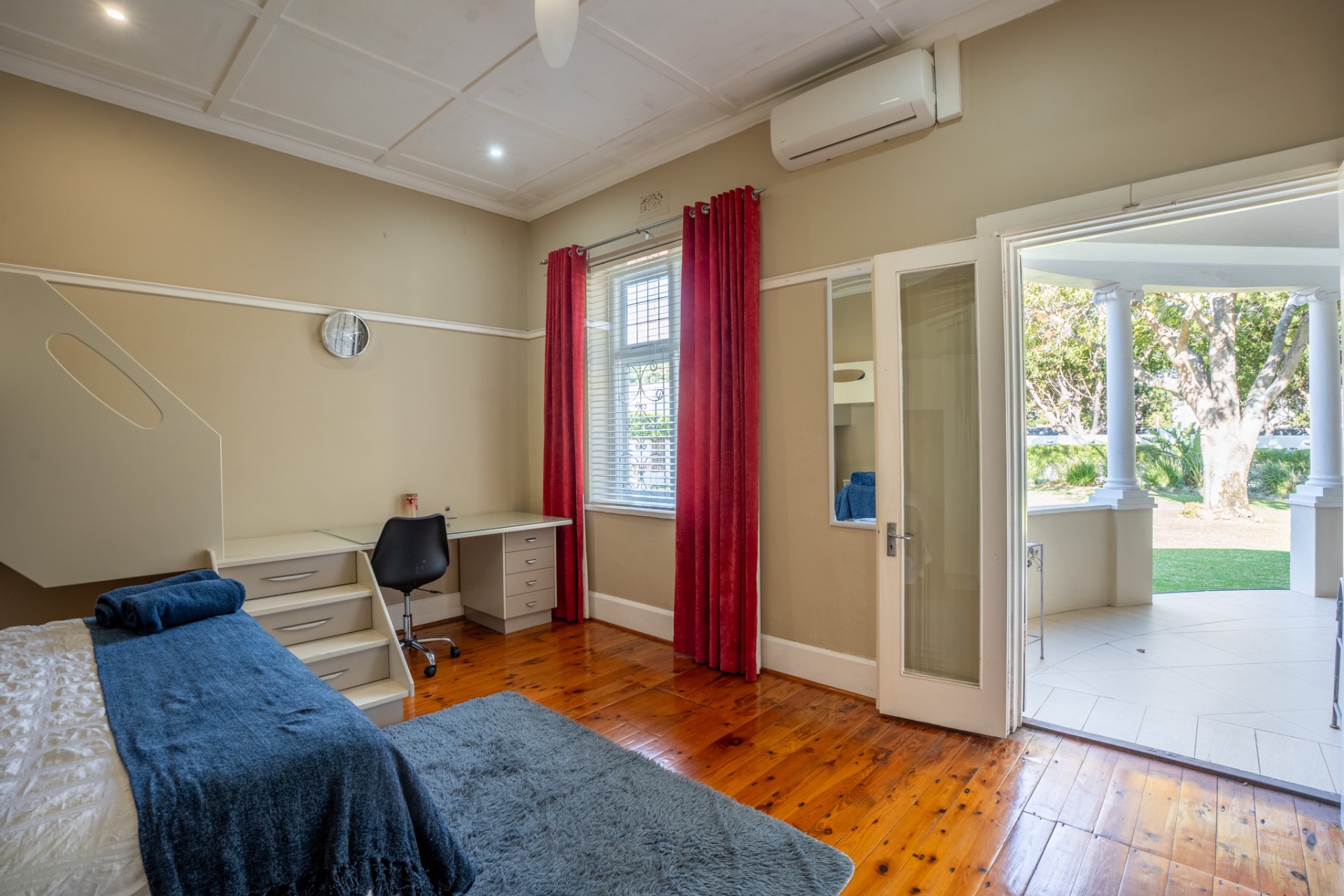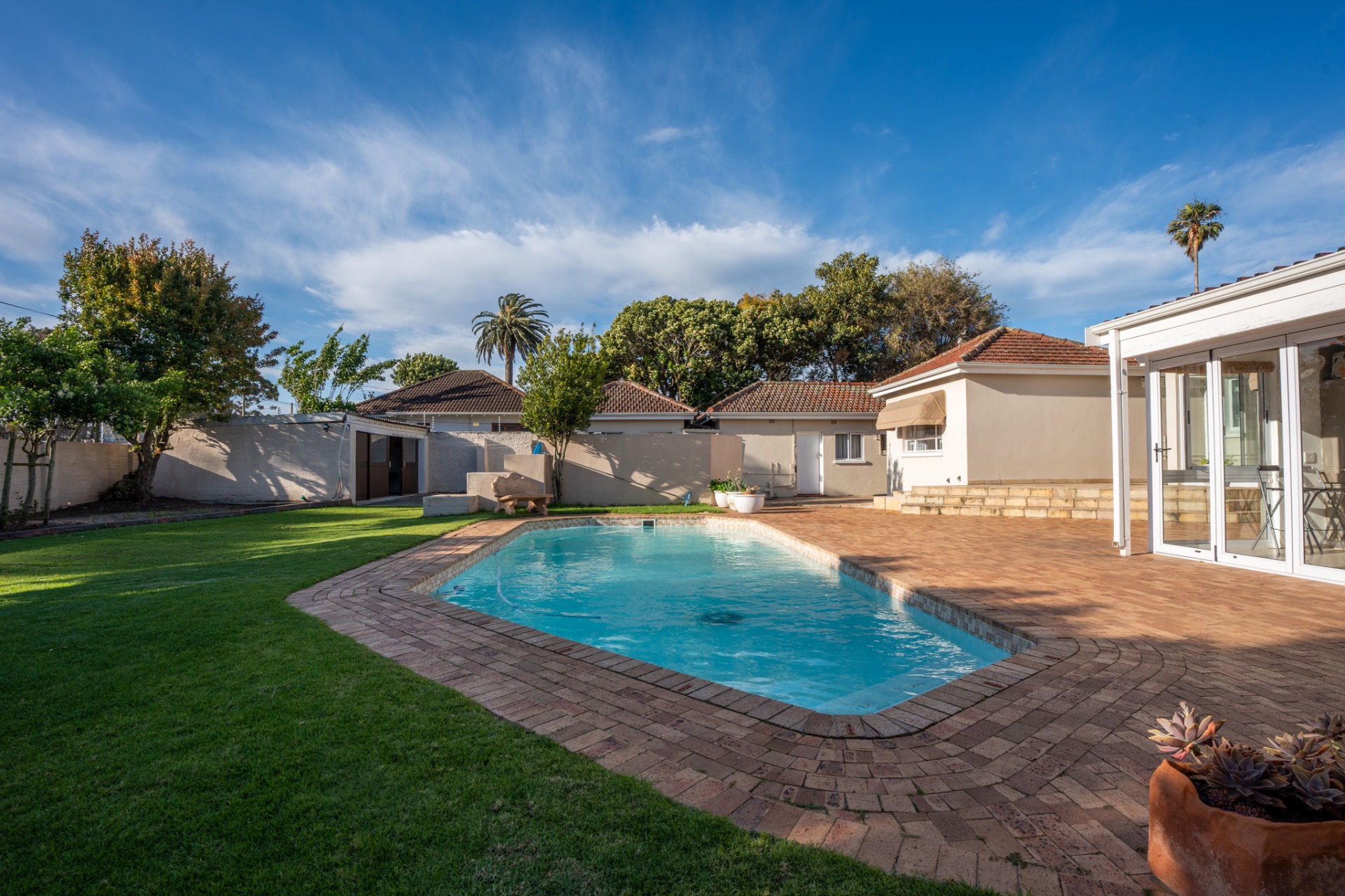 An impressive, generously proportioned Mill Park residence, with beautiful level gardens and top-quality finishes throughout, this home offers a warm and welcoming blend of colonial nostalgia and quality, with an easy flow from the entrance hall to living areas. The open plan lounge, TV room and dining room with a fireplace are versatile spaces that lead to the lovely kitchen with caesar stone countertops and cherry wood cabinets. The living rooms flow to the enclosed braai area with stacker doors that lead to a beautiful pool and immaculate, indigenous garden.