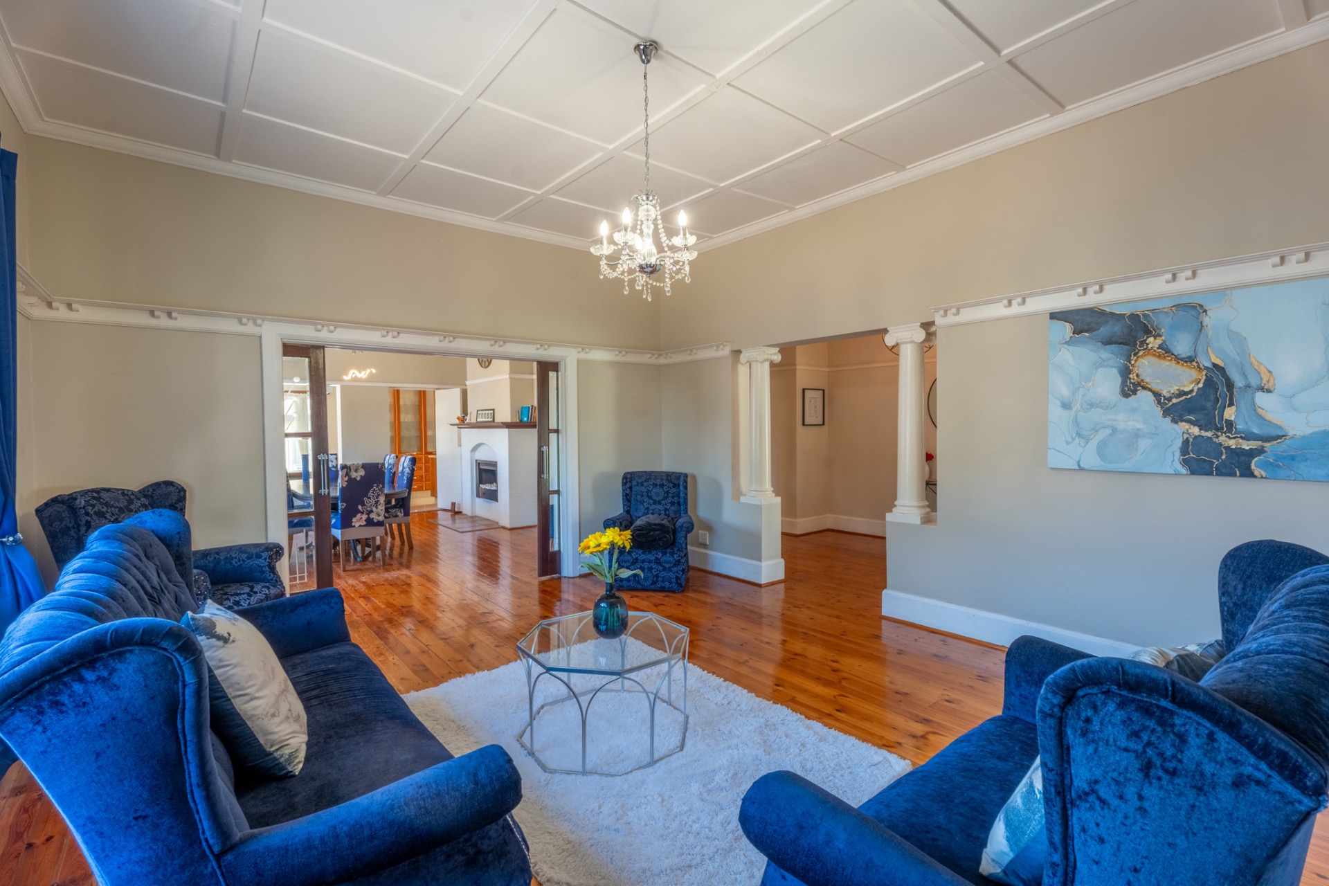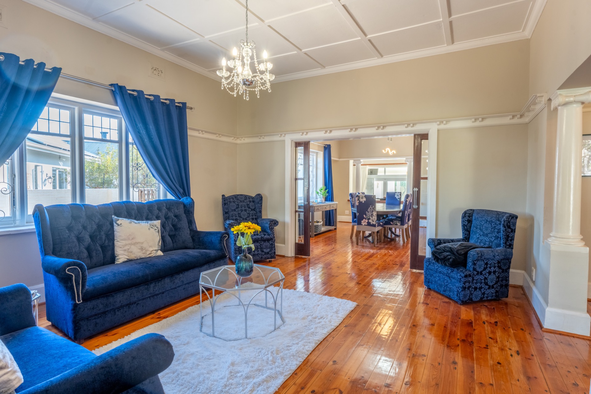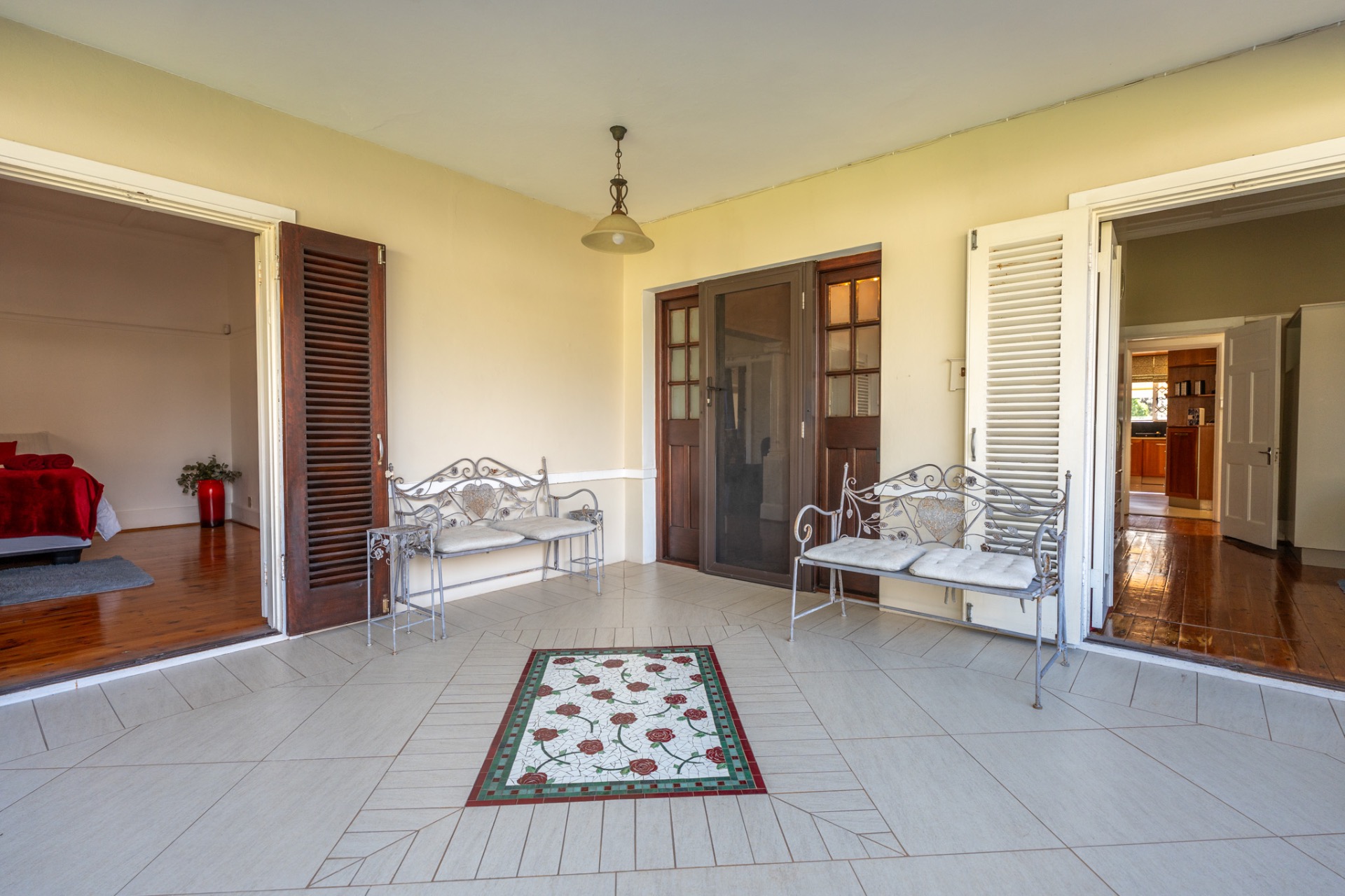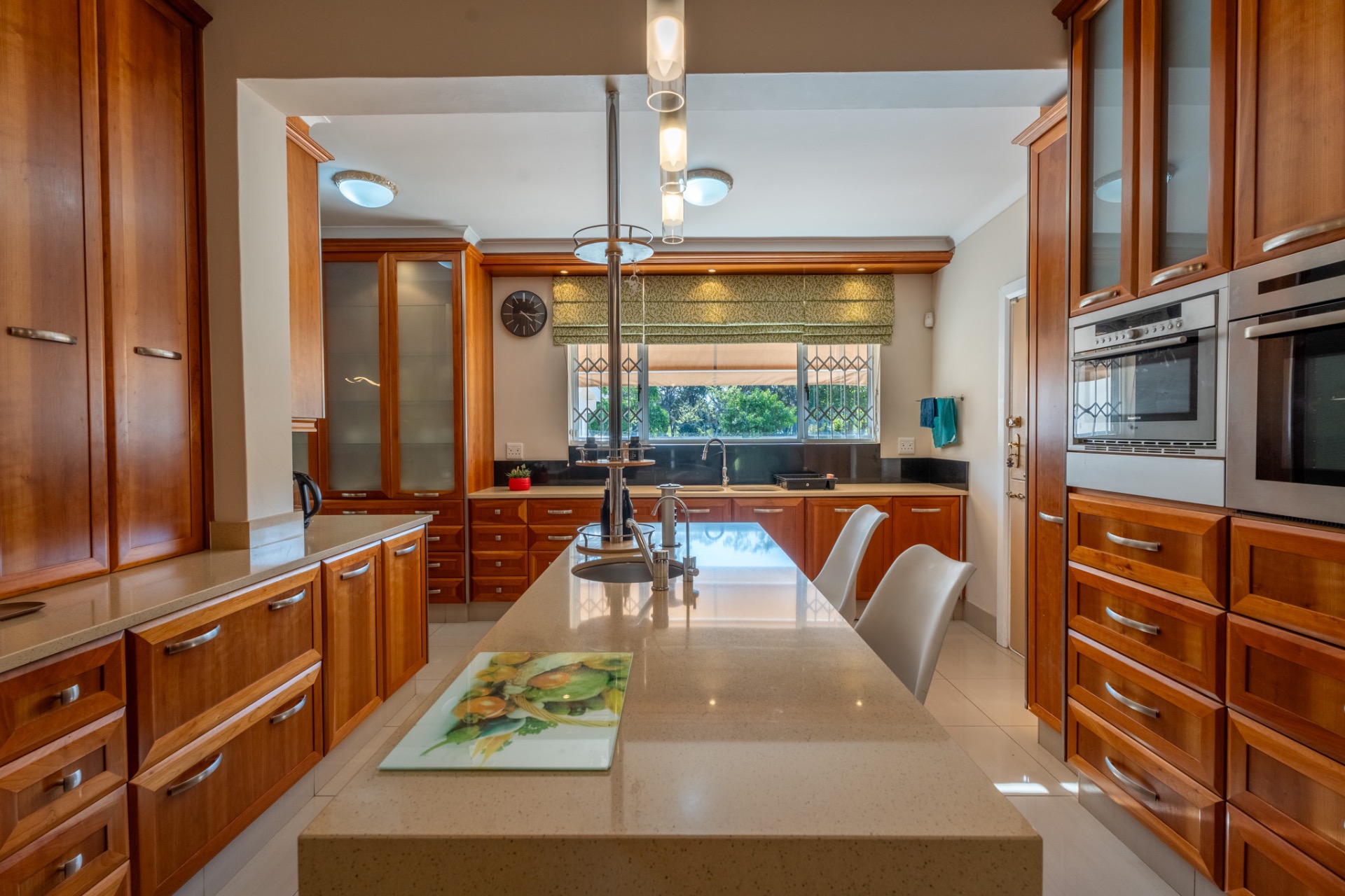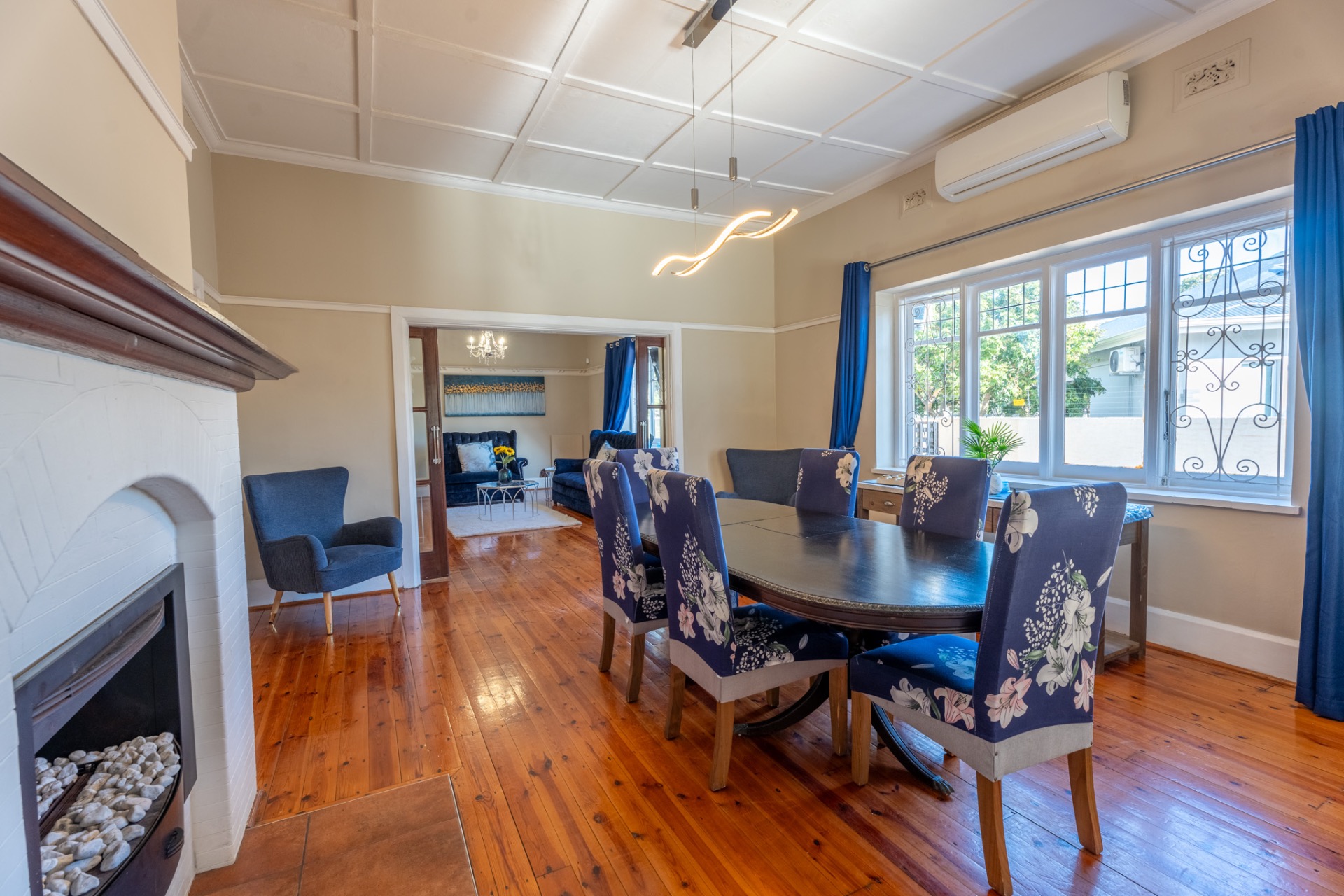 An impressive, generously proportioned Mill Park residence, with beautiful level gardens and top-quality finishes throughout, this home offers a warm and welcoming blend of colonial nostalgia and quality, with an easy flow from the entrance hall to living areas. The open plan lounge, TV room and dining room with a fireplace are versatile spaces that lead to the lovely kitchen with caesar stone countertops and cherry wood cabinets. The living rooms flow to the enclosed braai area with stacker doors that lead to a beautiful pool and immaculate, indigenous garden.