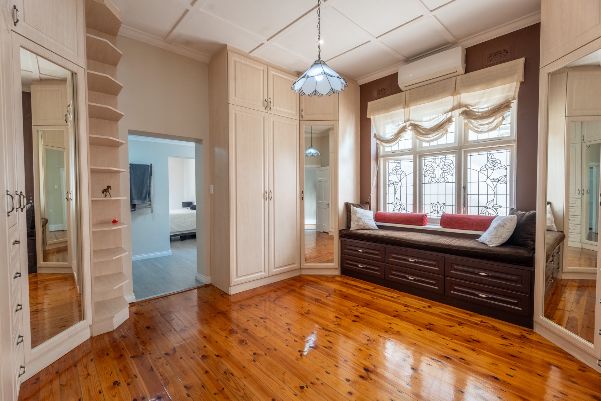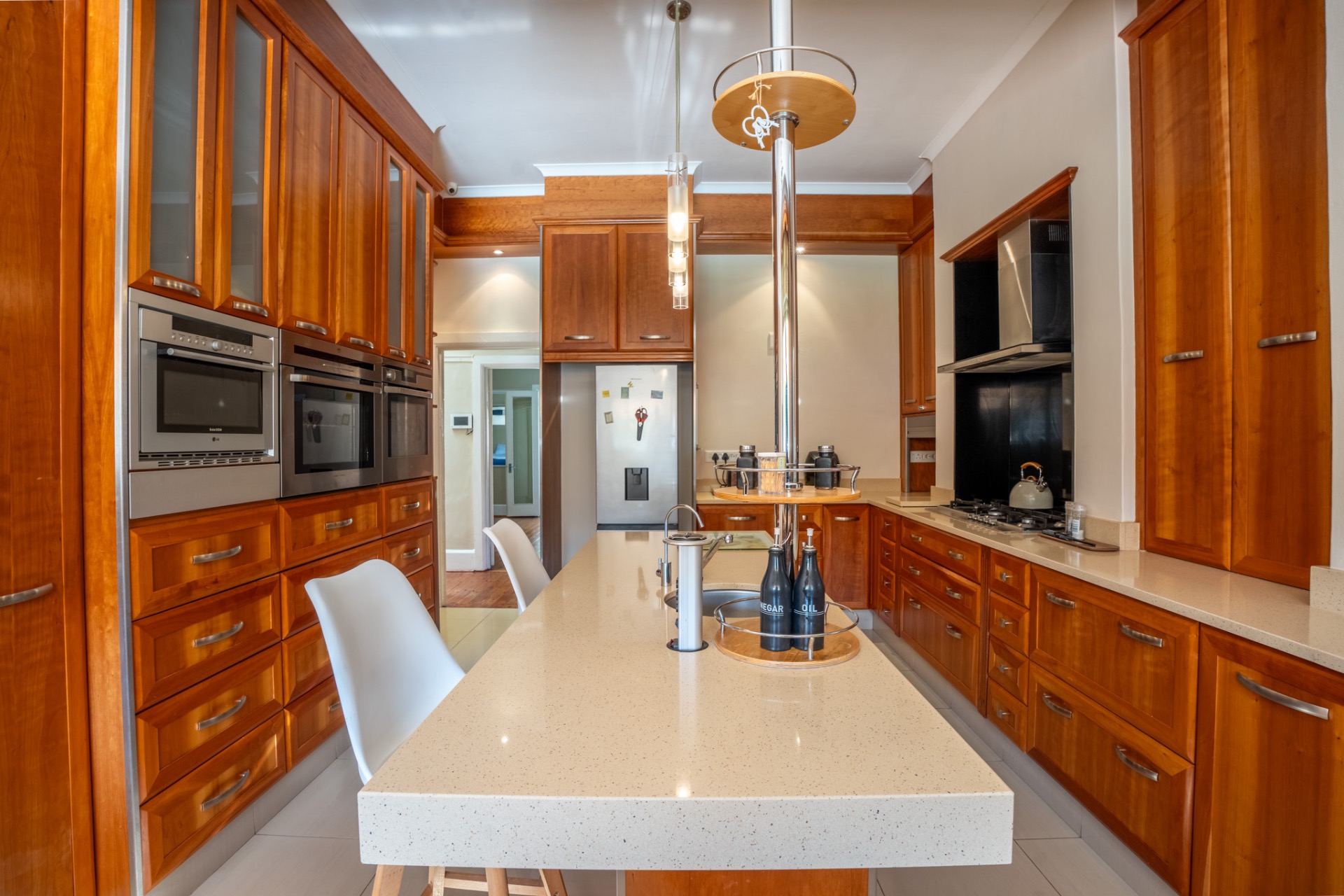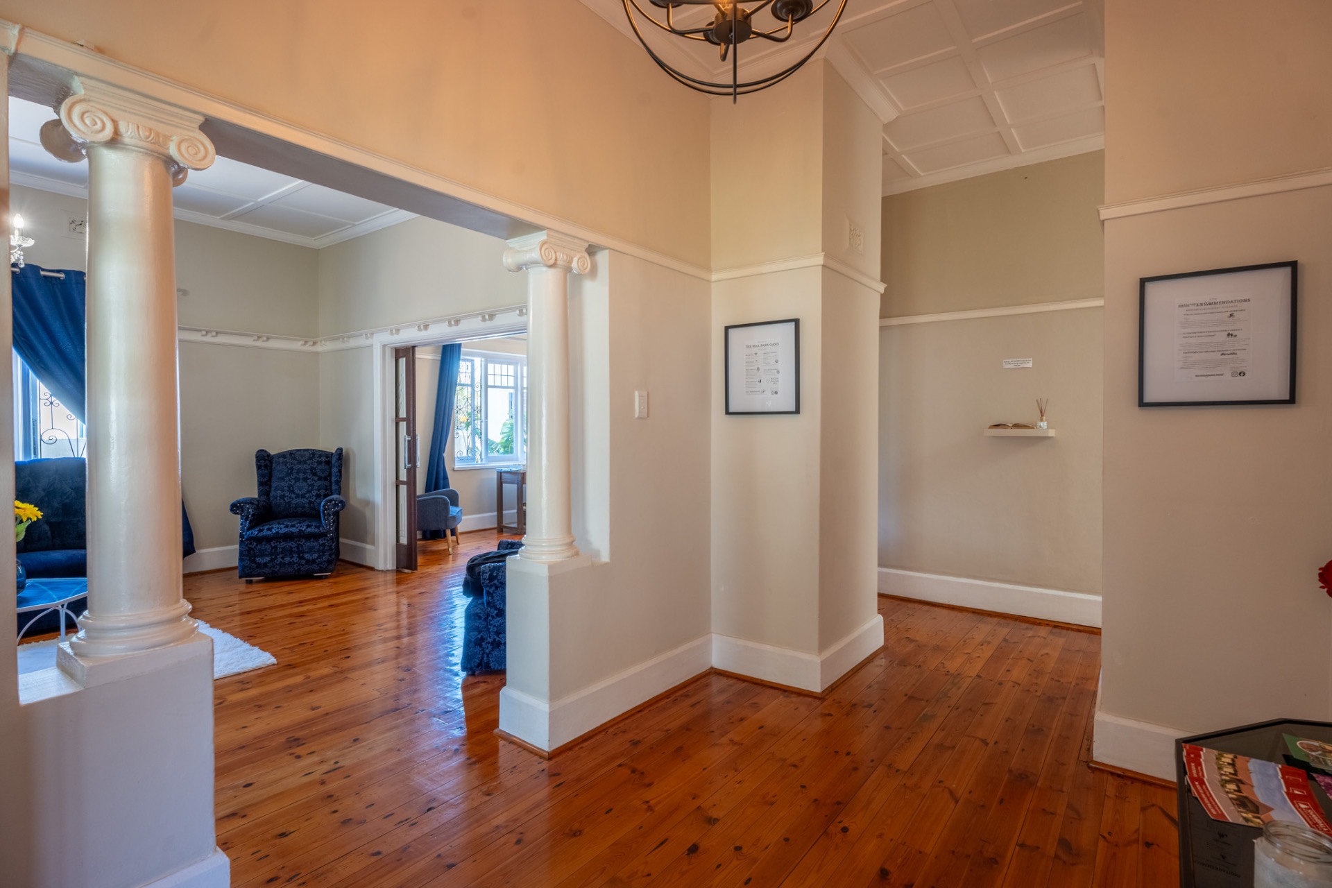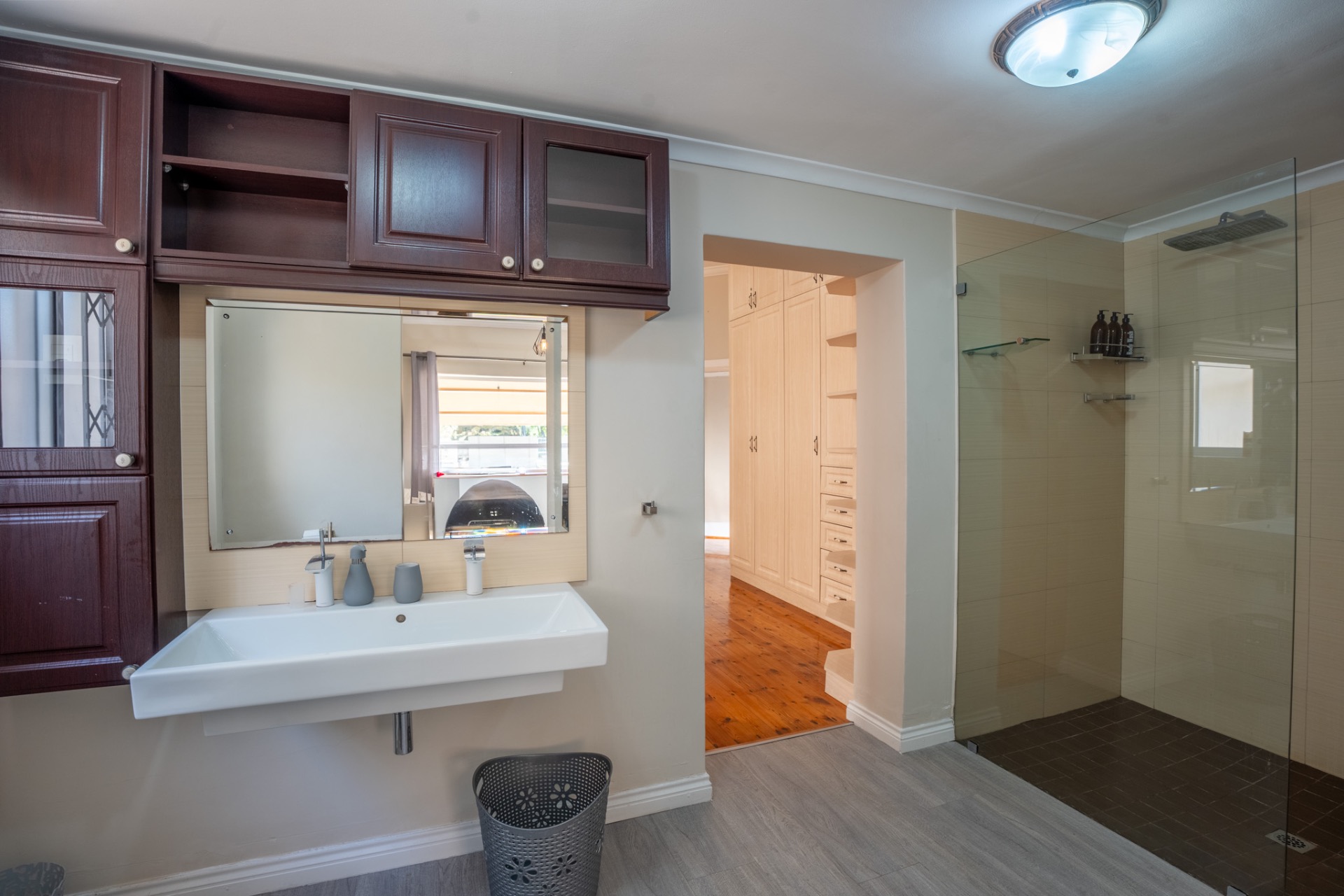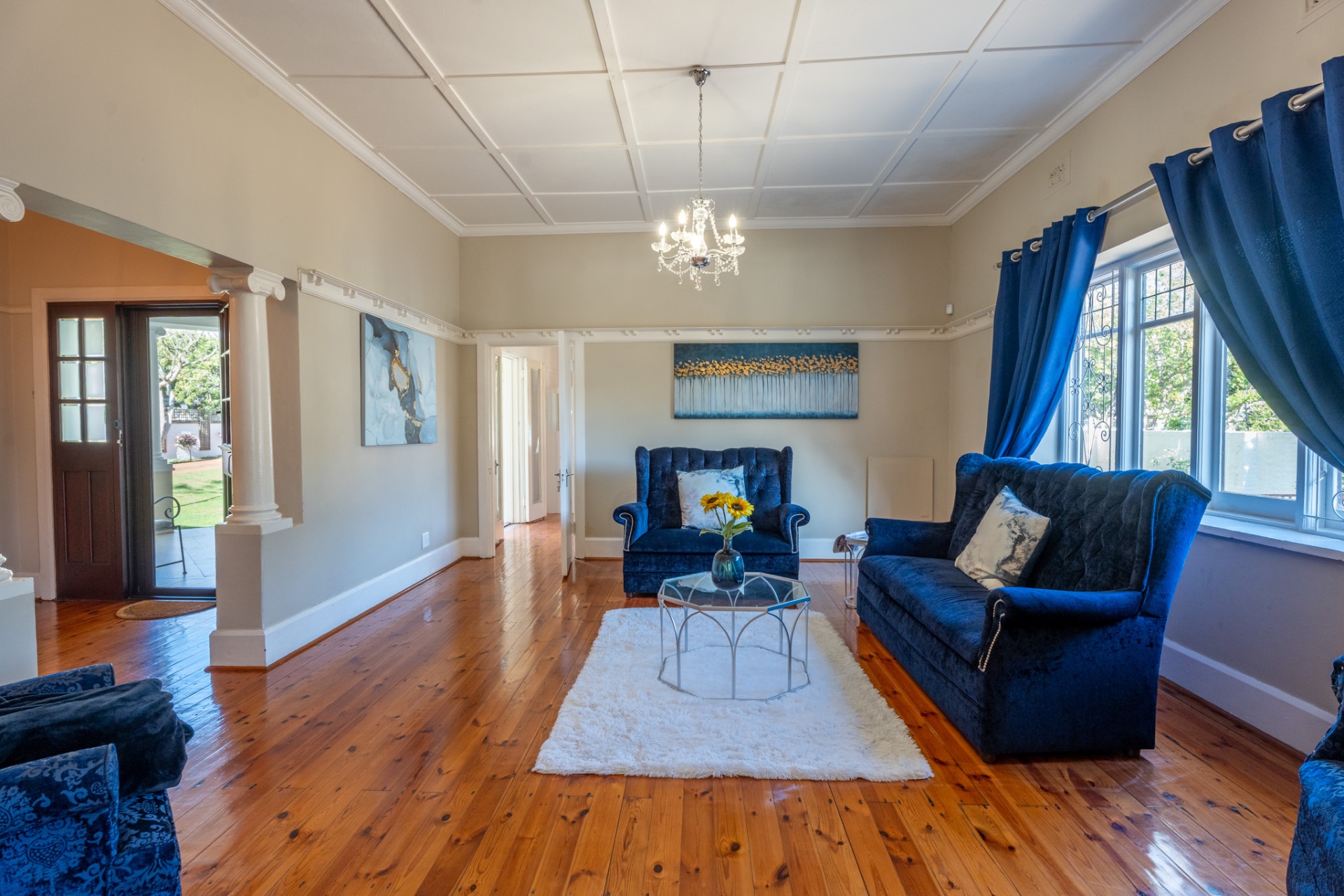 An impressive, generously proportioned Mill Park residence, with beautiful level gardens and top-quality finishes throughout, this home offers a warm and welcoming blend of colonial nostalgia and quality, with an easy flow from the entrance hall to living areas. The open plan lounge, TV room and dining room with a fireplace are versatile spaces that lead to the lovely kitchen with caesar stone countertops and cherry wood cabinets. The living rooms flow to the enclosed braai area with stacker doors that lead to a beautiful pool and immaculate, indigenous garden.