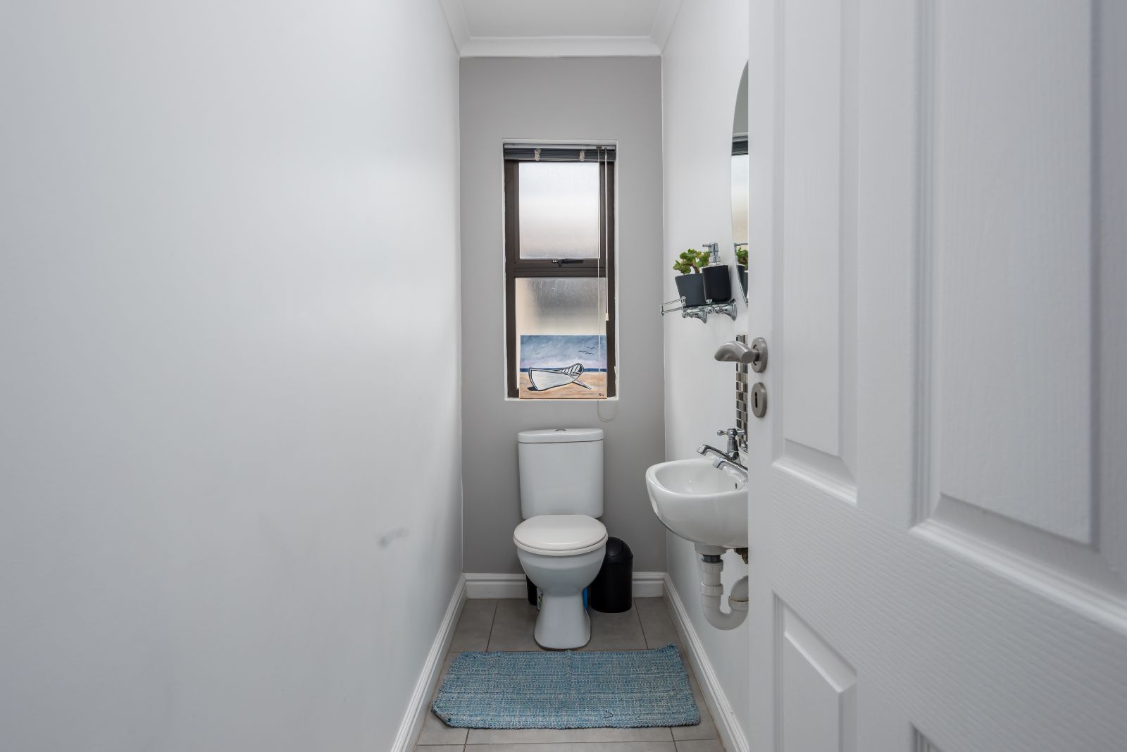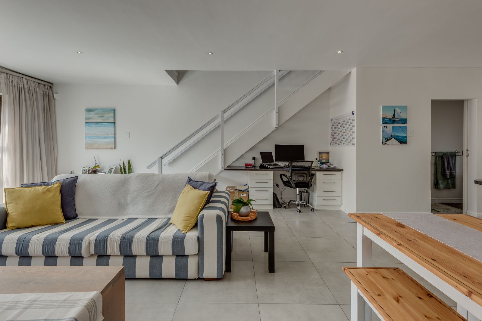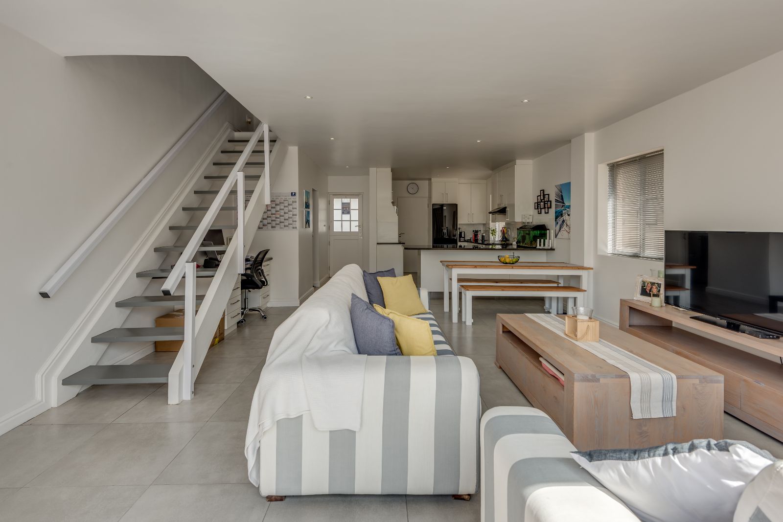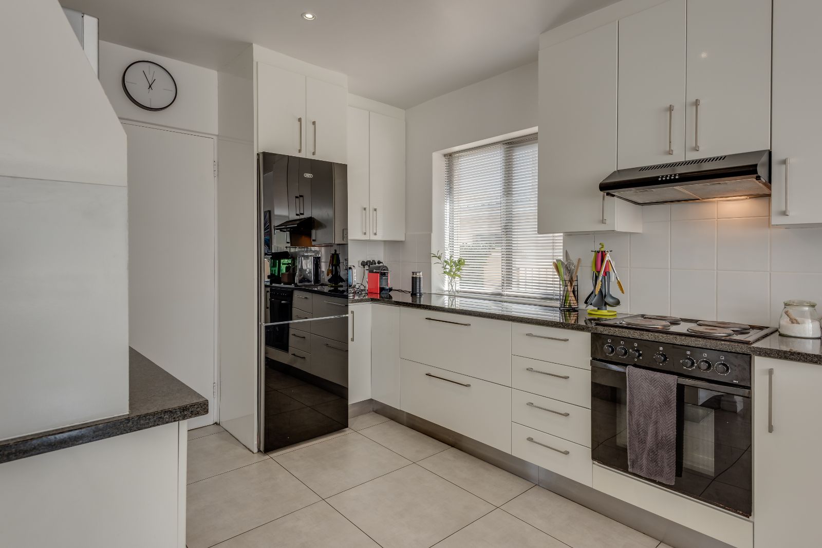 Downstairs welcomes you into a light, open-plan living space. The modern kitchen features granite countertops and a breakfast bar, making everyday living and entertaining effortless. Aluminium sliding doors lead out onto a private patio, creating a seamless indoor-outdoor flow. A guest loo and a practical work-from-home nook tucked neatly under the stairs complete this level.