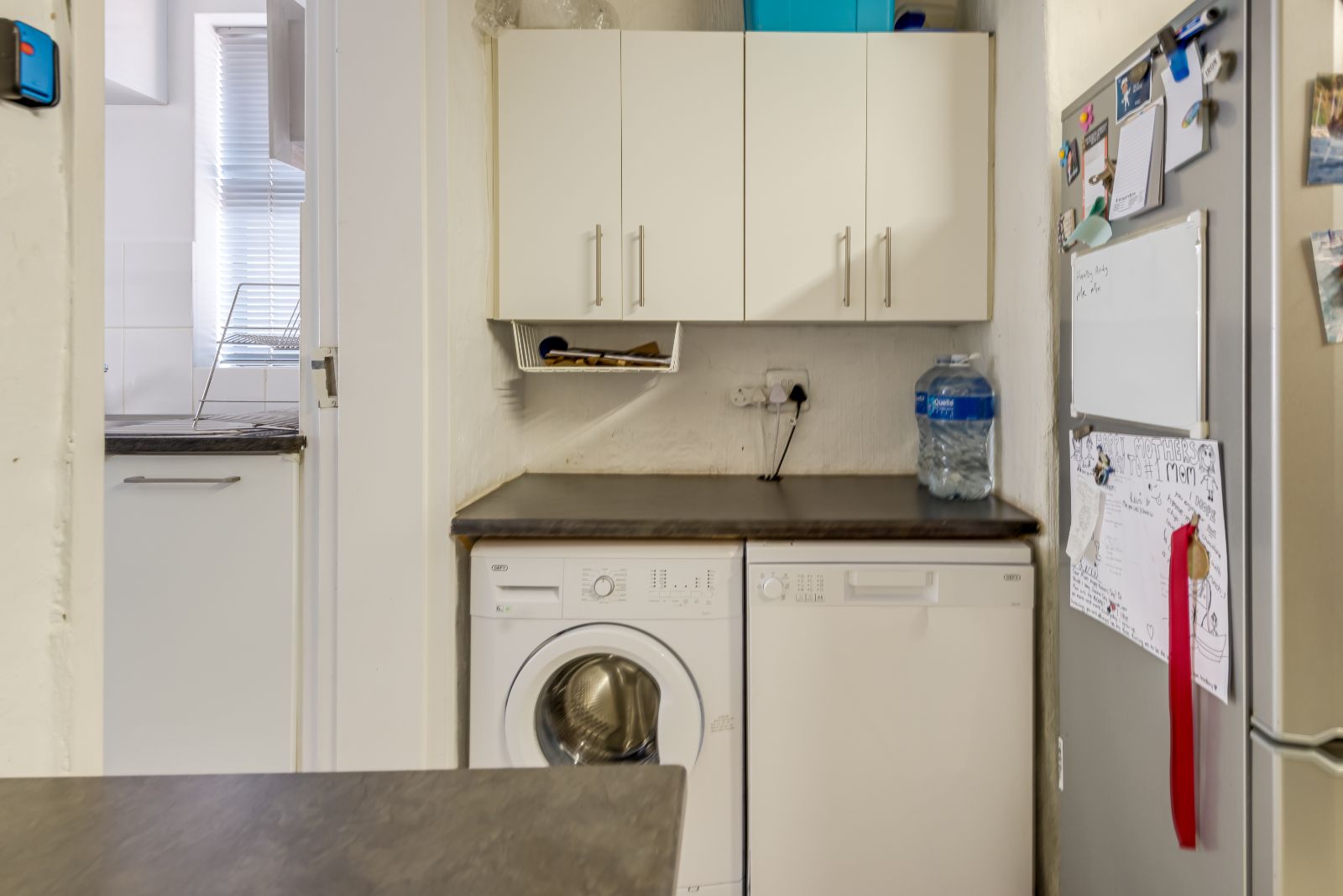 Single remote-controlled garage with built-in cupboards and plumbing for a laundry