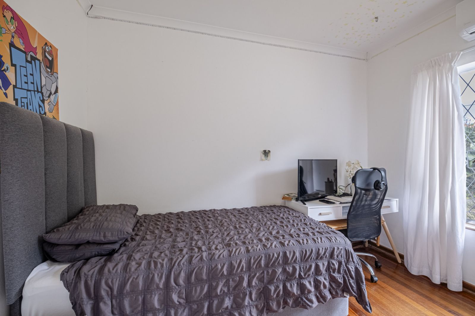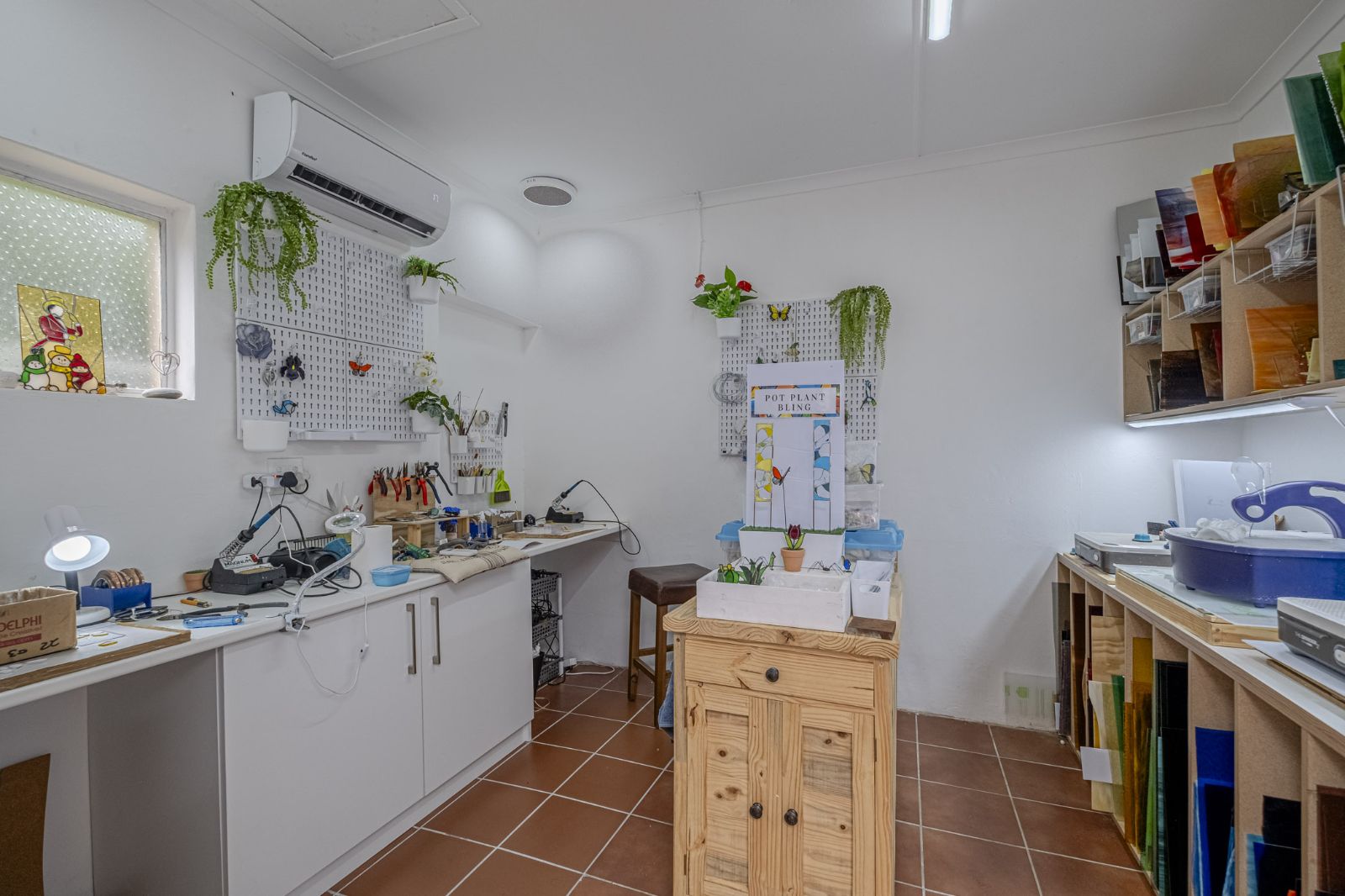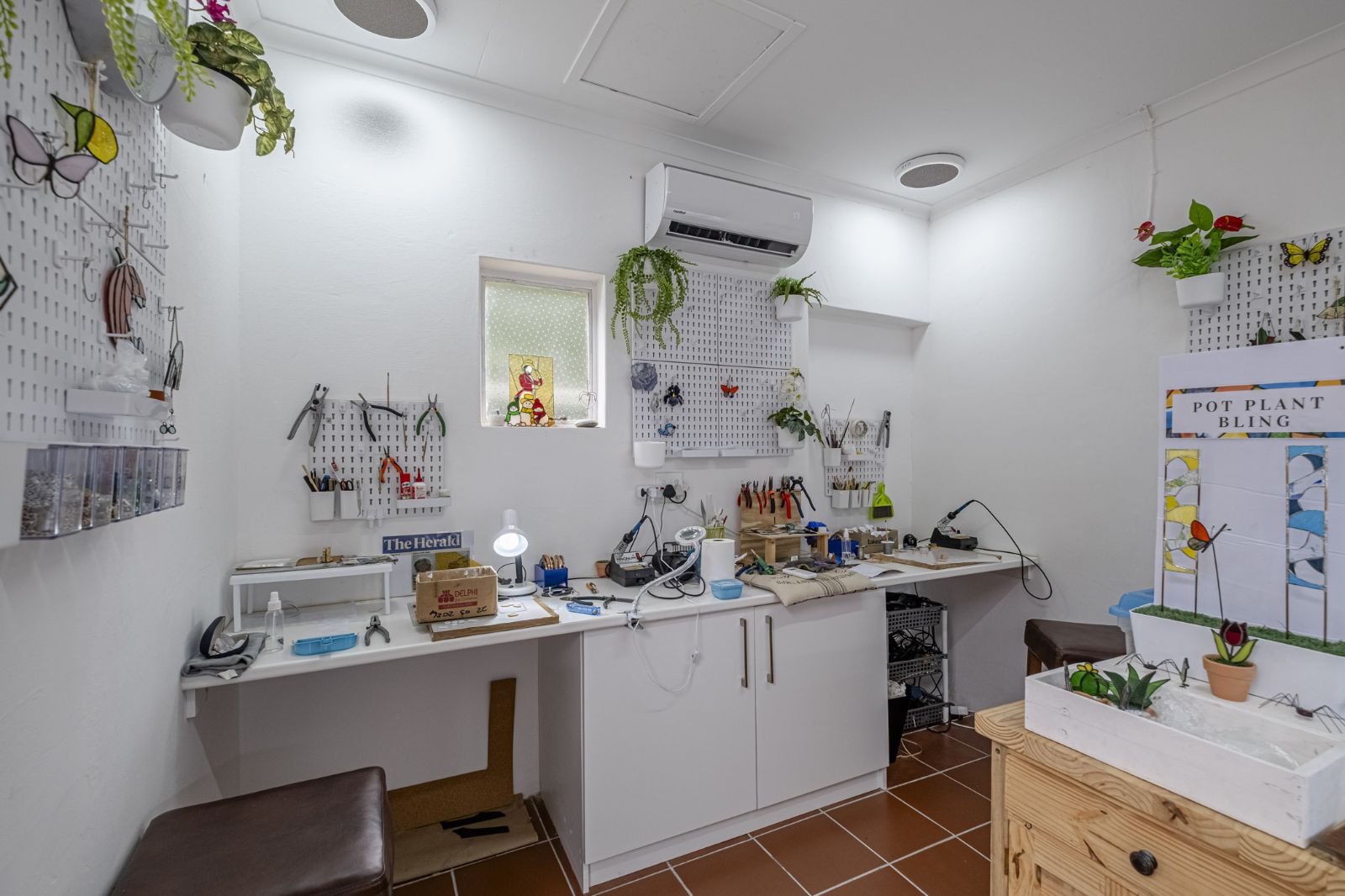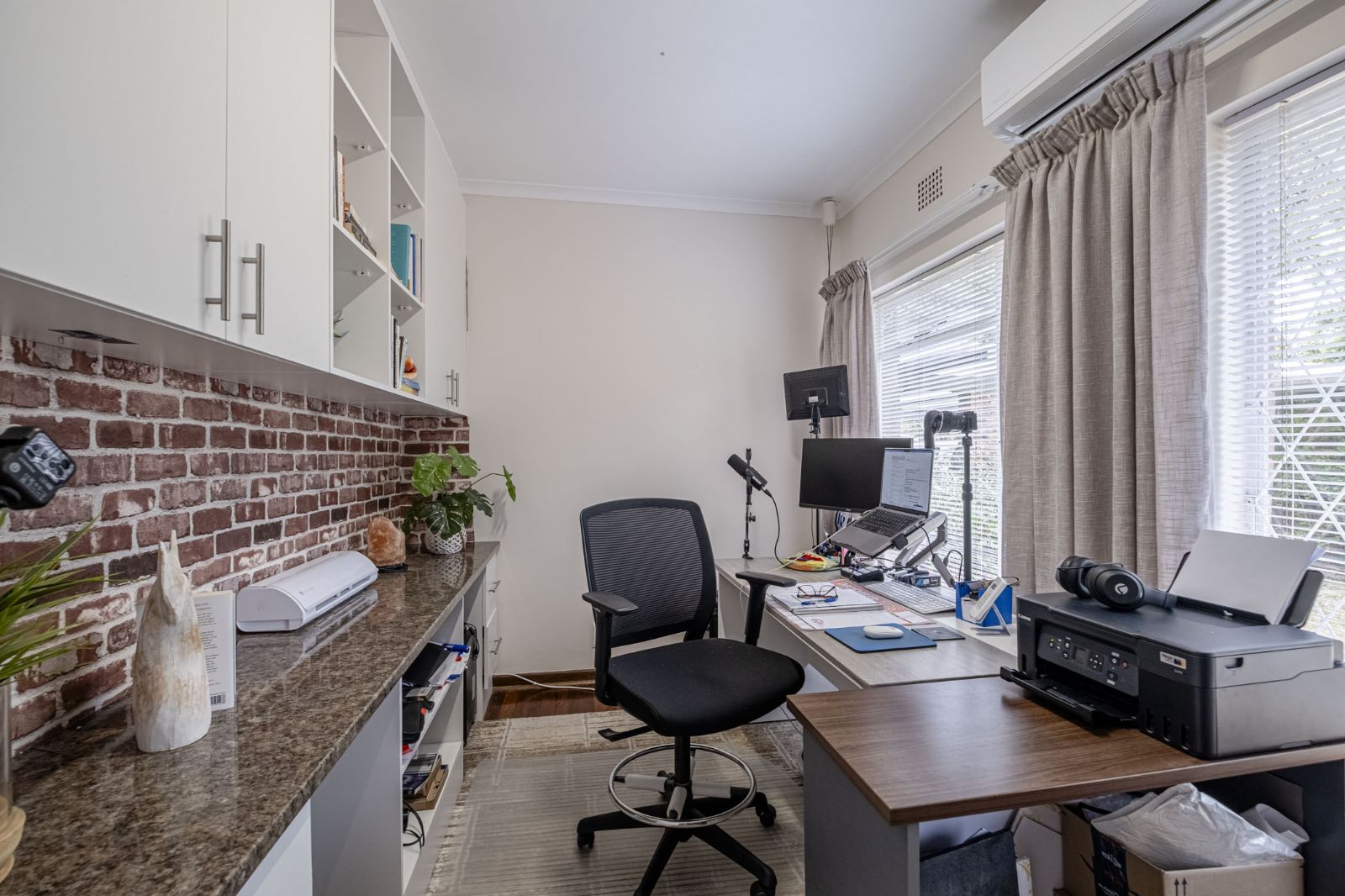 The home features three spacious bedrooms, all fitted with built-in cupboards and air-conditioning. The main bedroom includes an en-suite bathroom, while a guest bathroom services the remaining bedrooms. A dedicated office with shelving makes working from home both practical and comfortable.