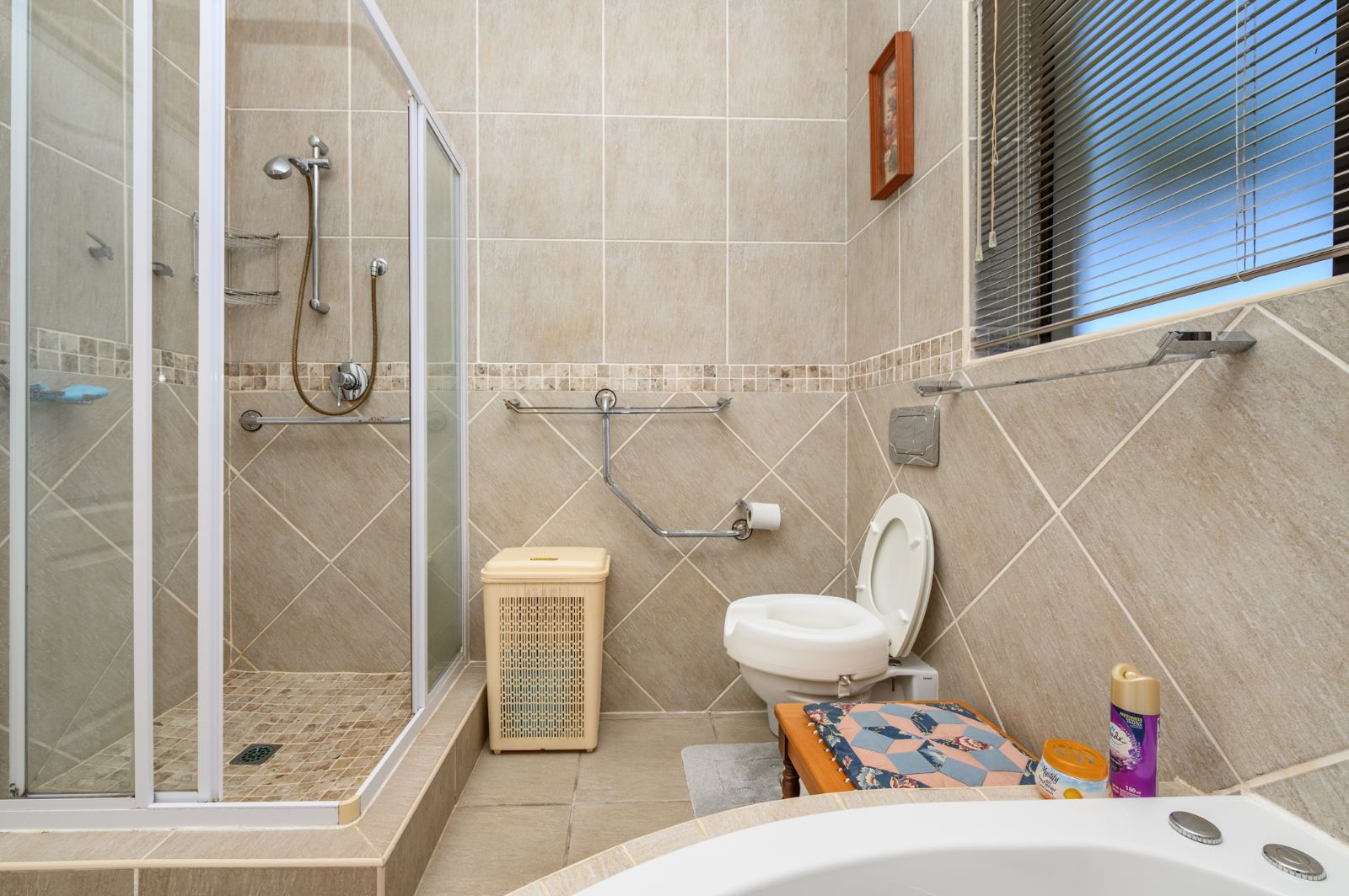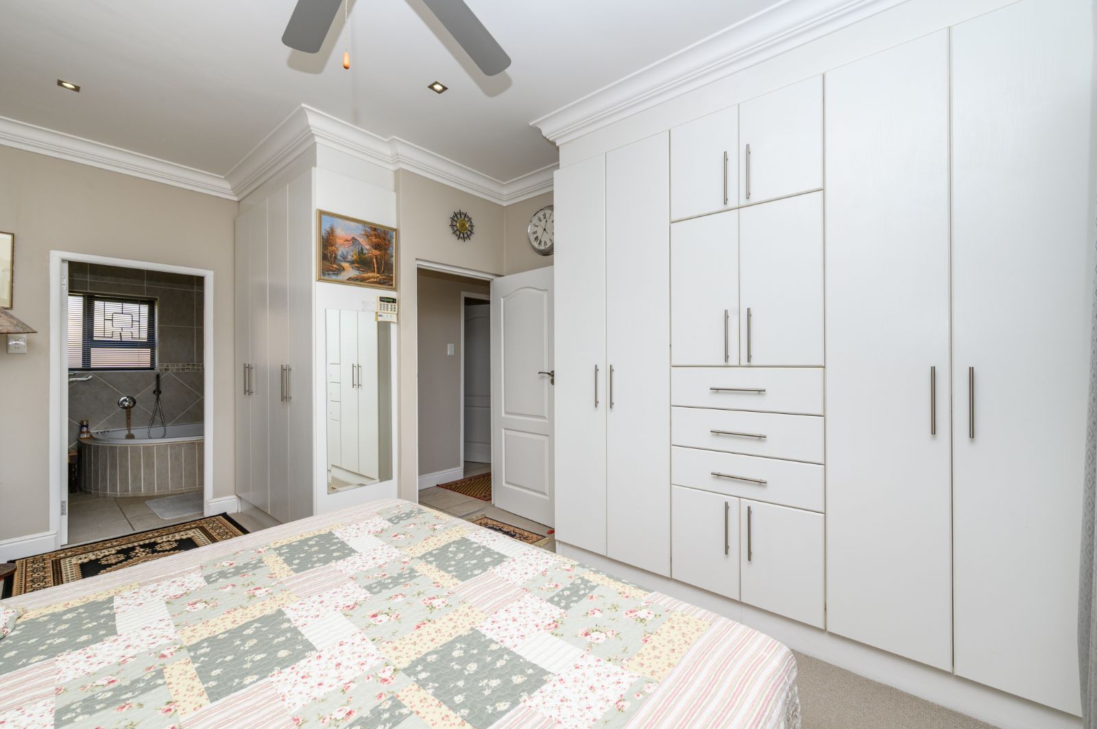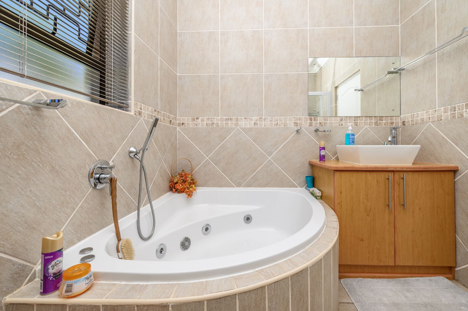 This home features three generously sized bedrooms, all fitted with plush carpets and built-in cupboards. The main bedroom and lounge include air conditioning for year-round comfort. There are two full bathrooms, both designed with luxury in mind, including a jet bath and a separate shower for a spa-like experience.