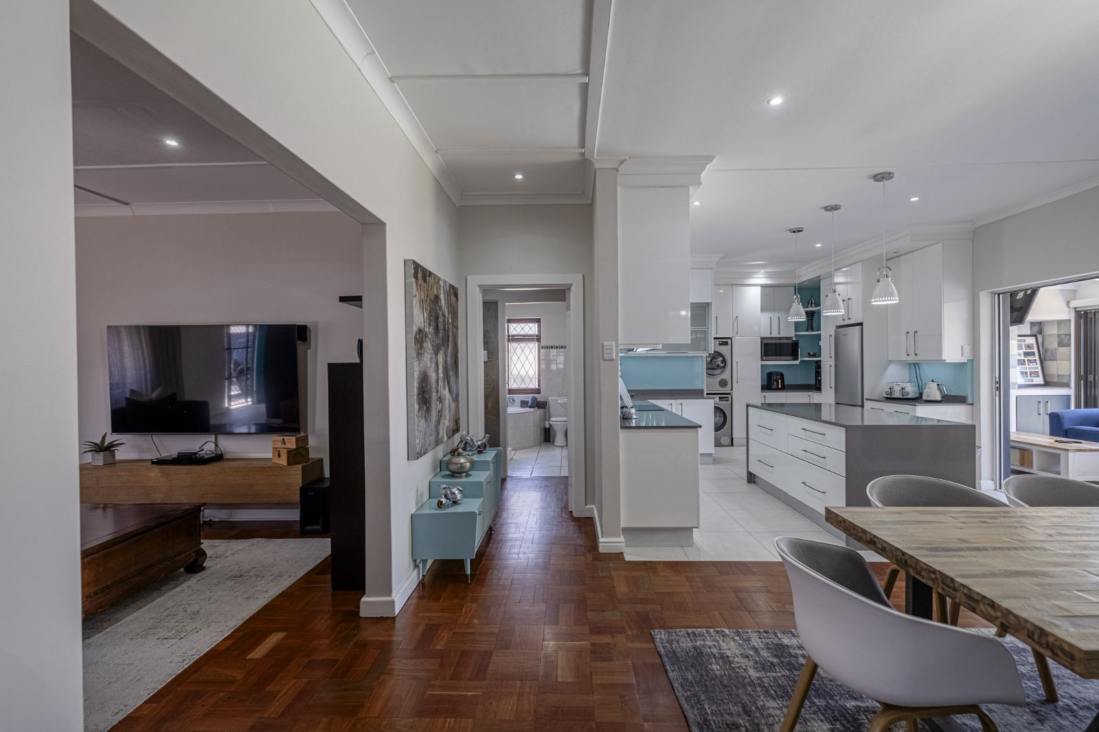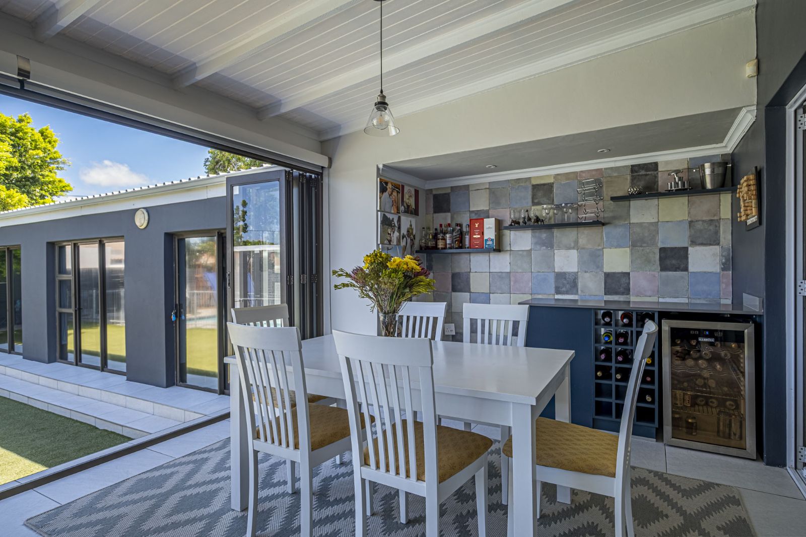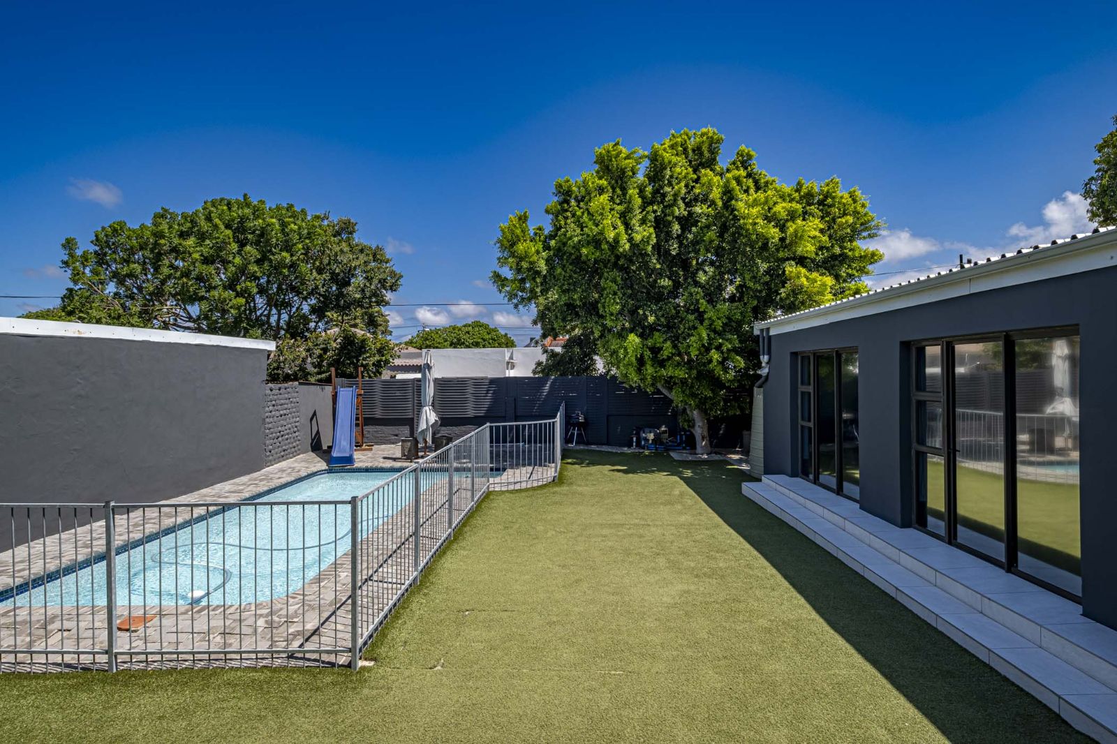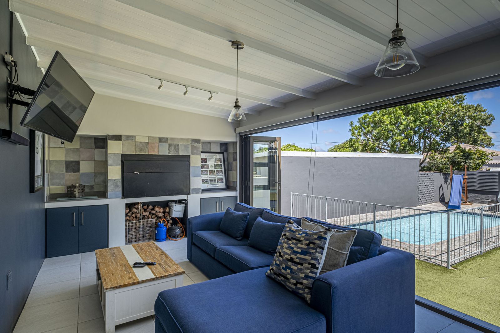 The spacious braai room is a standout, with interior fold-up aluminium doors and additional fold-up doors that open to the pool and garden, ensuring brilliant indoor-outdoor flow year-round. All three bedrooms boast solid wood wide parquet flooring and curtain rails, providing warmth and a touch of elegance. The property includes two bathrooms and a guest toilet in the main house for convenience.