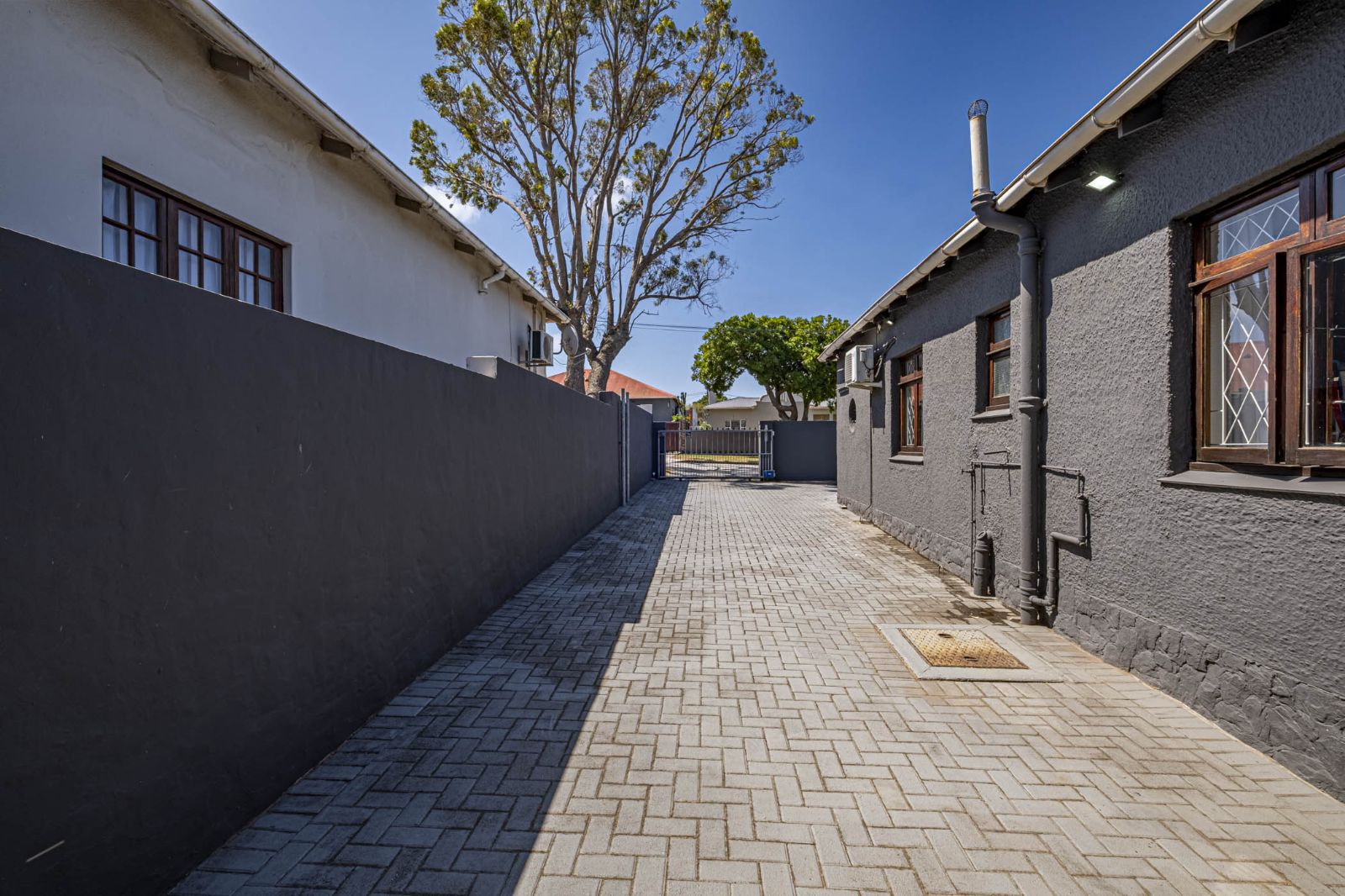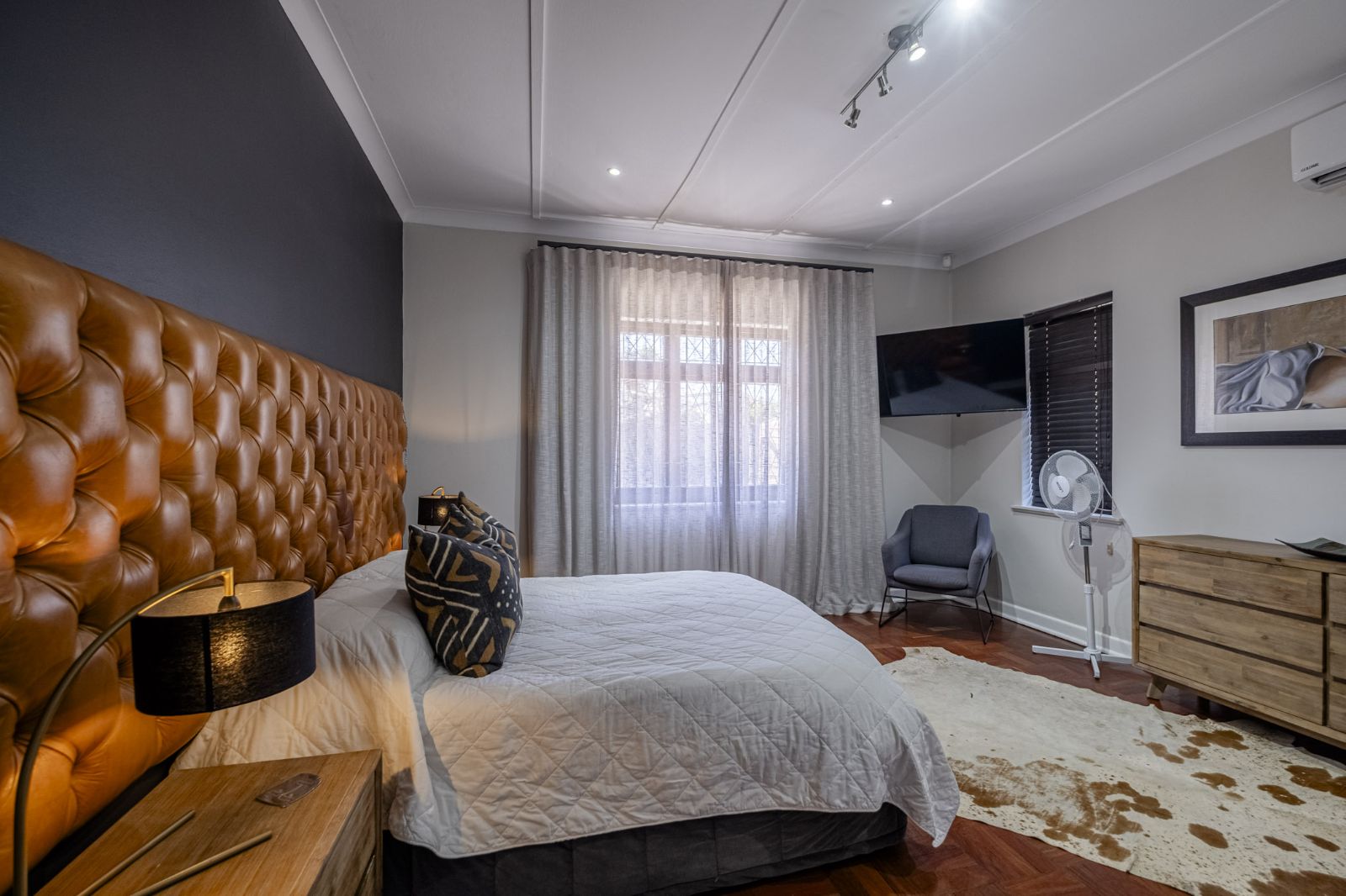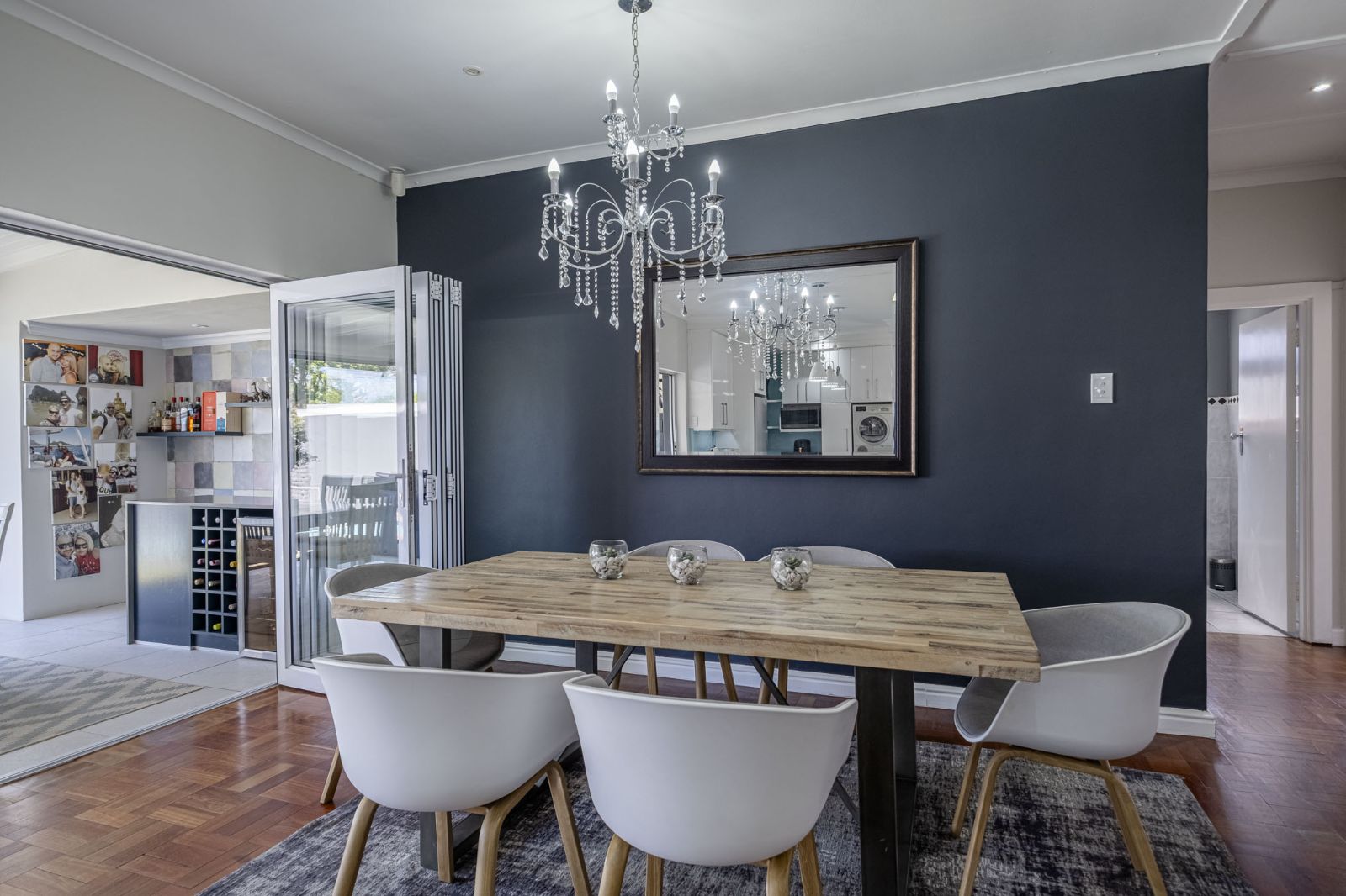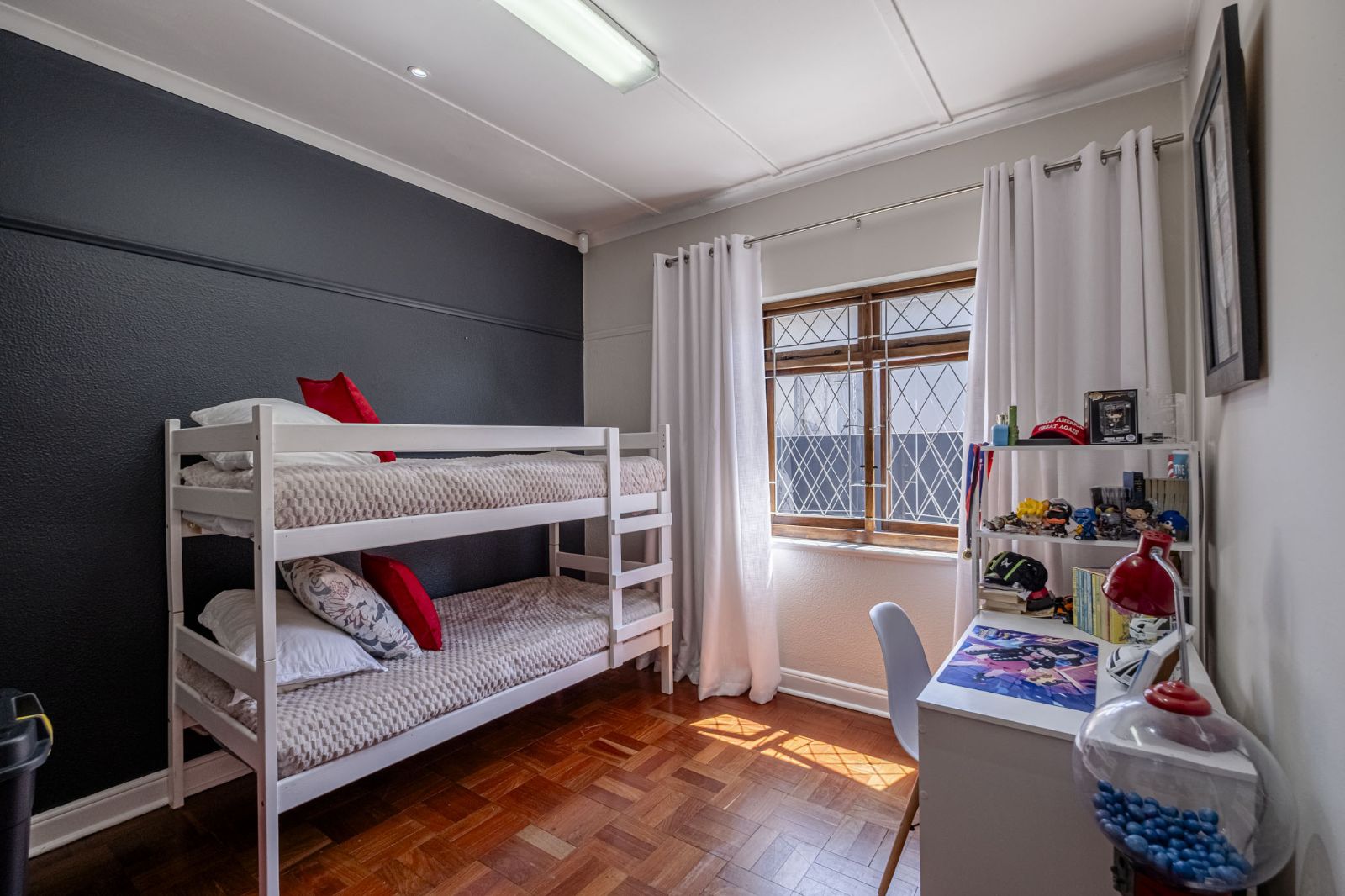 The spacious braai room is a standout, with interior fold-up aluminium doors and additional fold-up doors that open to the pool and garden, ensuring brilliant indoor-outdoor flow year-round. All three bedrooms boast solid wood wide parquet flooring and curtain rails, providing warmth and a touch of elegance. The property includes two bathrooms and a guest toilet in the main house for convenience.