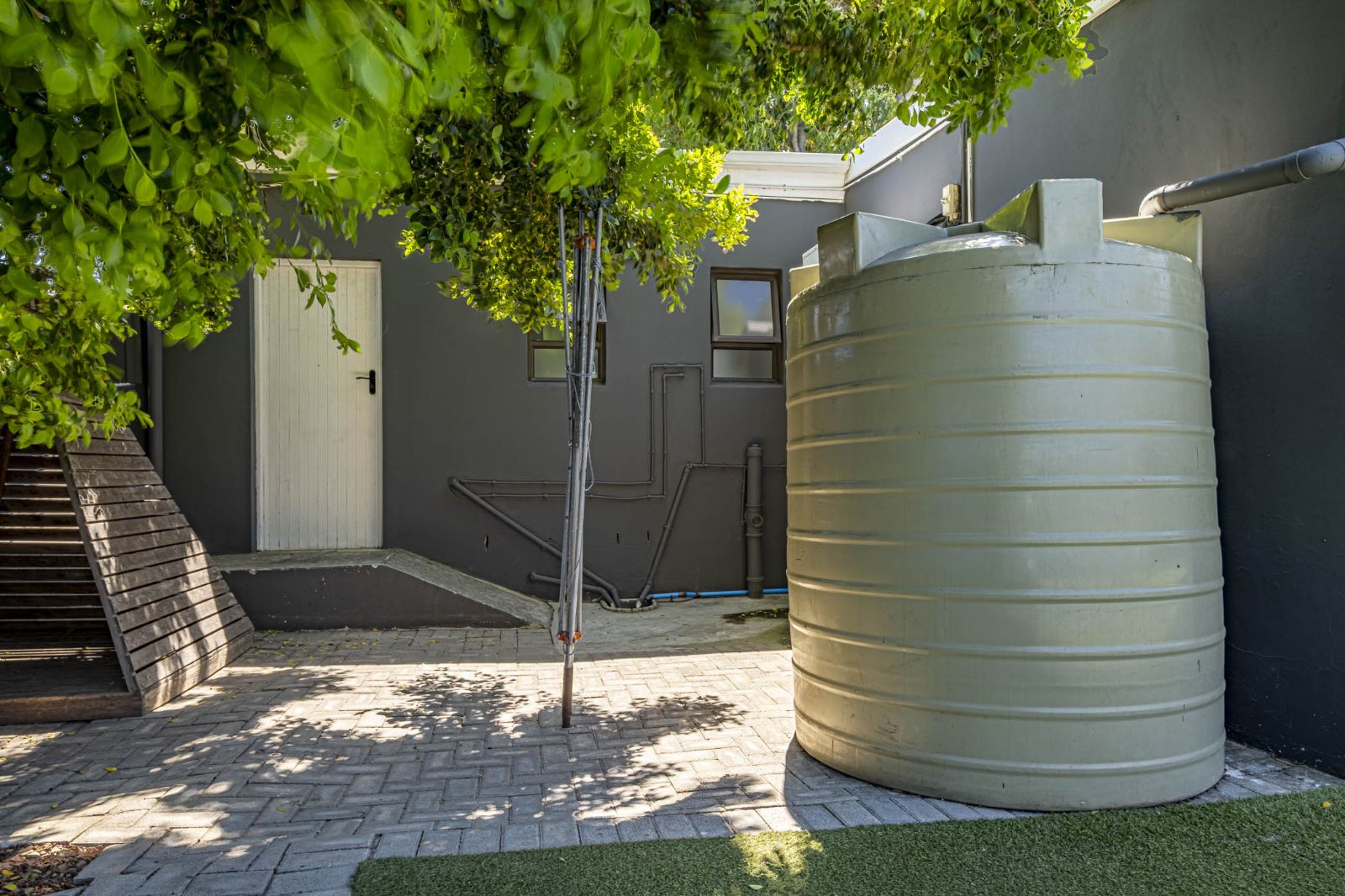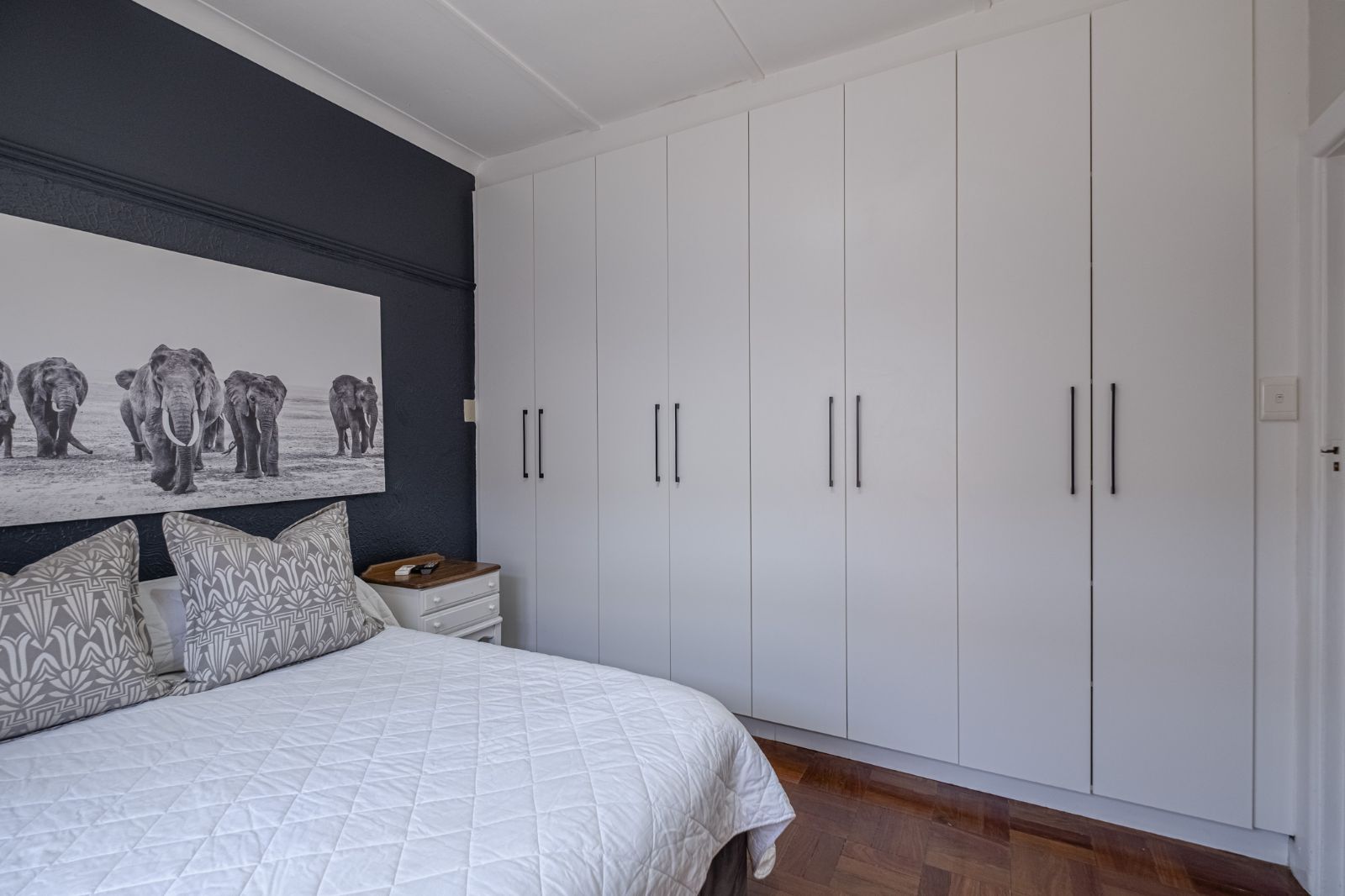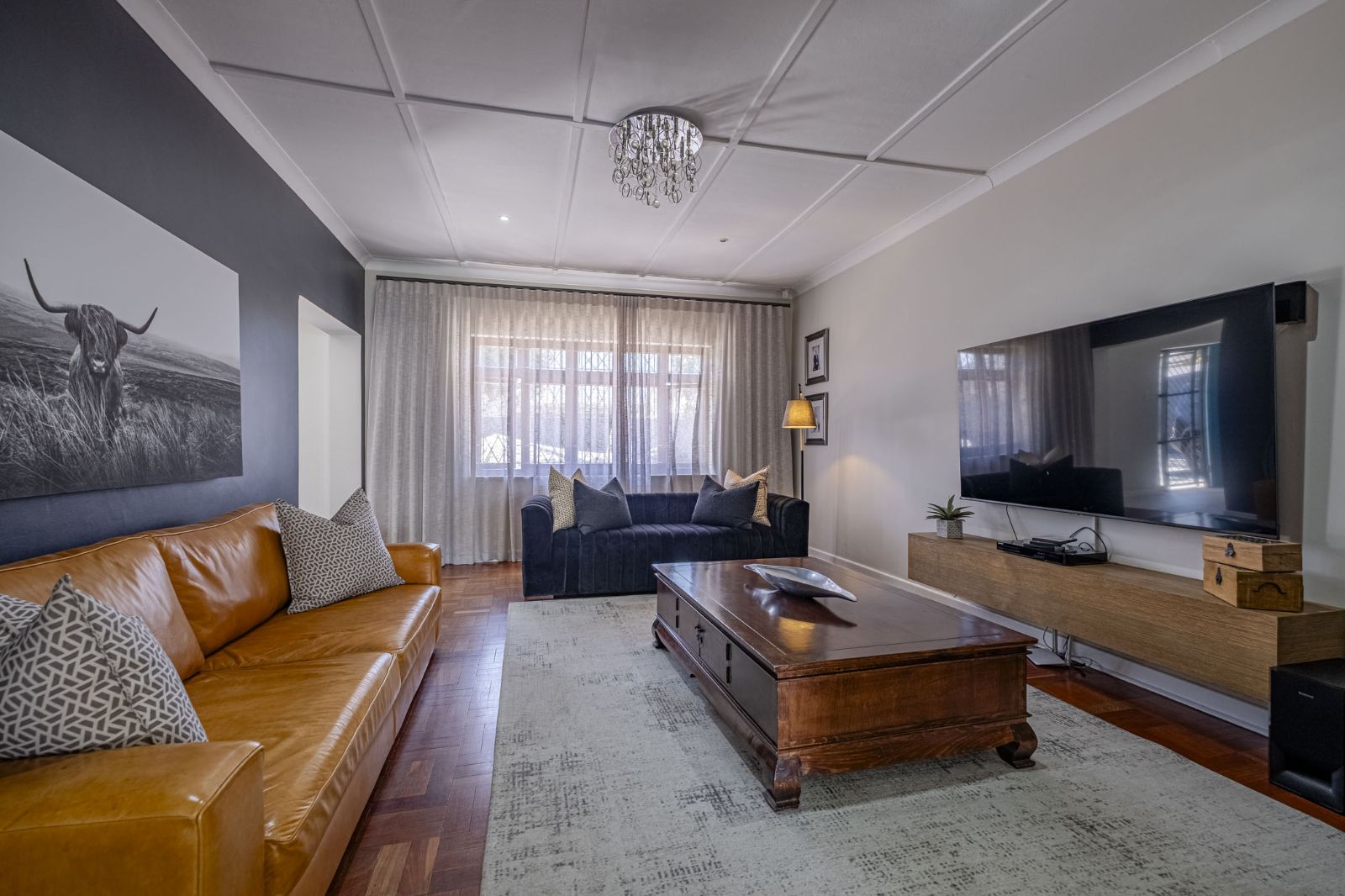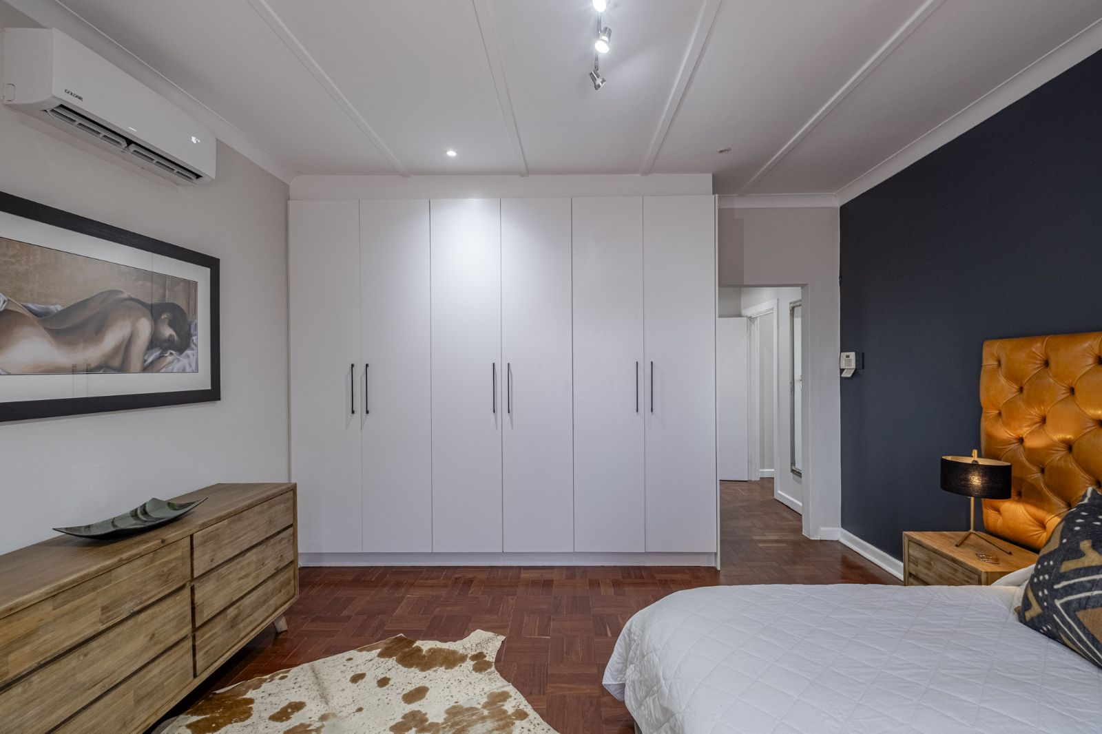 The spacious braai room is a standout, with interior fold-up aluminium doors and additional fold-up doors that open to the pool and garden, ensuring brilliant indoor-outdoor flow year-round. All three bedrooms boast solid wood wide parquet flooring and curtain rails, providing warmth and a touch of elegance. The property includes two bathrooms and a guest toilet in the main house for convenience.