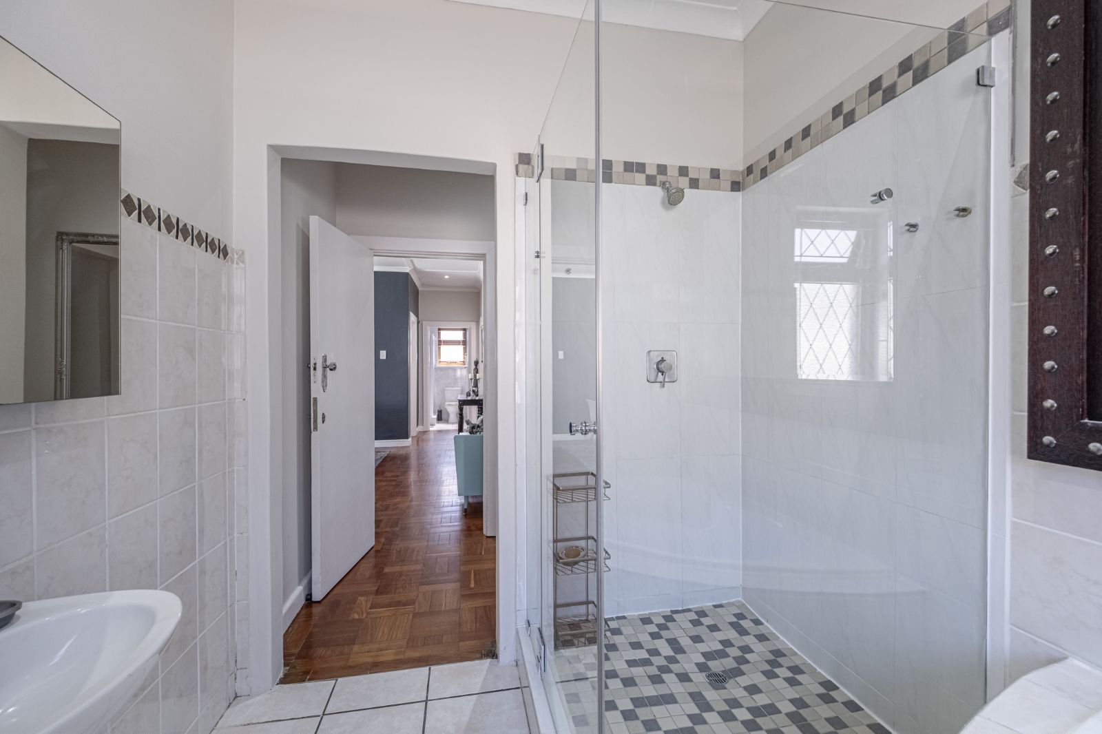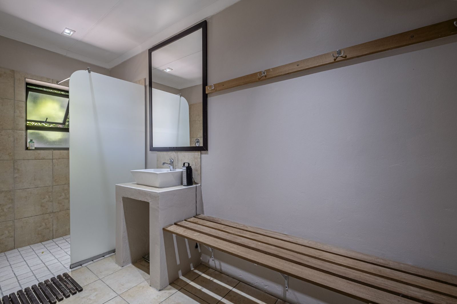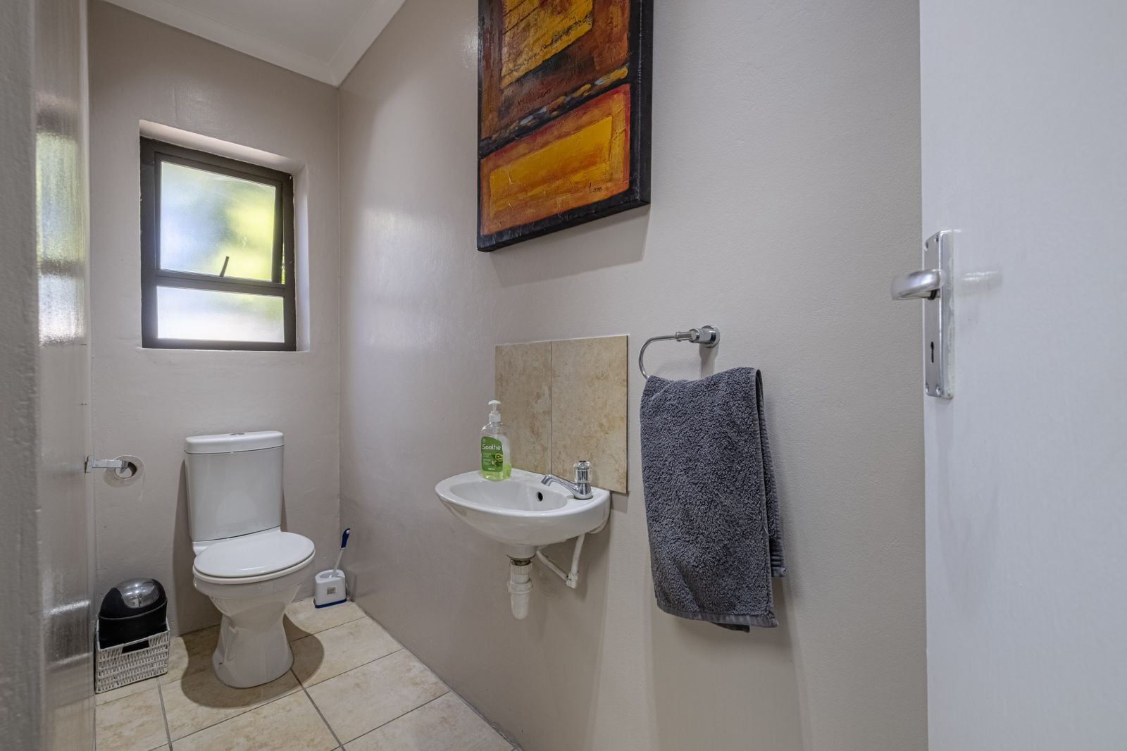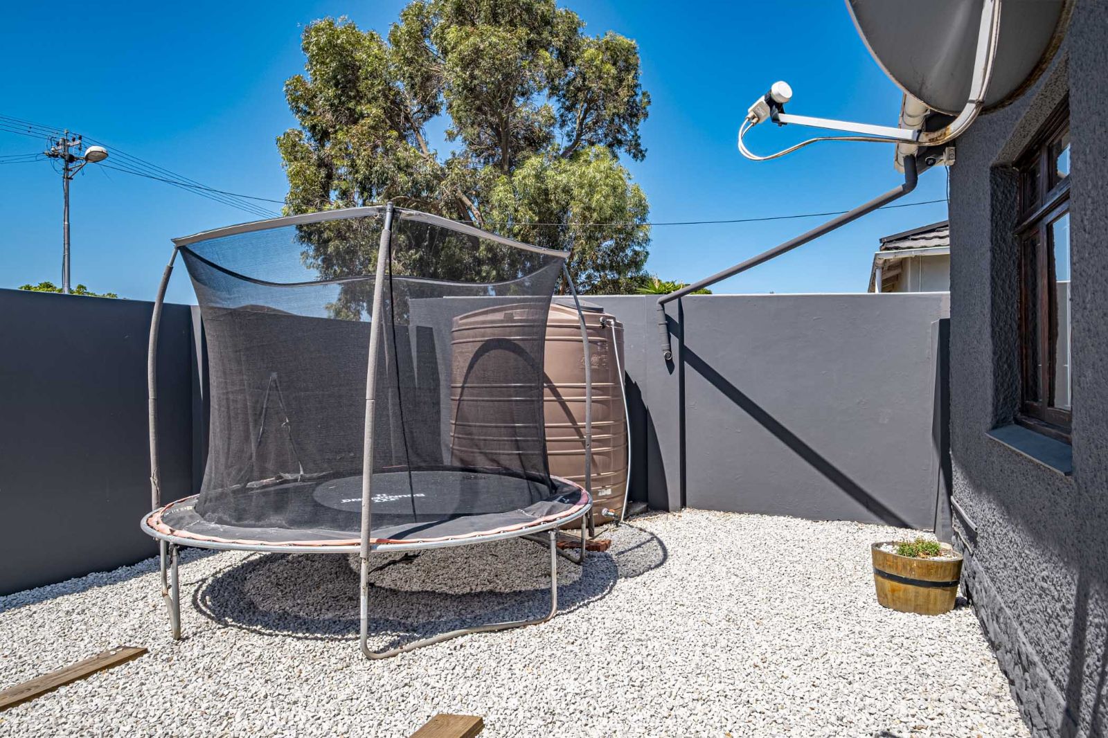 The spacious braai room is a standout, with interior fold-up aluminium doors and additional fold-up doors that open to the pool and garden, ensuring brilliant indoor-outdoor flow year-round. All three bedrooms boast solid wood wide parquet flooring and curtain rails, providing warmth and a touch of elegance. The property includes two bathrooms and a guest toilet in the main house for convenience.