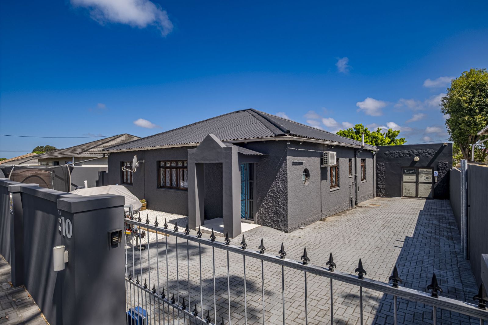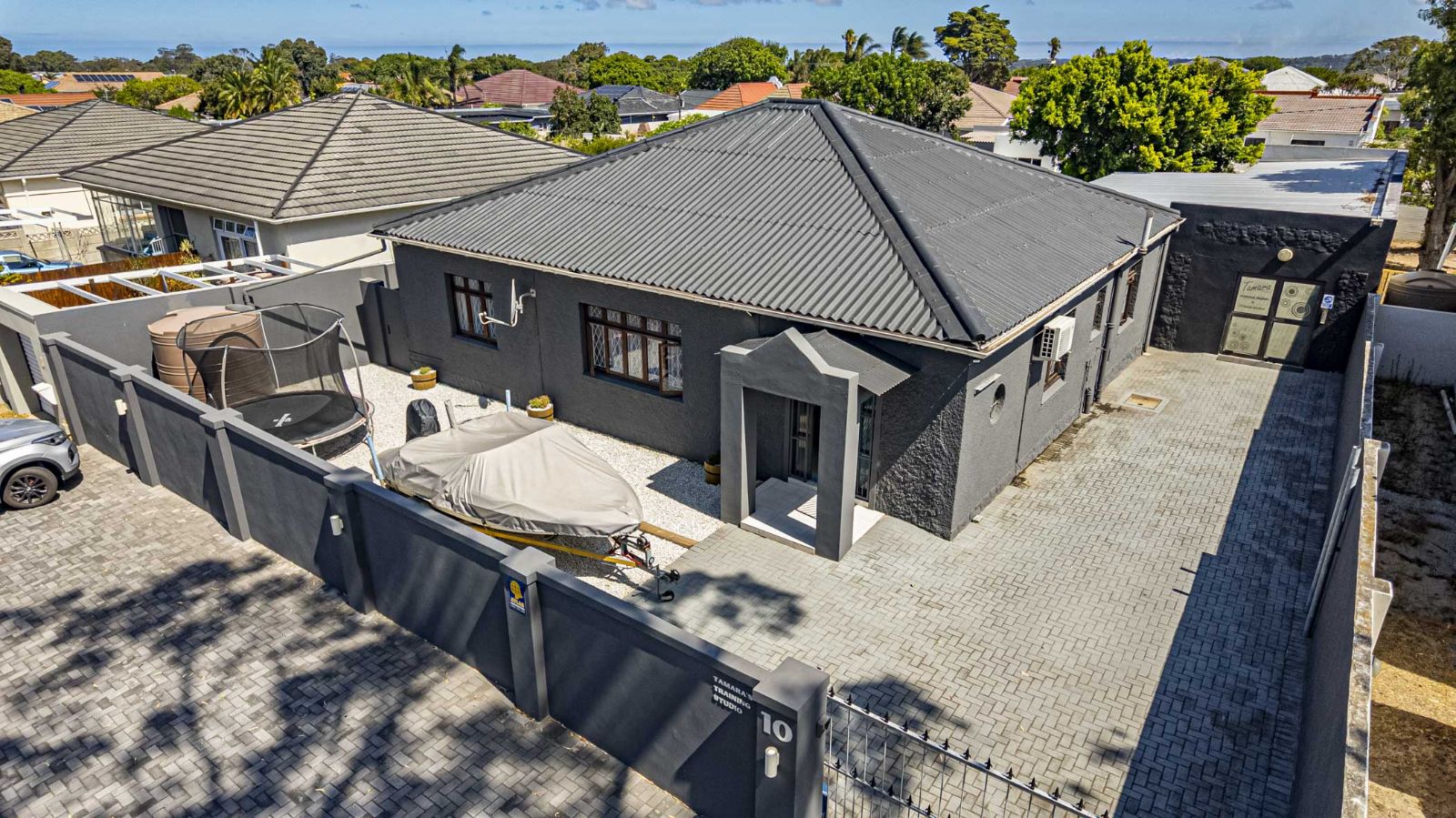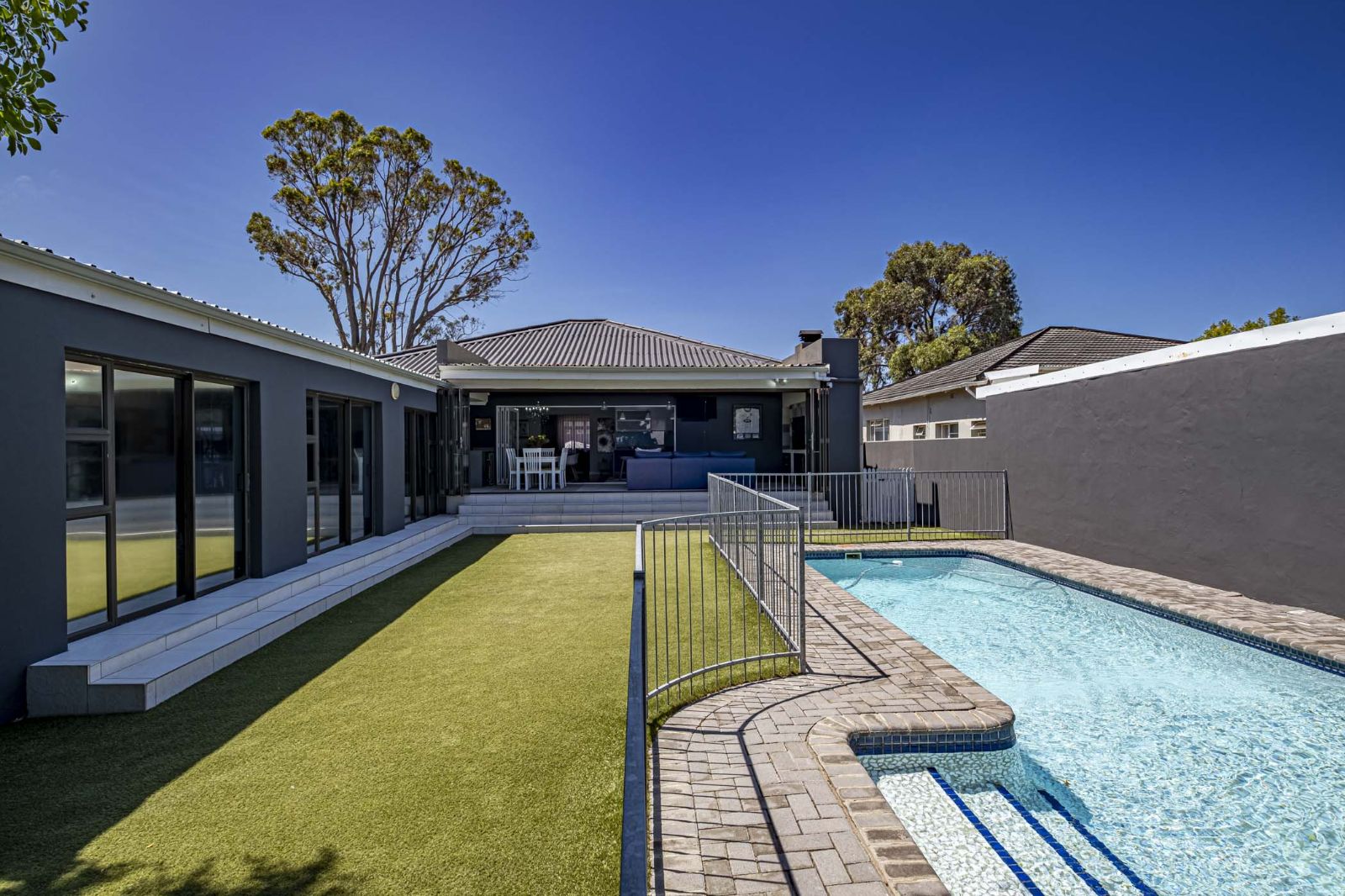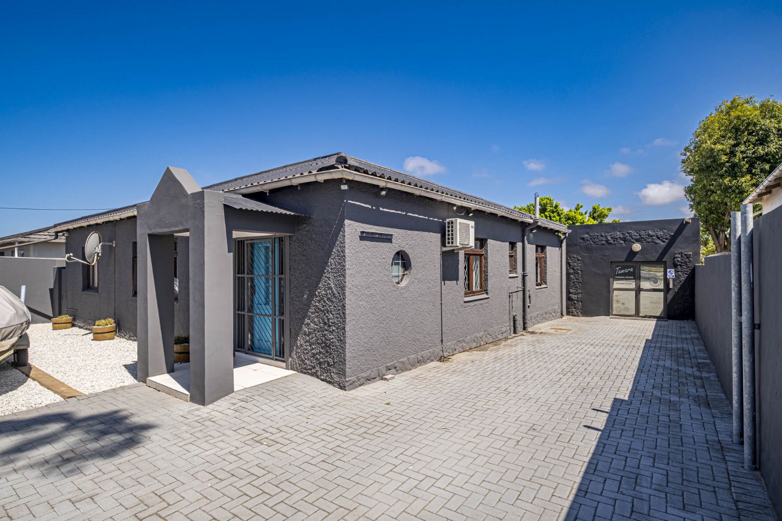 The garages have been extended and converted into an outside gym, complete with its own bathroom; this space can also be transformed into a very spacious flat with sliding doors that lead directly to the pool area, offering flexible living or rental potential. Security is comprehensive, featuring an alarm system, burglar bars, a perimeter wall, and a front electric gate on remote. Secure off-street parking available.