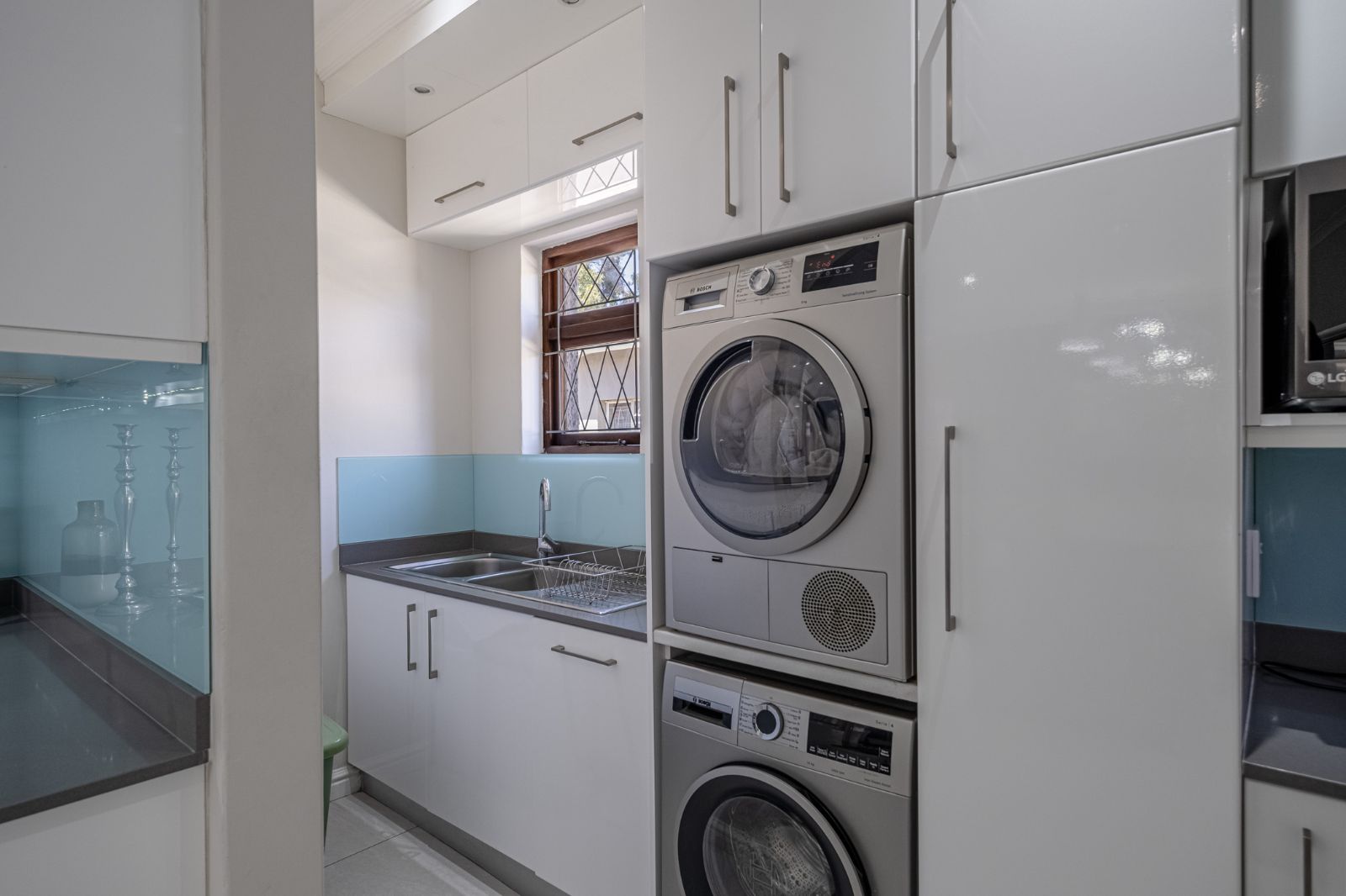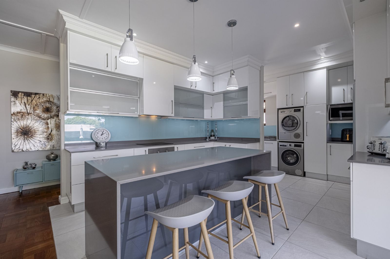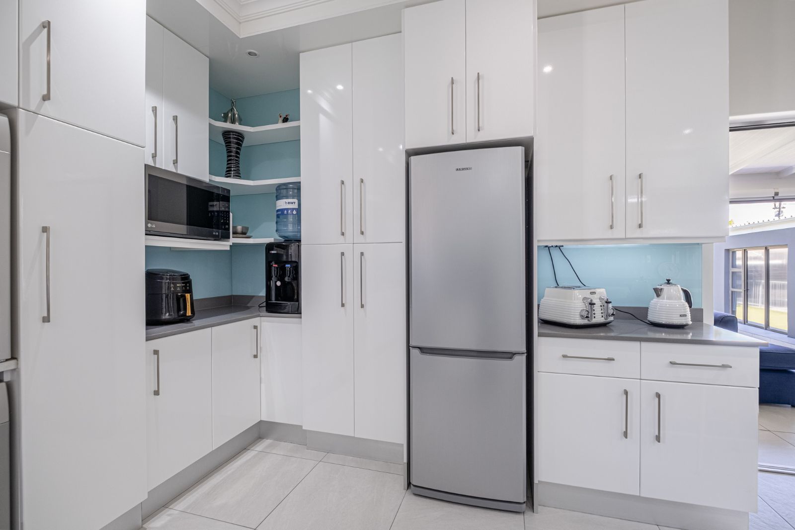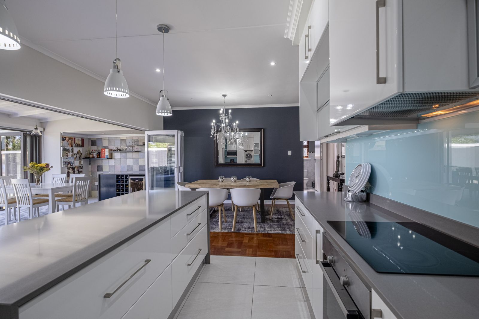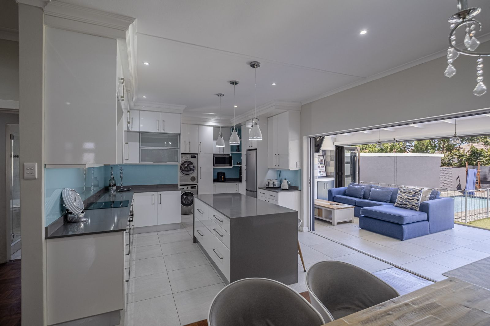 This absolutely immaculate, contemporary move-in-ready home in Newton Park is the epitome of modern comfort and effortless living. The open-plan layout brings together the kitchen, dining, lounge, TV lounge, and an inviting indoor braai area, creating a spacious, social hub for family and friends. The kitchen is a chef’s delight, featuring a separate scullery, stone countertops, a centre island, built-in oven and stove, all with views of the pool and the outside courtyard for seamless entertaining.