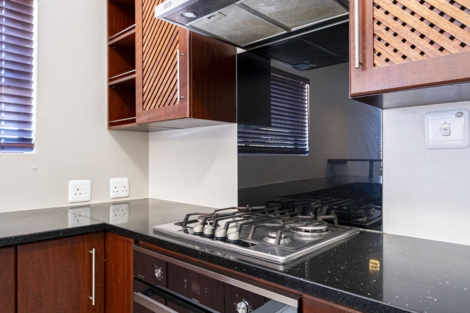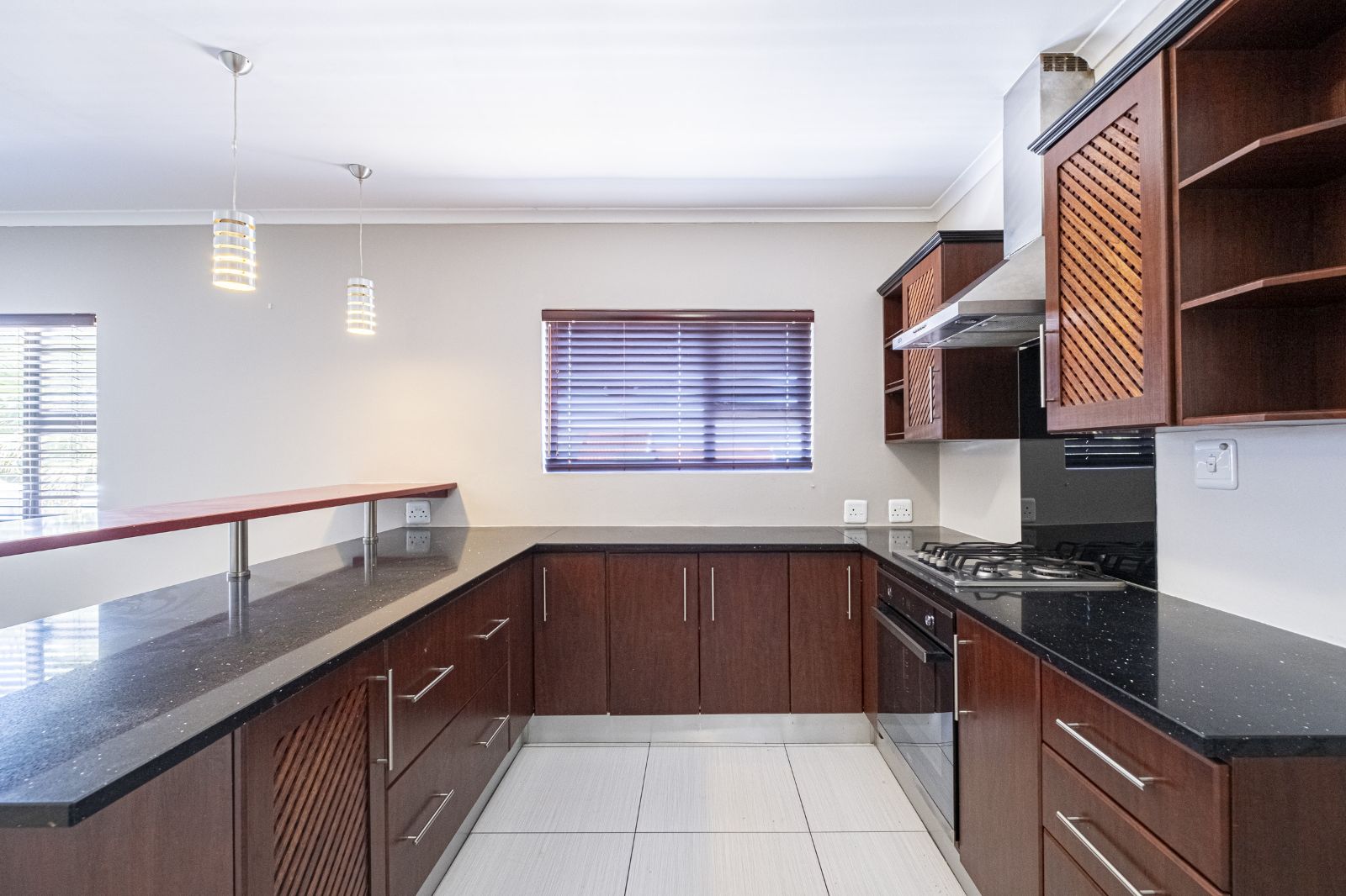 The open-plan kitchen and dining area create a seamless flow for family living, with the kitchen offering stunning stone countertops, a gas stove, and a basin. The sunken lounge adds character to the home, featuring cozy wall-to-wall carpeting.