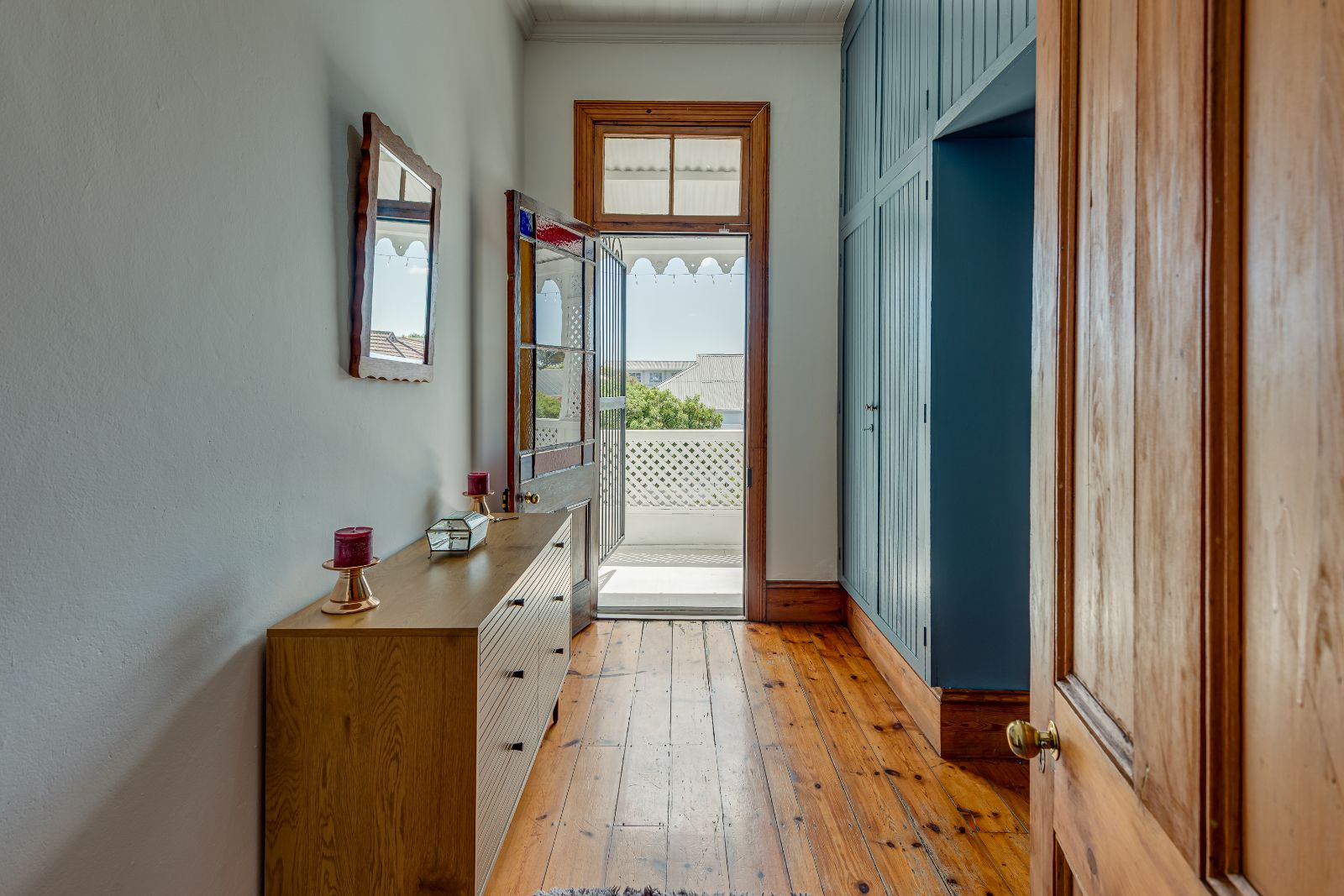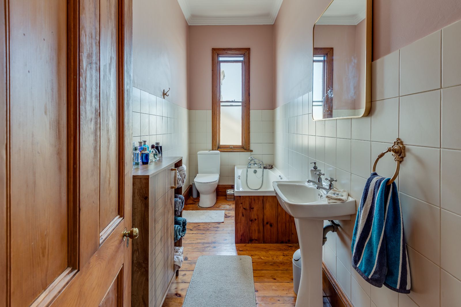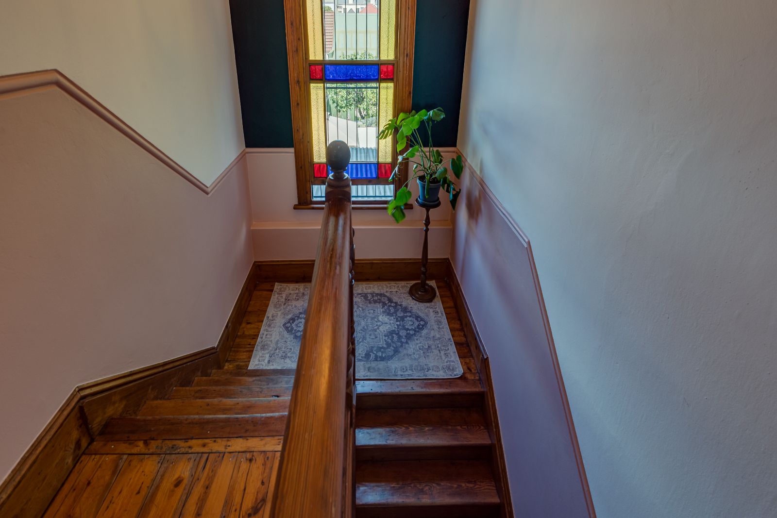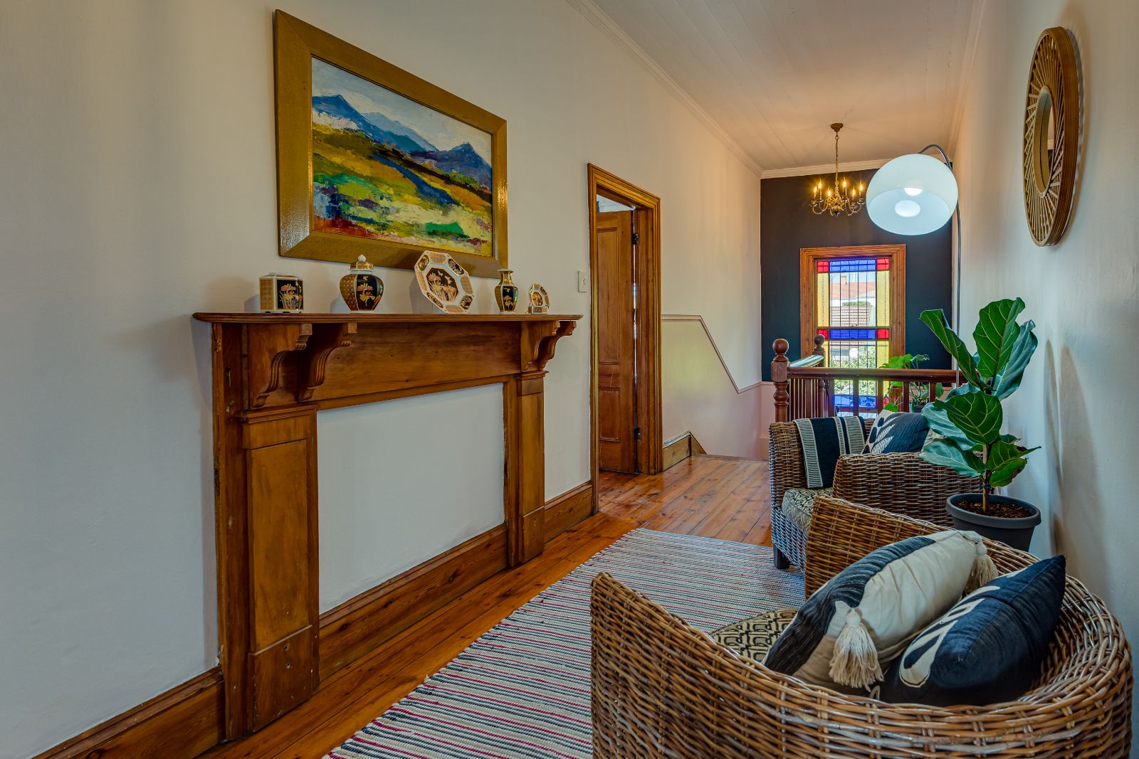 Upstairs, three well-proportioned bedrooms with wooden floors provide comfortable accommodation, two fitted with built-in cupboards. One of the bedrooms opens onto a charming balcony, perfect for enjoying your morning coffee. The landing offers additional space for a reading nook or pyjama lounge, enhanced by a beautiful stained-glass sash window. A family bathroom services this level.