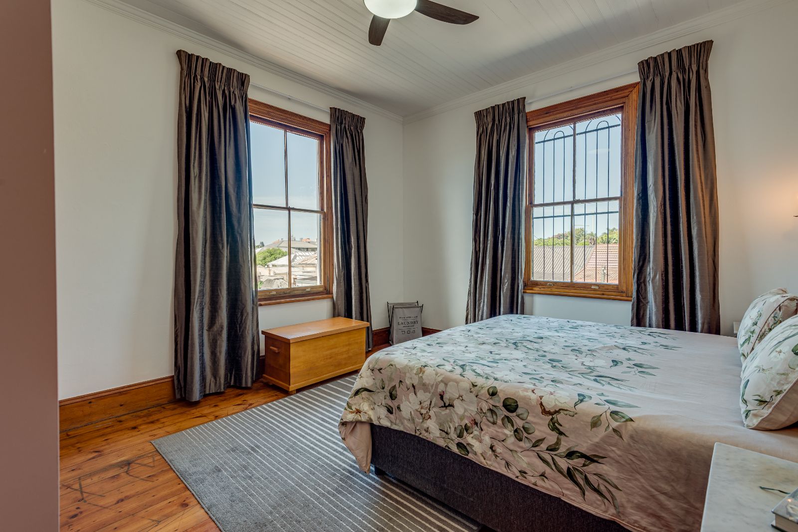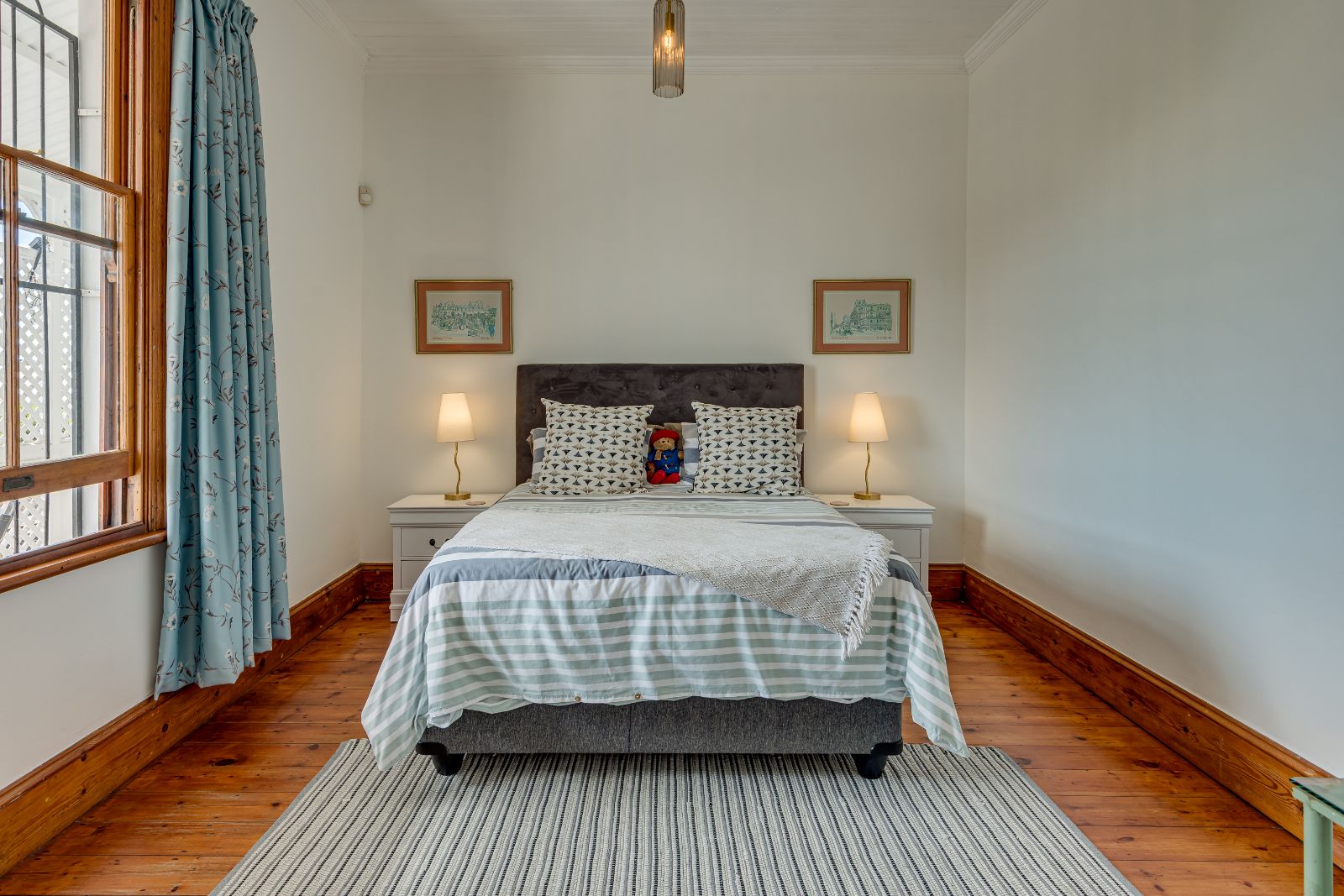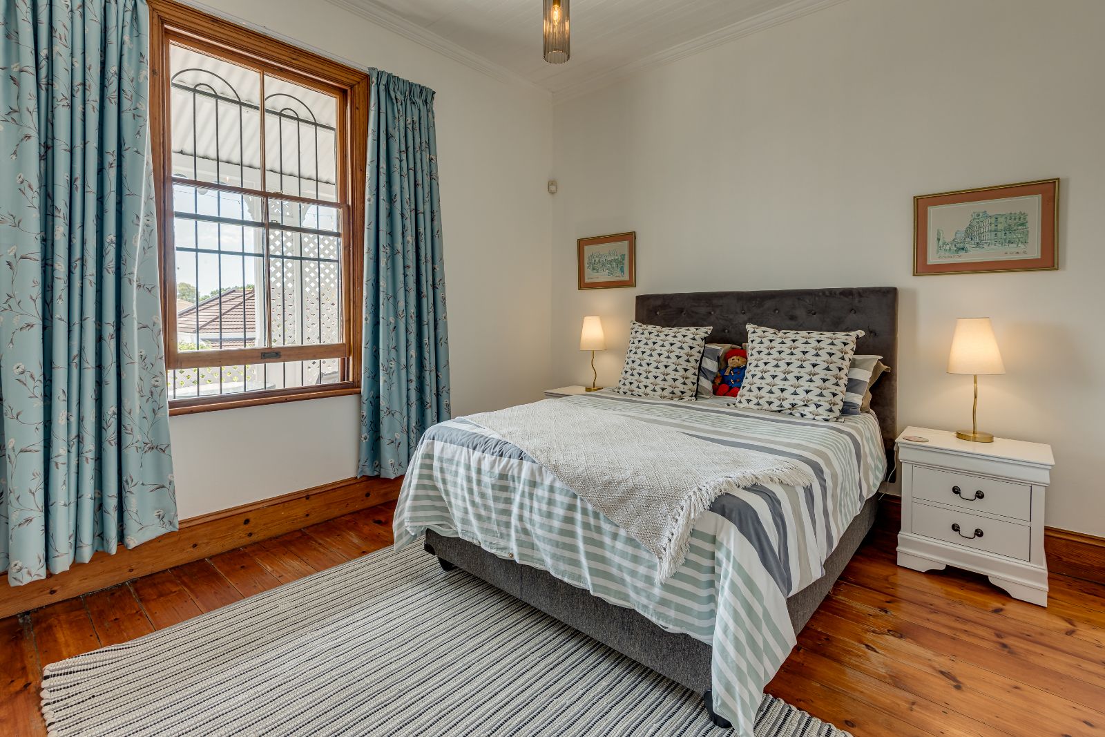 Upstairs, three well-proportioned bedrooms with wooden floors provide comfortable accommodation, two fitted with built-in cupboards. One of the bedrooms opens onto a charming balcony, perfect for enjoying your morning coffee. The landing offers additional space for a reading nook or pyjama lounge, enhanced by a beautiful stained-glass sash window. A family bathroom services this level.