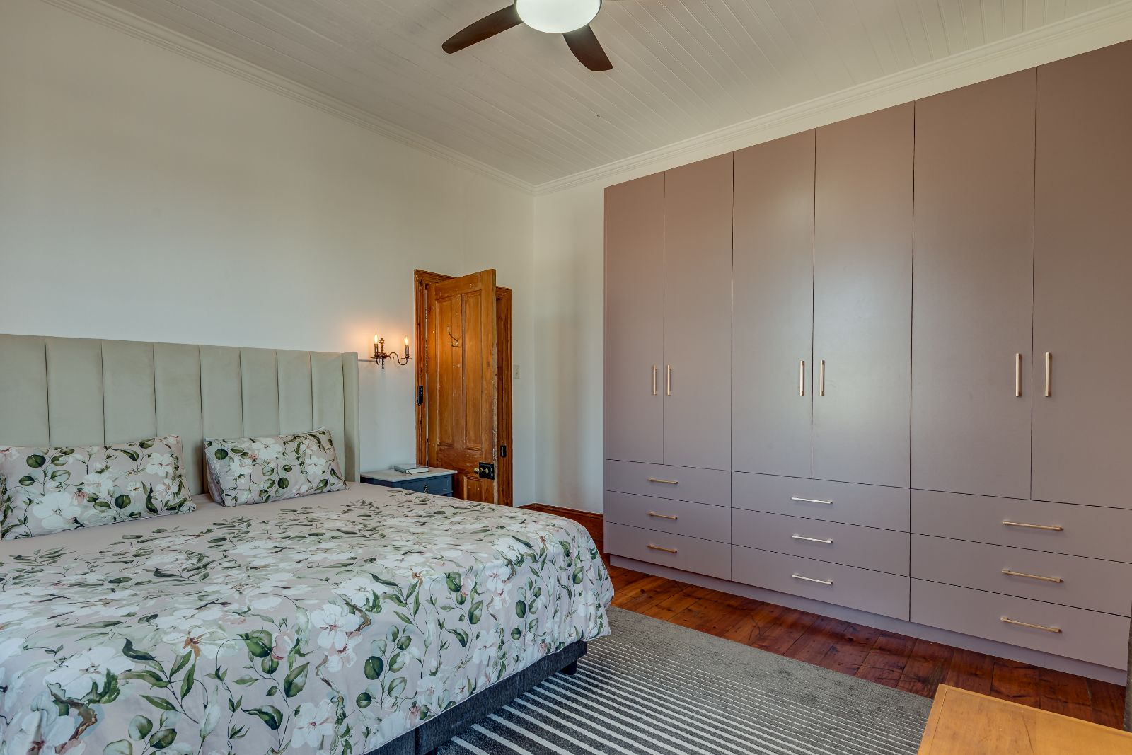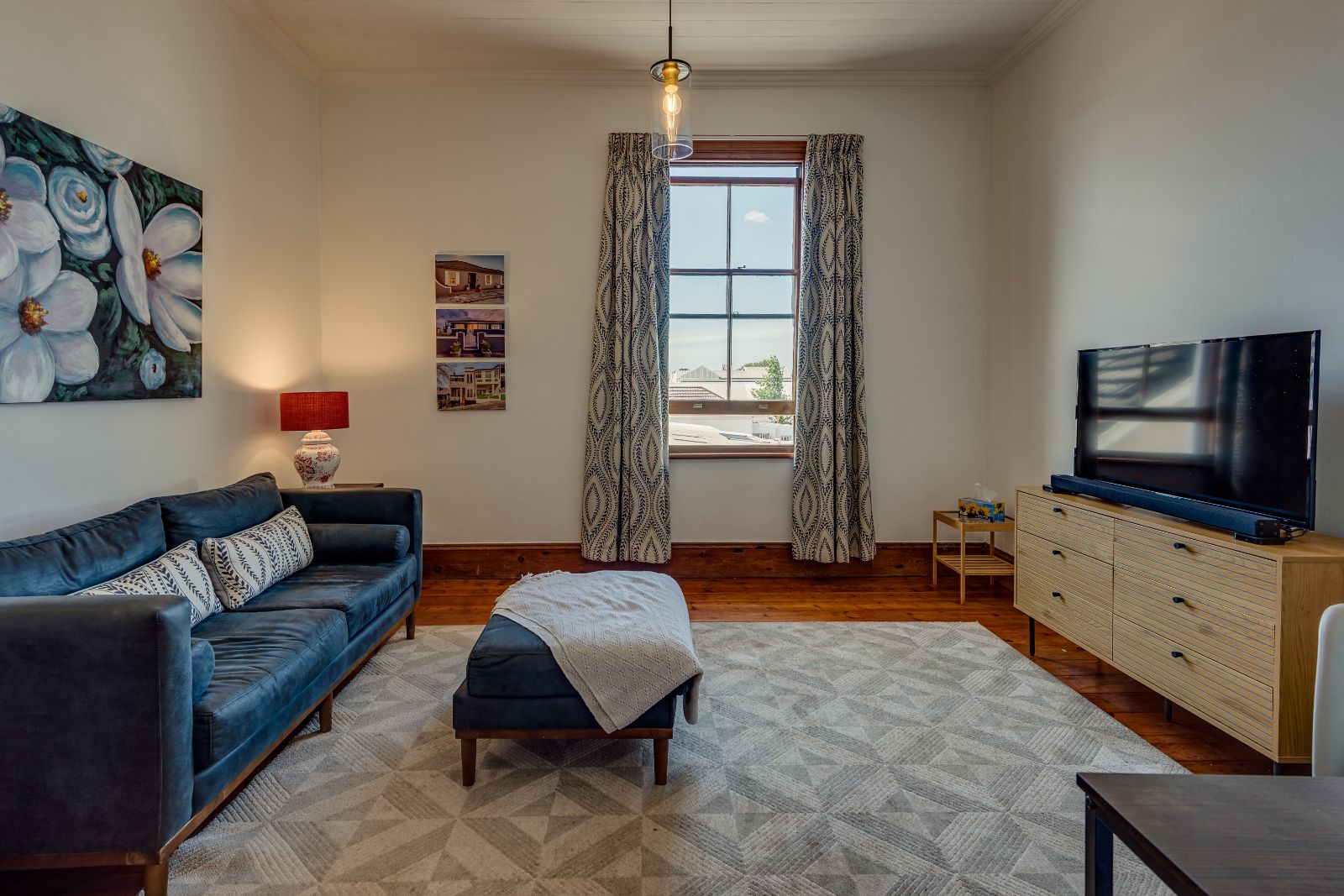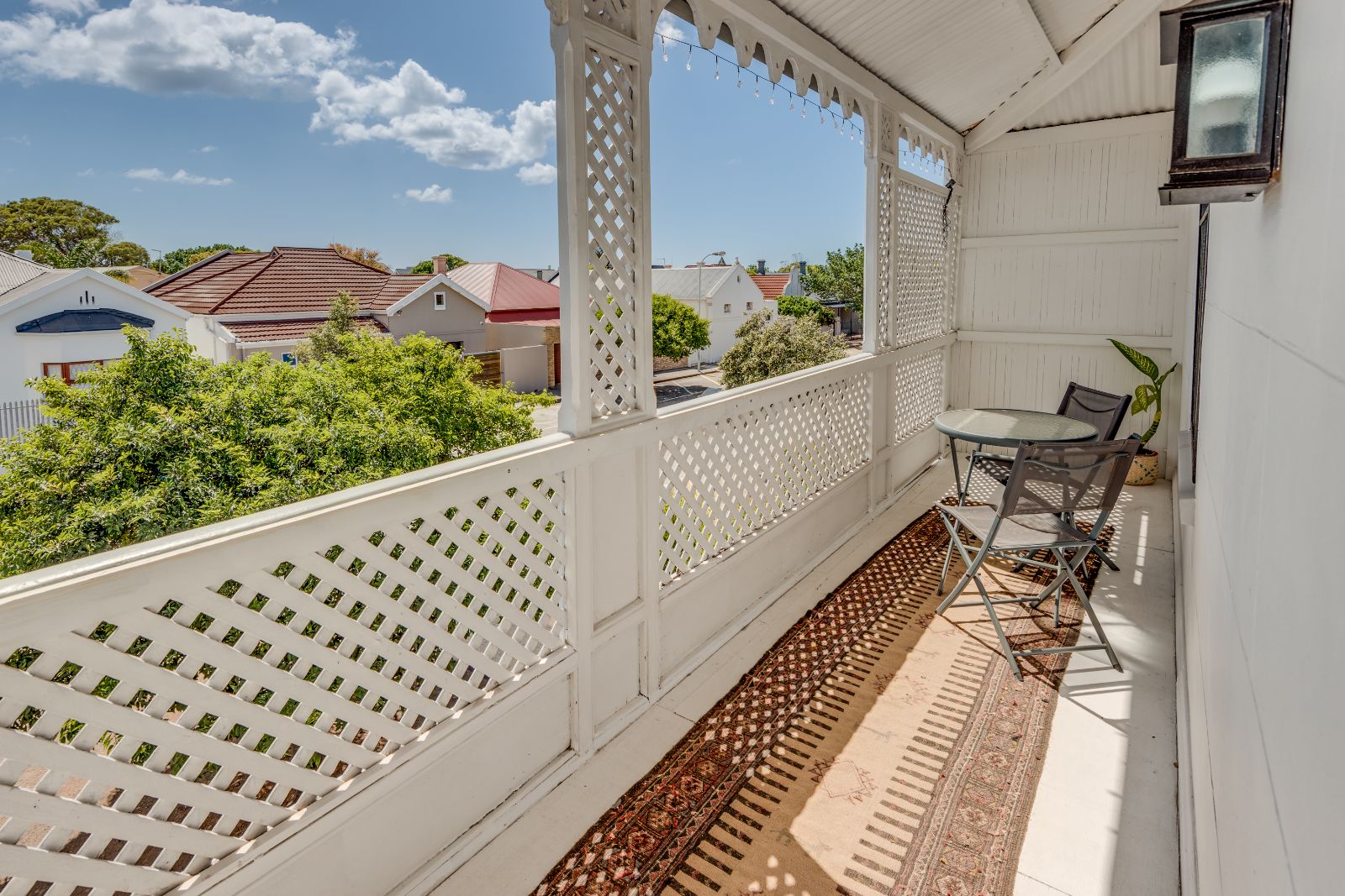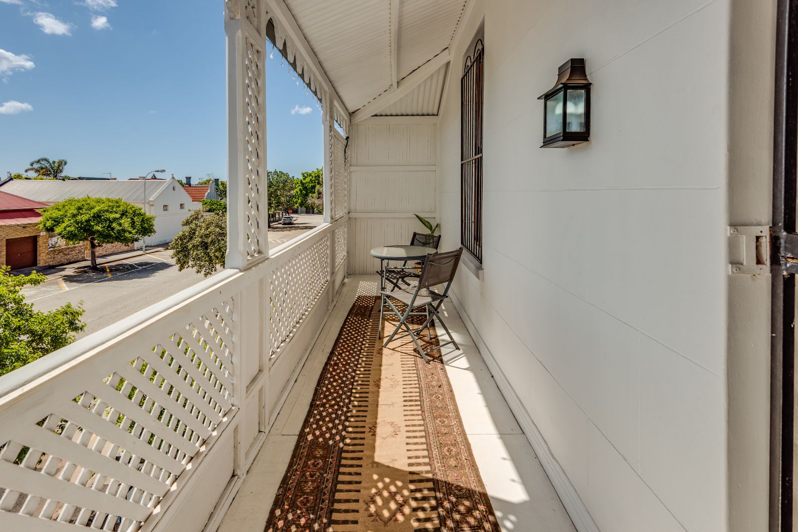 Upstairs, three well-proportioned bedrooms with wooden floors provide comfortable accommodation, two fitted with built-in cupboards. One of the bedrooms opens onto a charming balcony, perfect for enjoying your morning coffee. The landing offers additional space for a reading nook or pyjama lounge, enhanced by a beautiful stained-glass sash window. A family bathroom services this level.