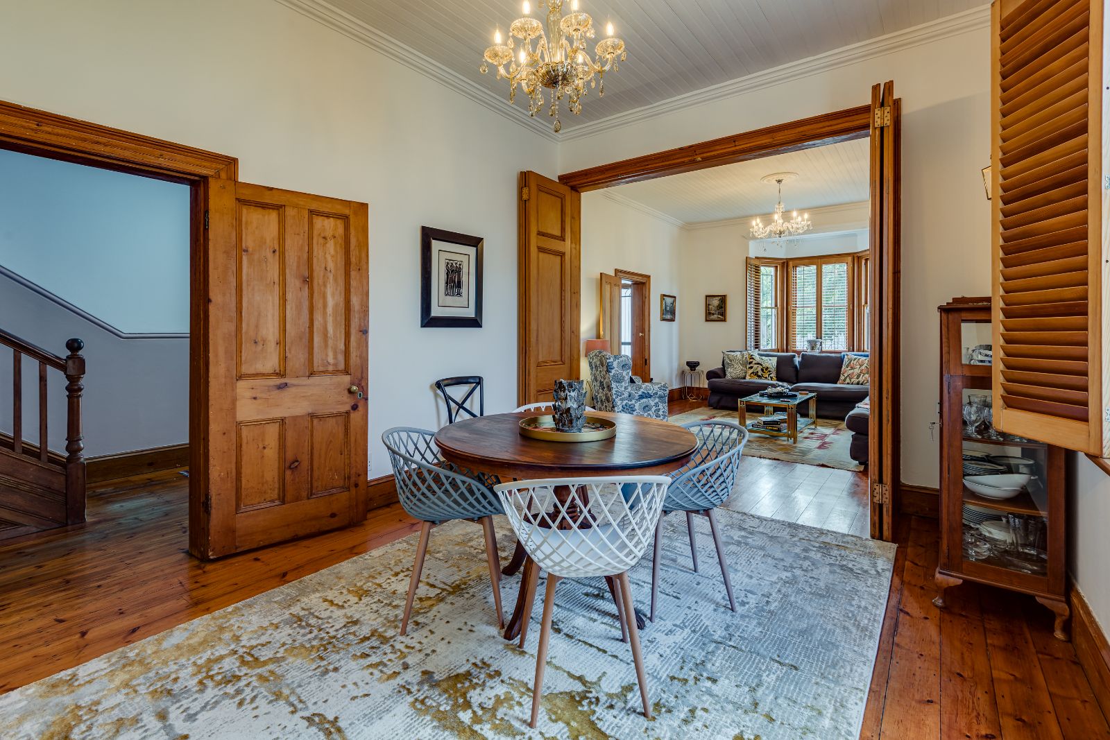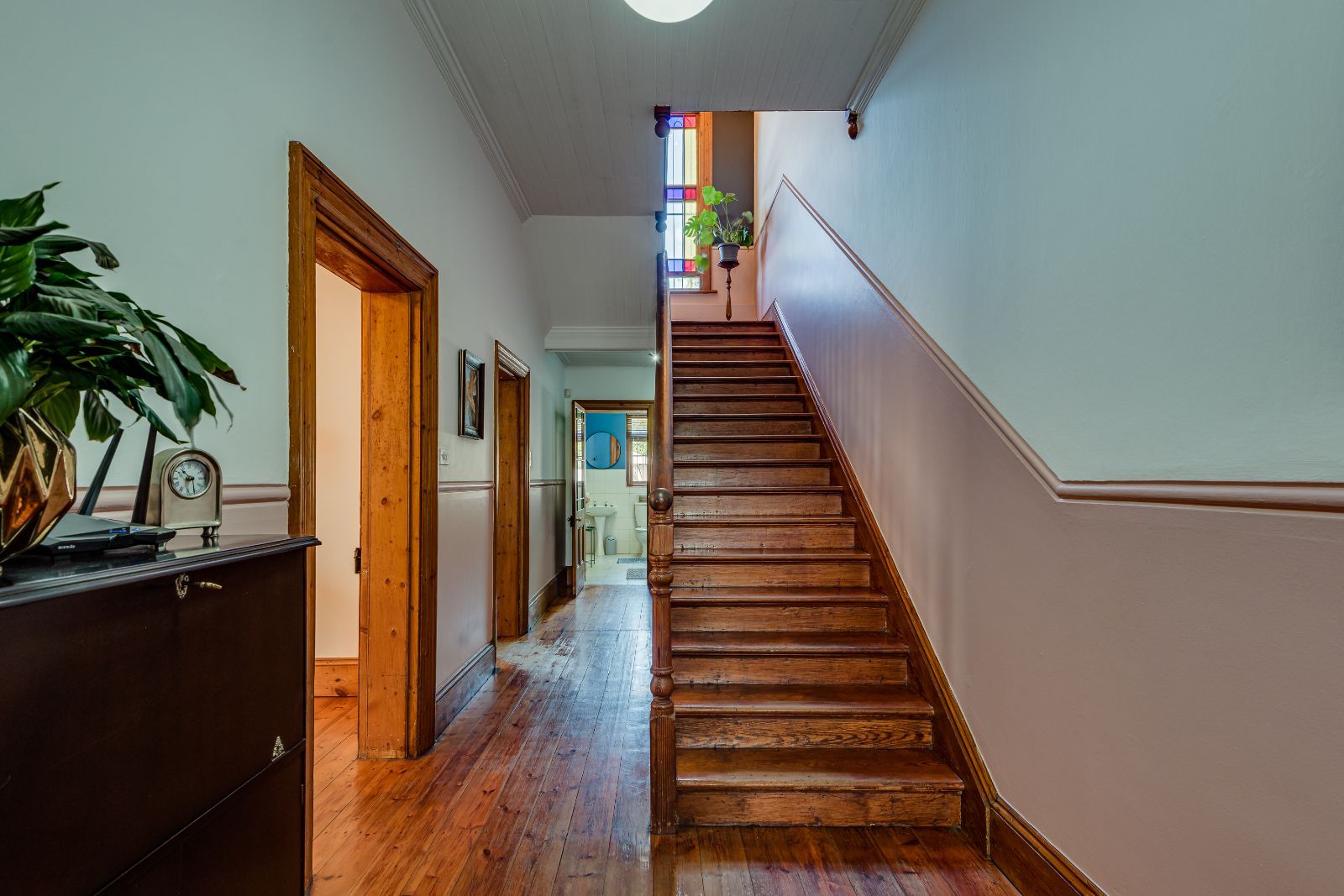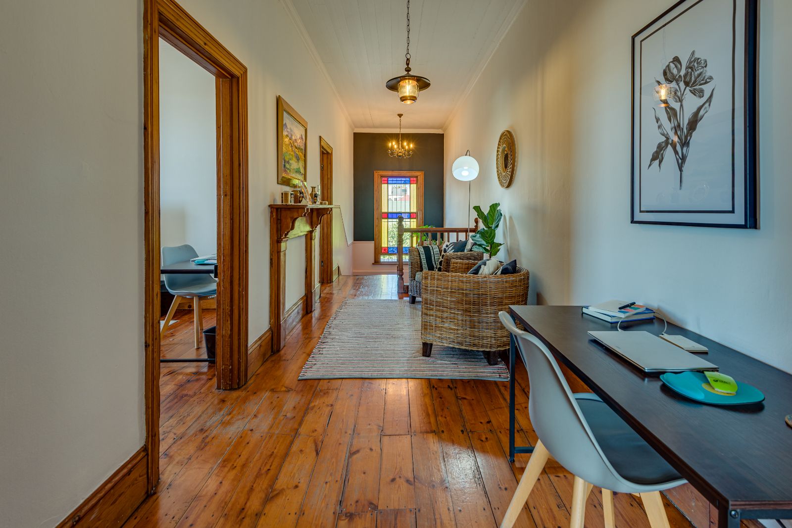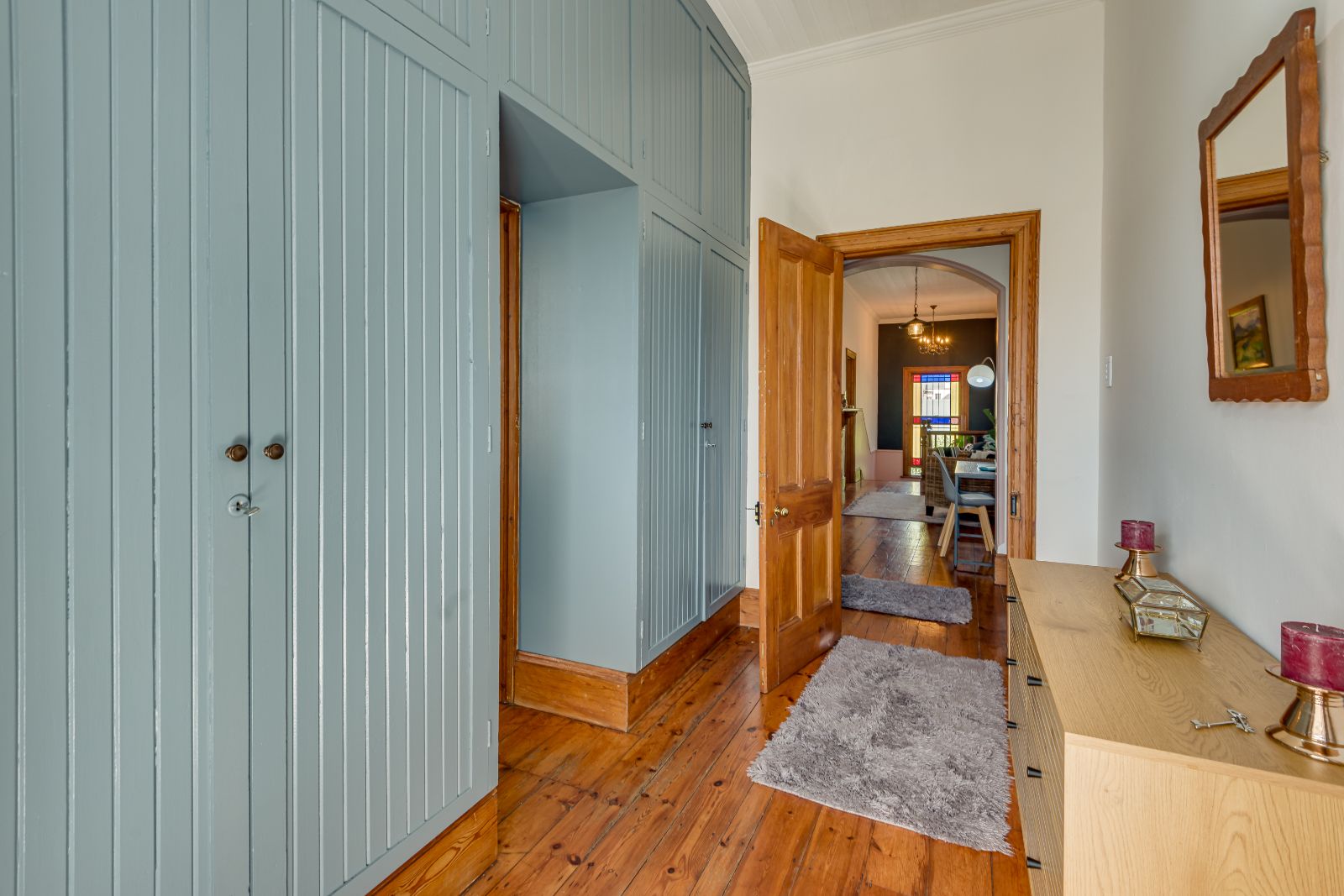 From the moment you enter, the home makes a lasting impression. A spacious entrance hall welcomes you in, where a striking archway frames the wooden staircase, setting the tone for the elegance found throughout. High ceilings, original wooden floors, and intricate stained-glass windows create a warm and inviting atmosphere.