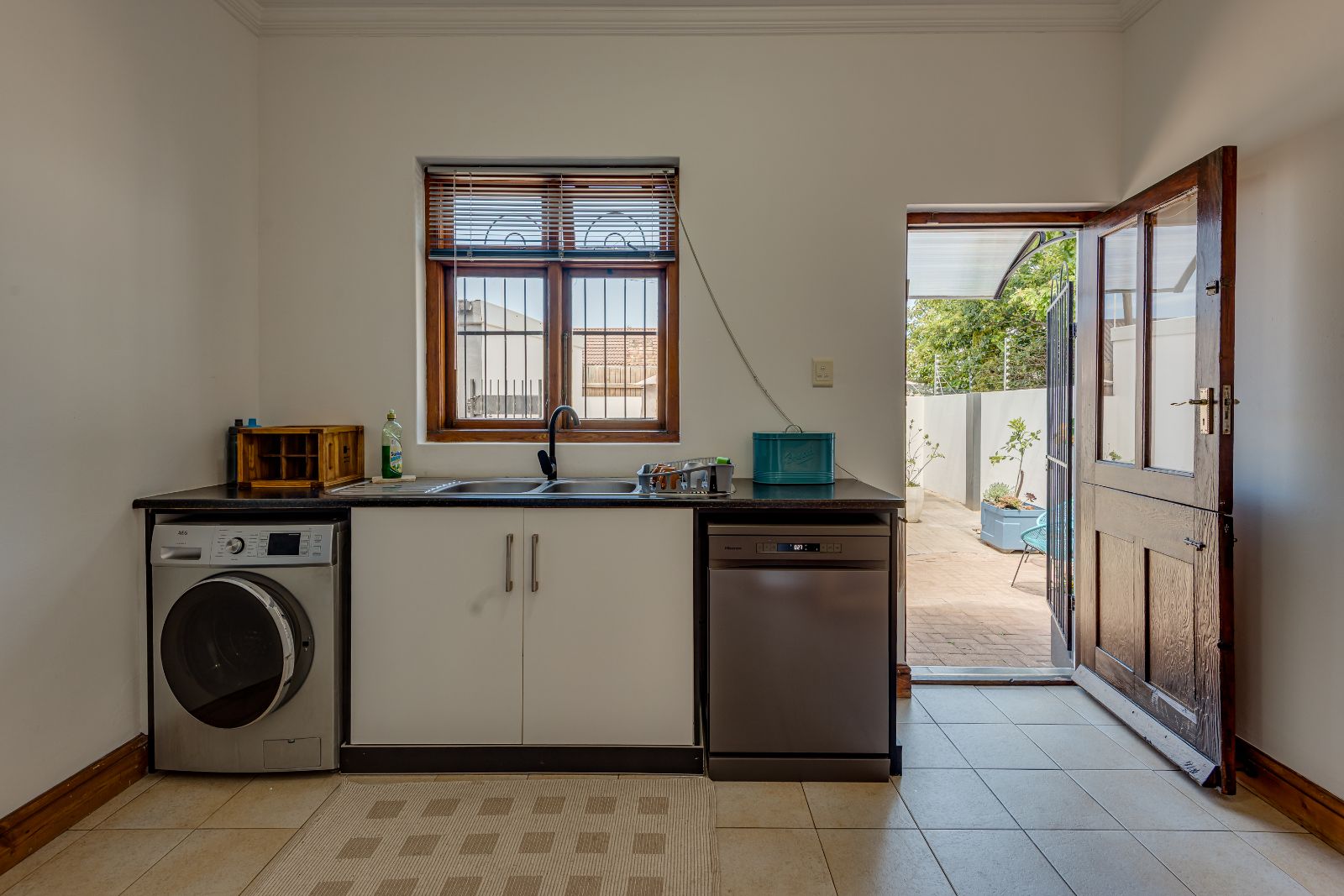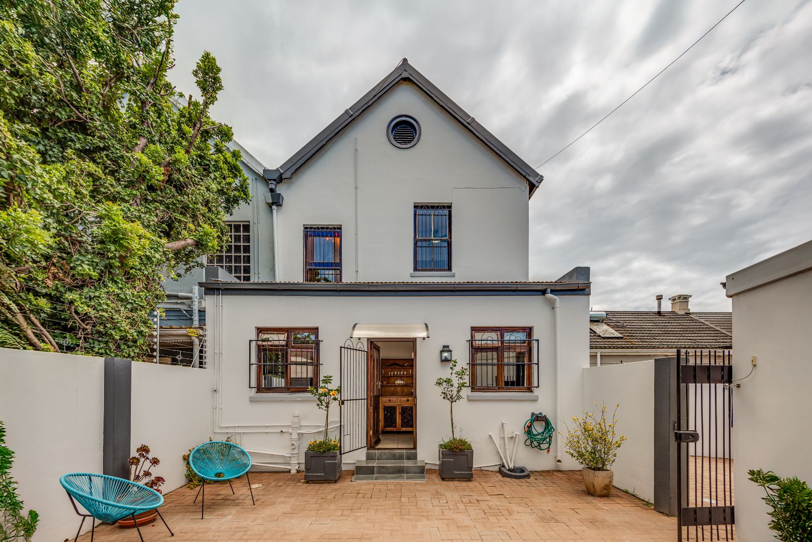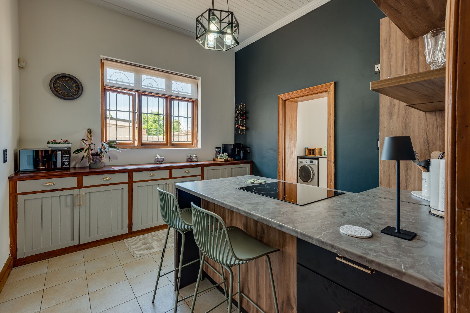 The kitchen has been tastefully updated and features a glass-top hob, eye-level oven, and a breakfast bar for casual dining. It leads into an exceptionally spacious scullery with room for both a washing machine and dishwasher. From here, doors open out to a private courtyard with an added bonus and a rare outdoor retreat for Richmond Hill living.