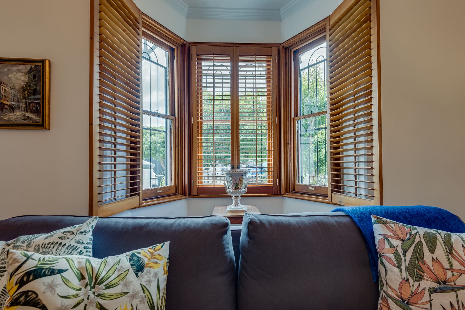 The ground floor is designed for both relaxed living and easy entertaining. The lounge, complete with a bay window and wooden shutters, flows effortlessly into the dining room via solid wooden folding doors, allowing you to open up the space or create a more intimate setting when preferred. The dining room mirrors this charm with its own shutters, while a full bathroom with both bath and shower adds convenience on this level.