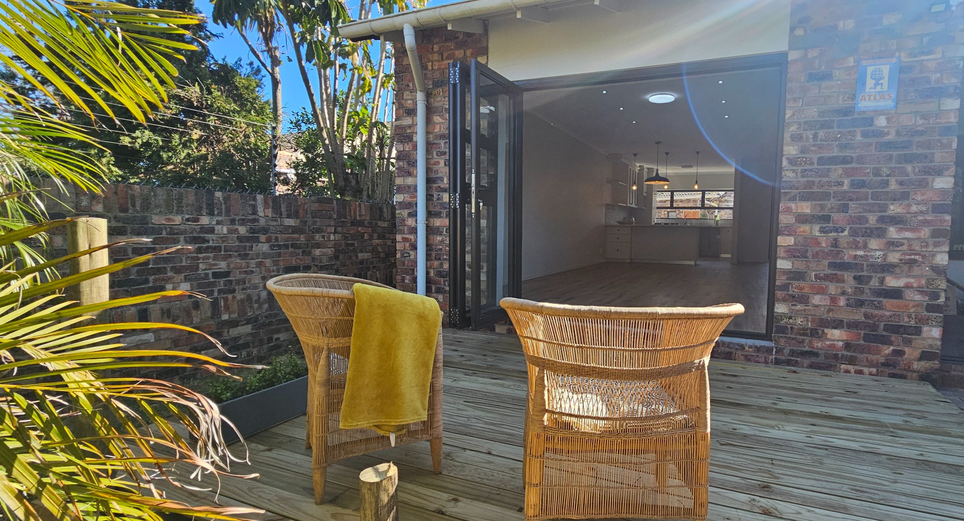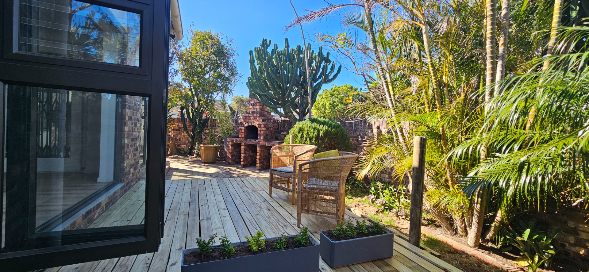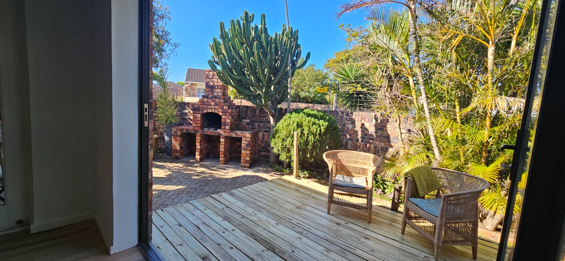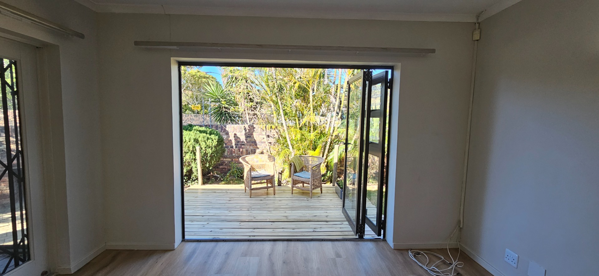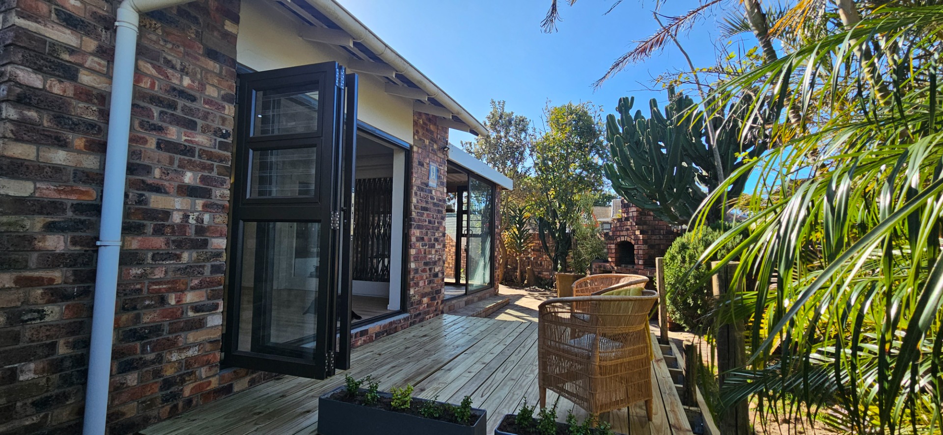 - Open-plan dining and lounge area with stacking doors leading to a wooden deck and small garden with outdoor braai area.