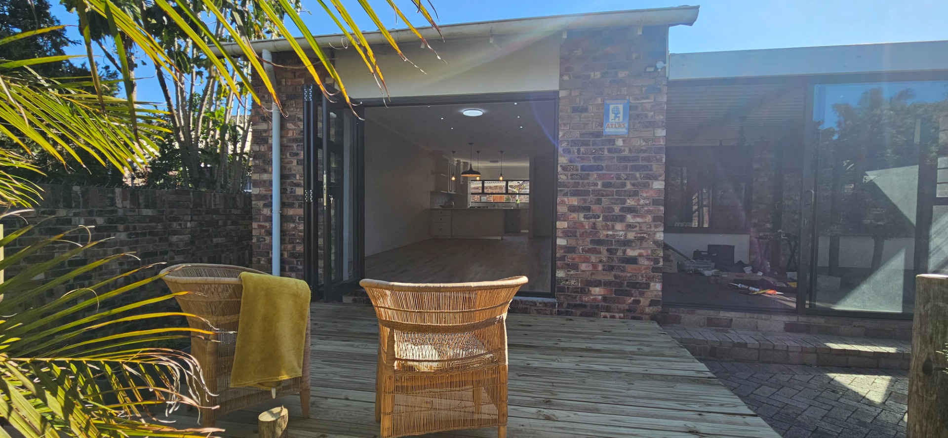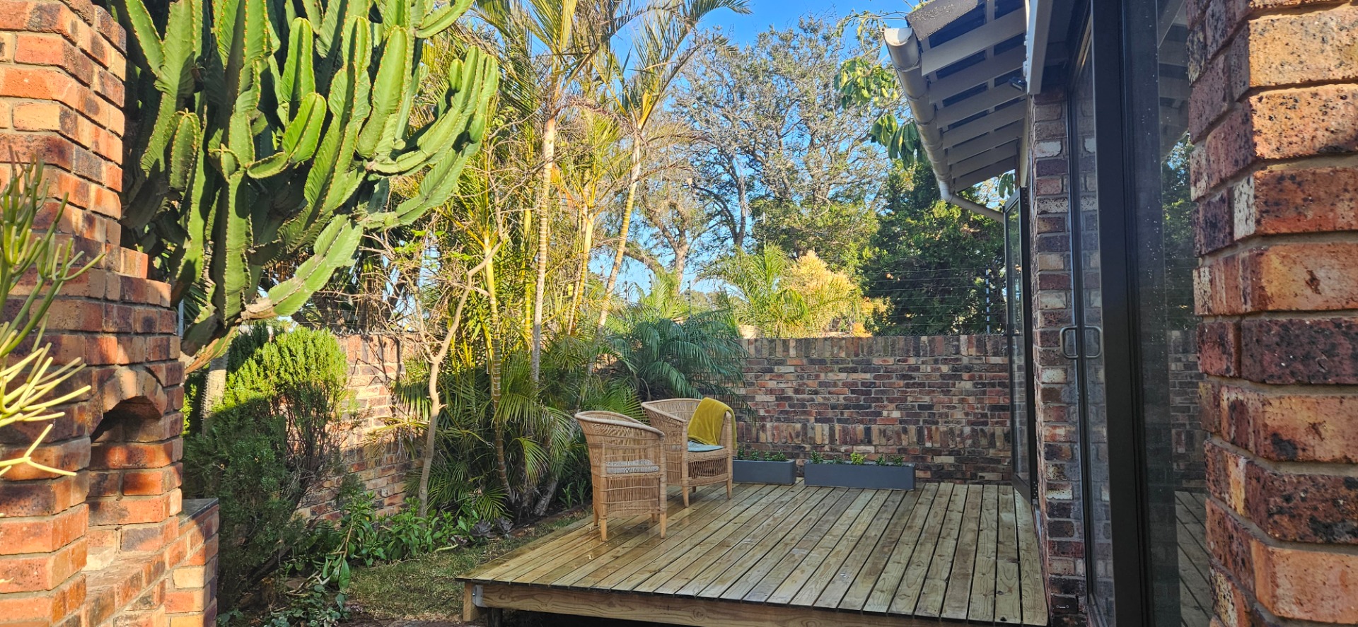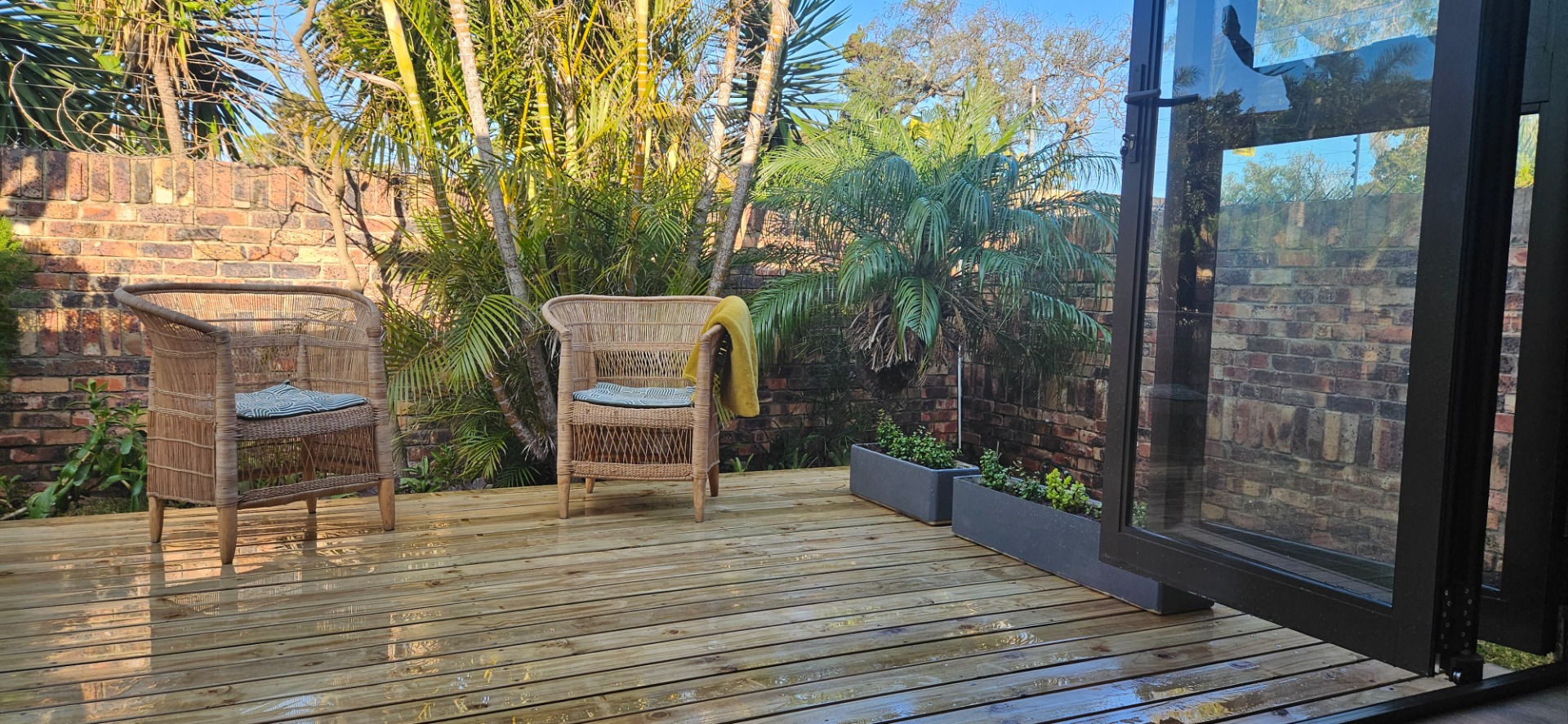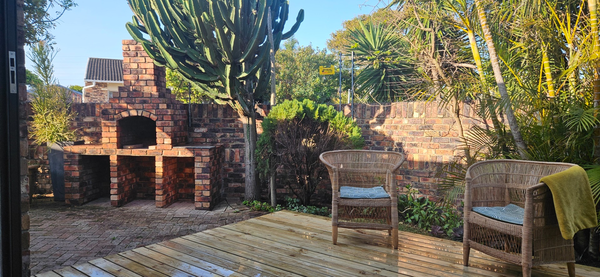 - Open-plan dining and lounge area with stacking doors leading to a wooden deck and small garden with outdoor braai area.