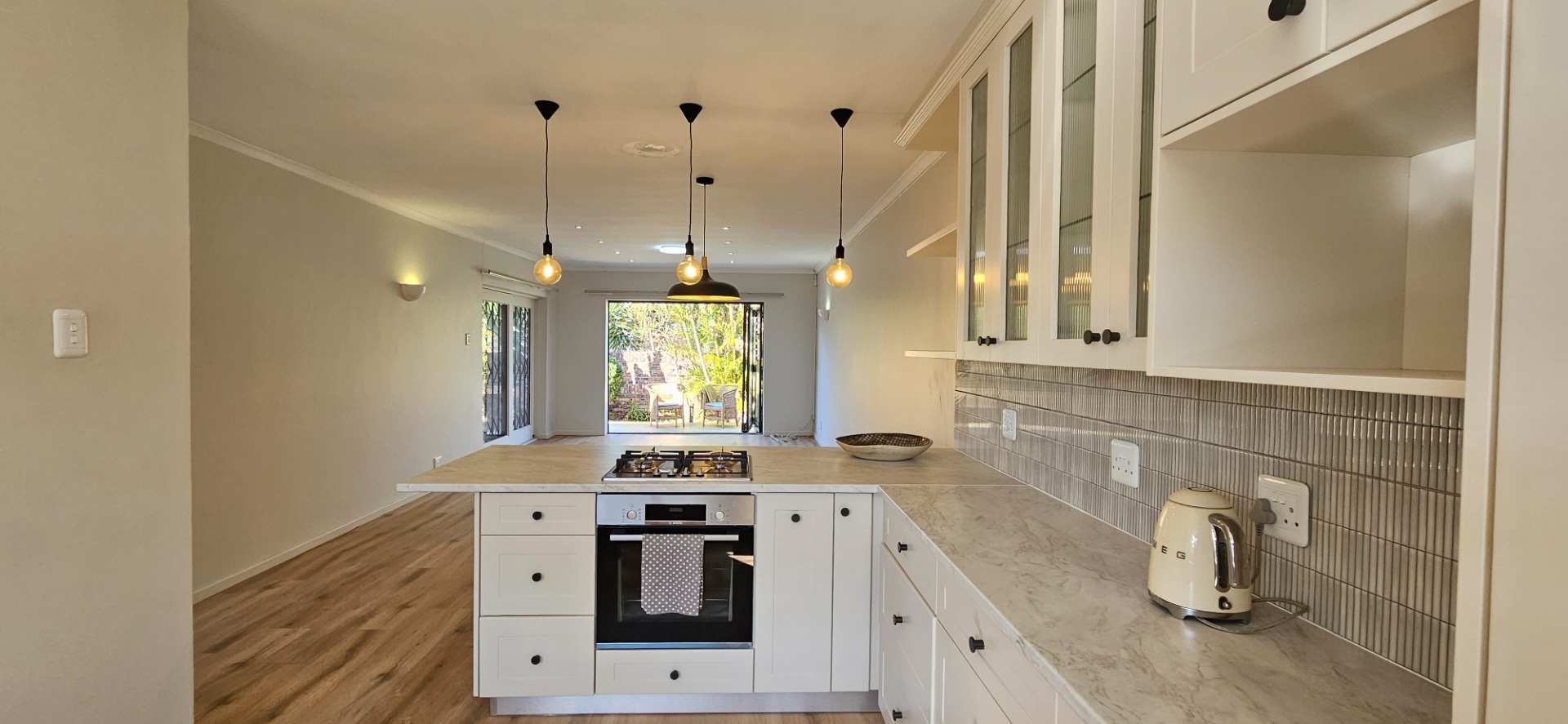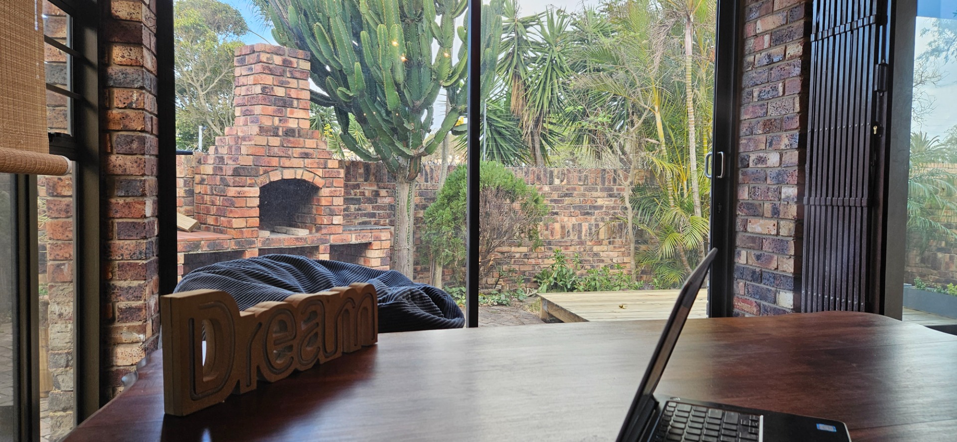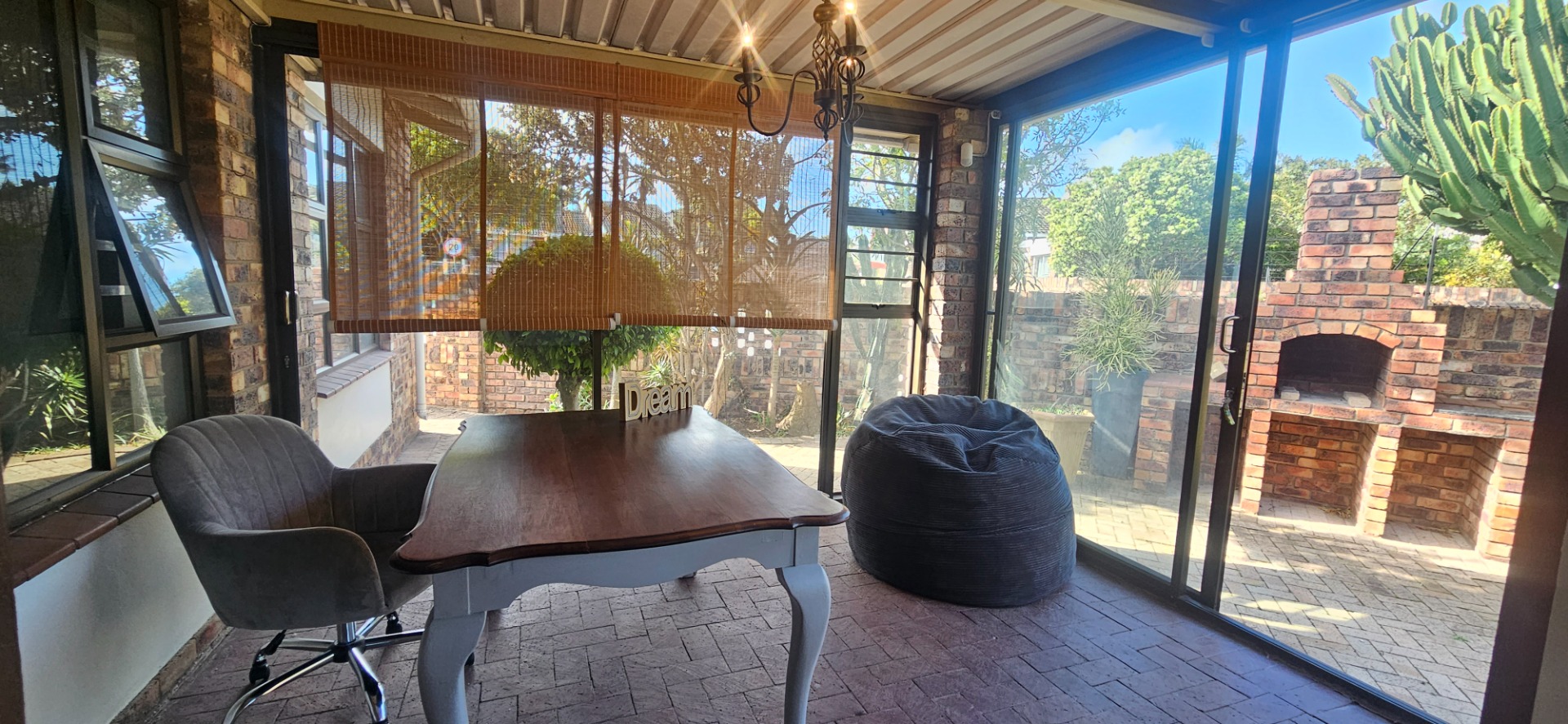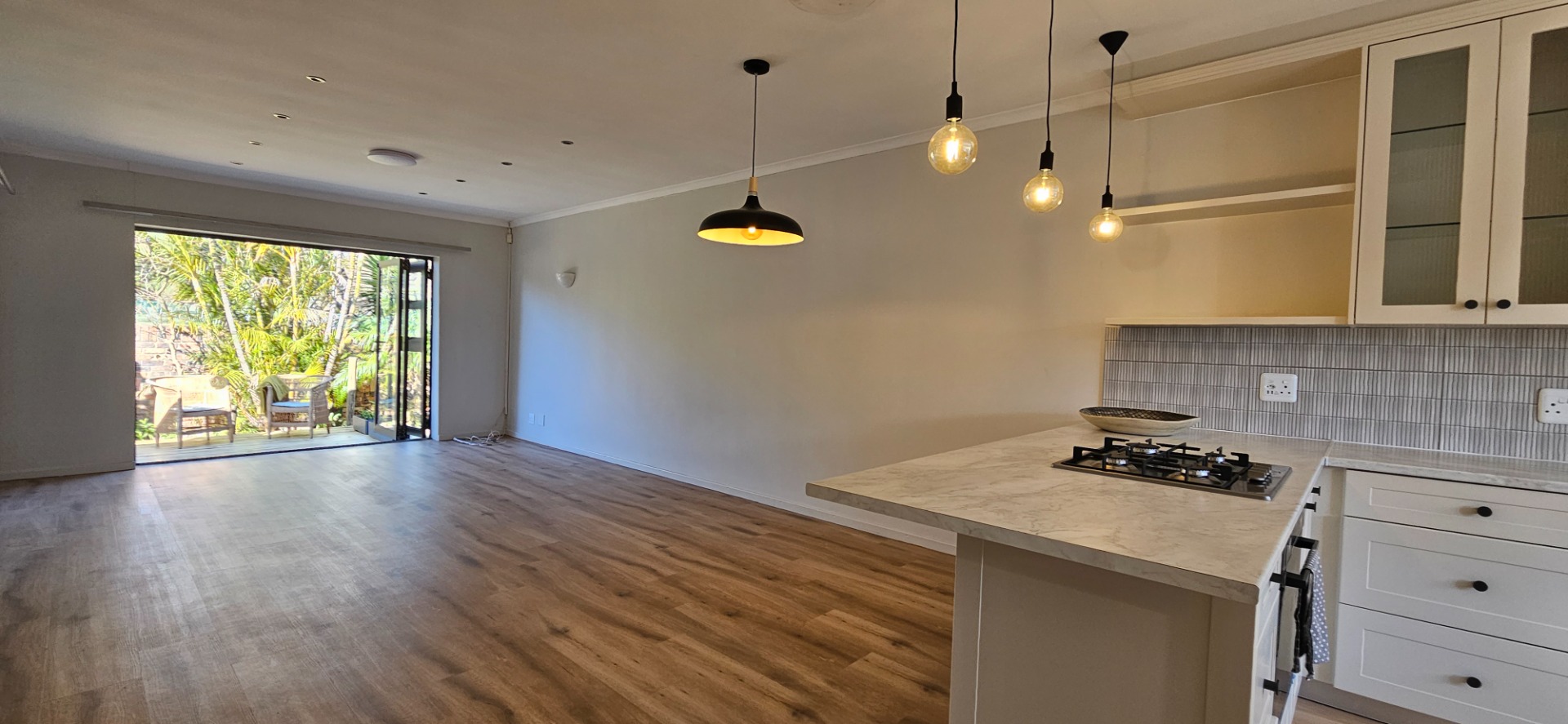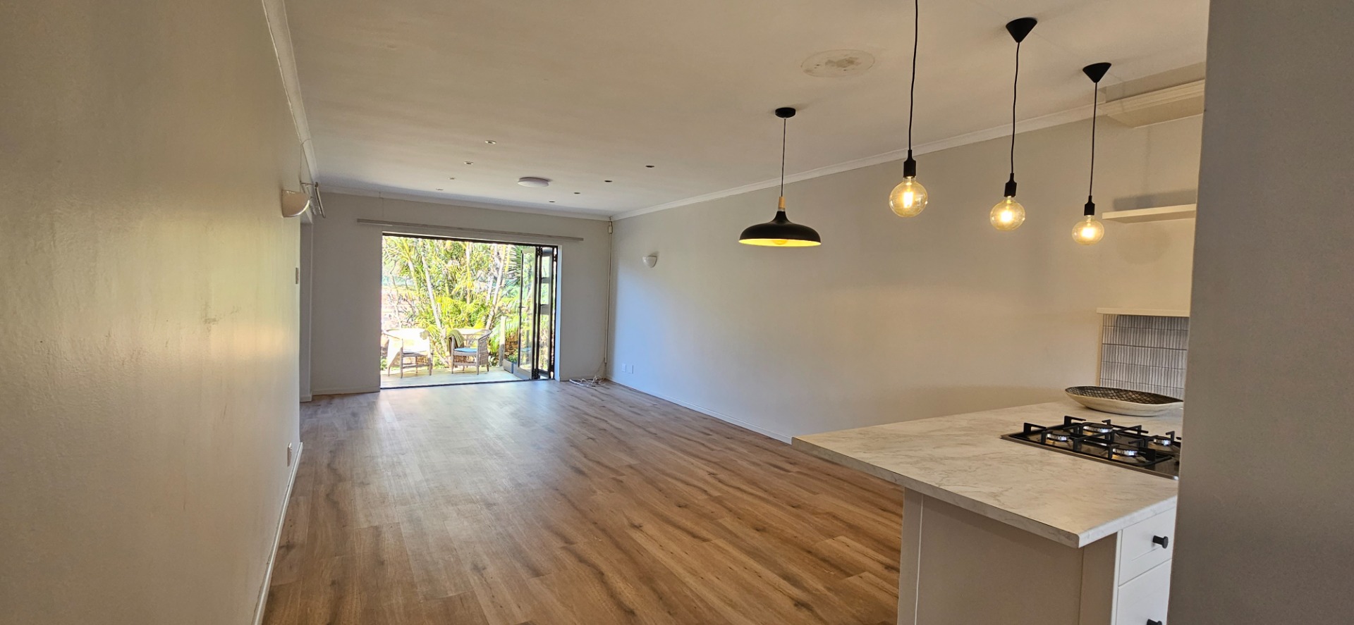 - Open-plan dining and lounge area with stacking doors leading to a wooden deck and small garden with outdoor braai area.