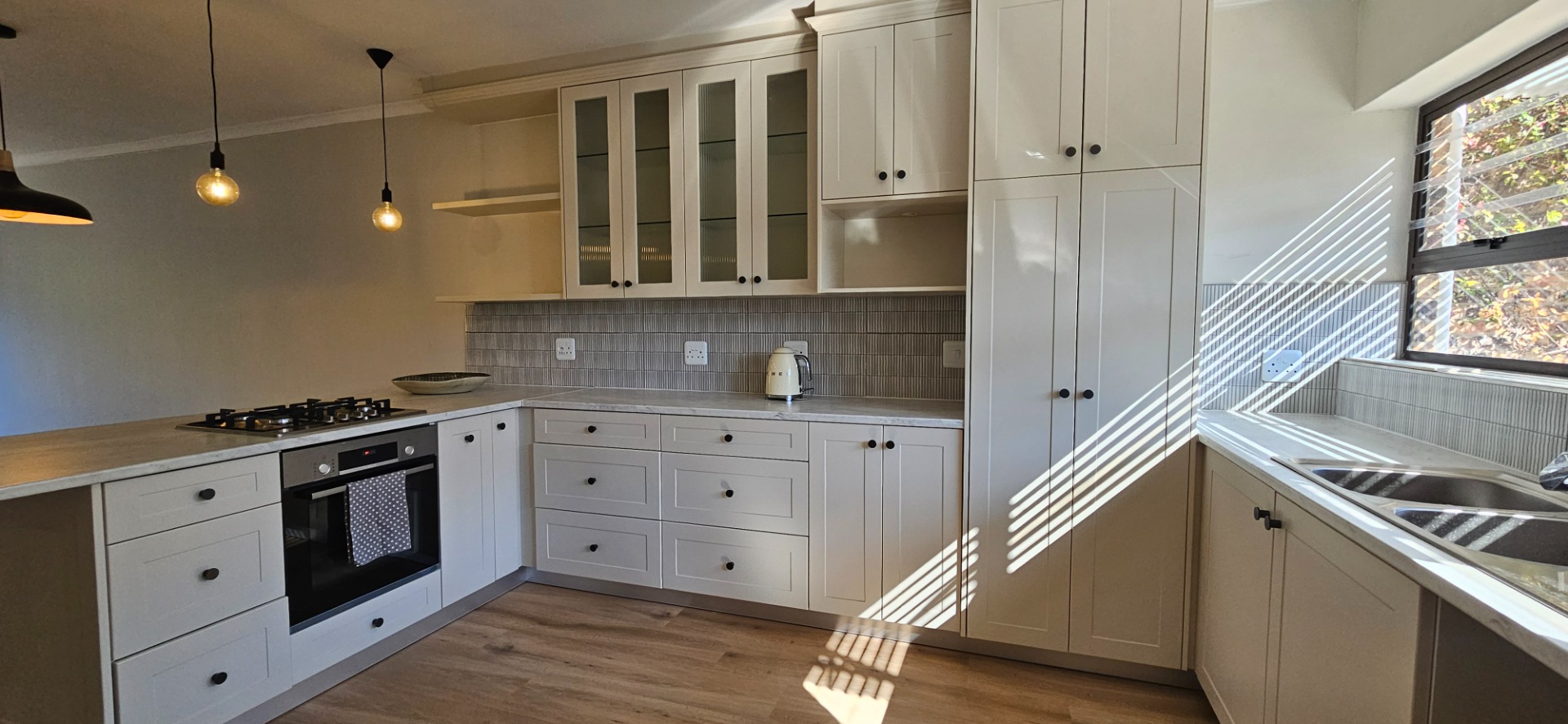 - Brand new kitchen with shaker door cupboards, space for a dishwasher , washing machine and double door fridge, newly fitted gas hob with electric oven