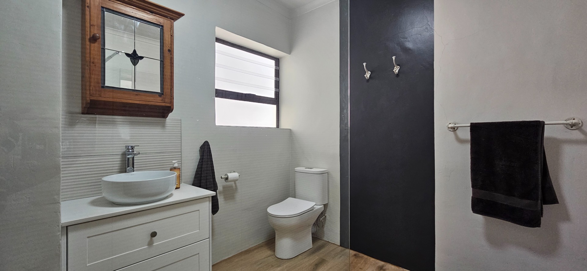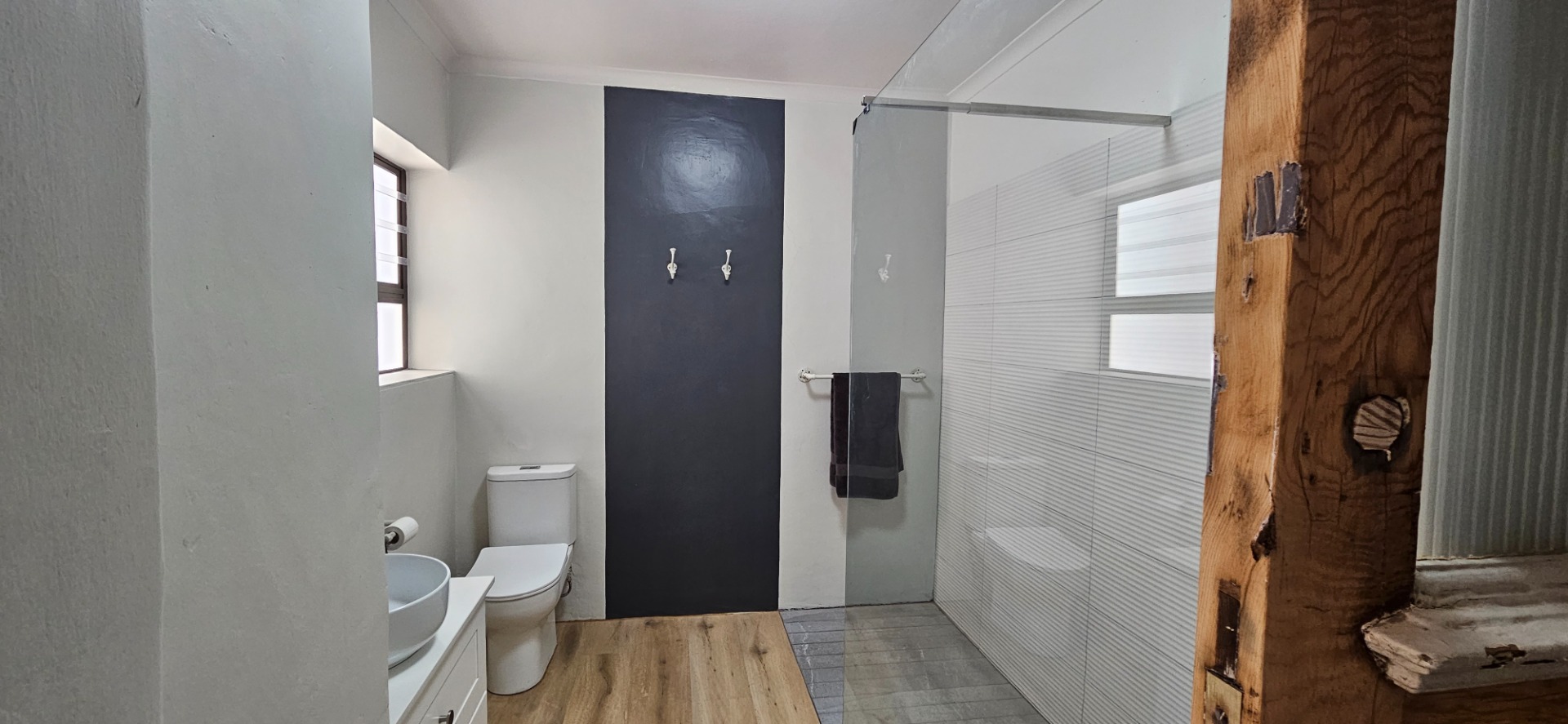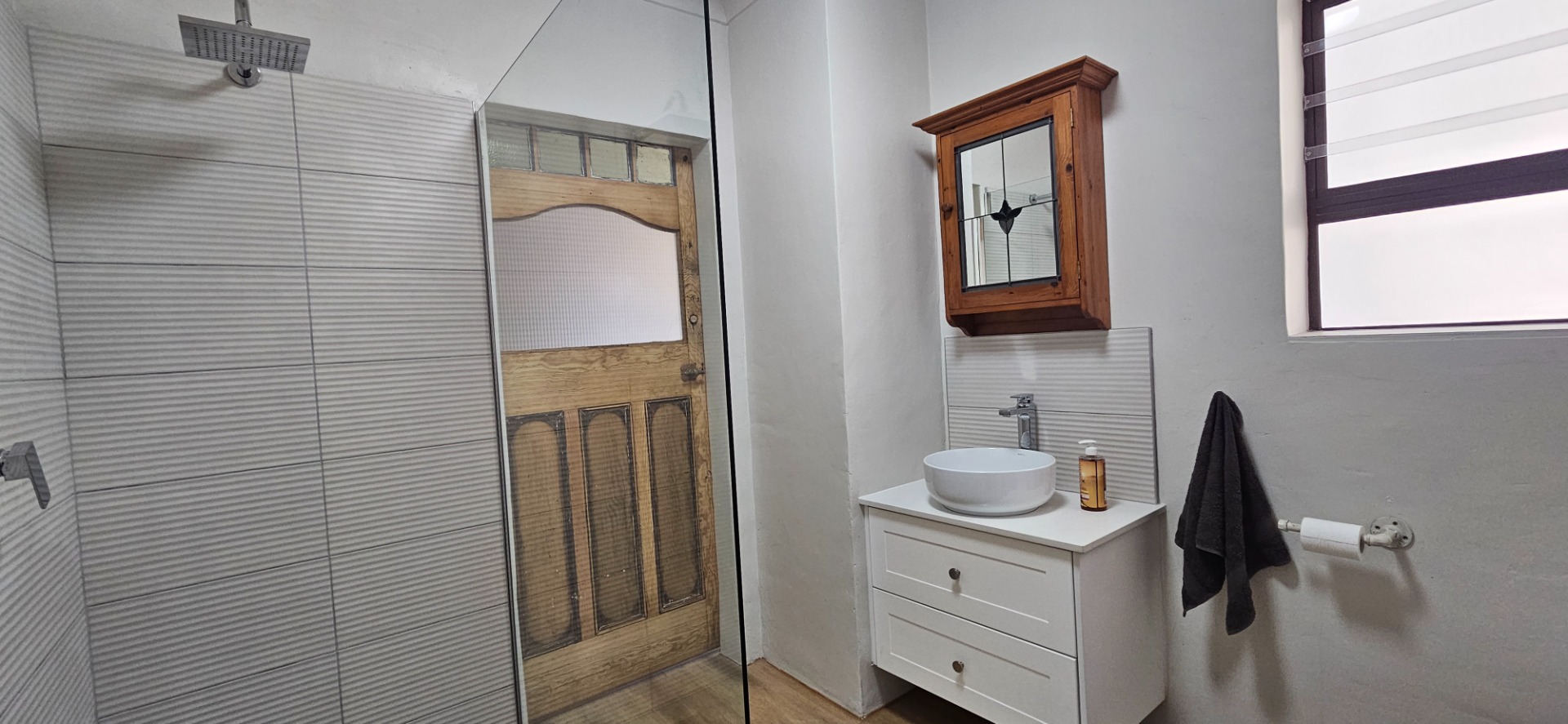 - Renovated bathroom with walk-in glass shower, basin un top of stone top with modern vanity