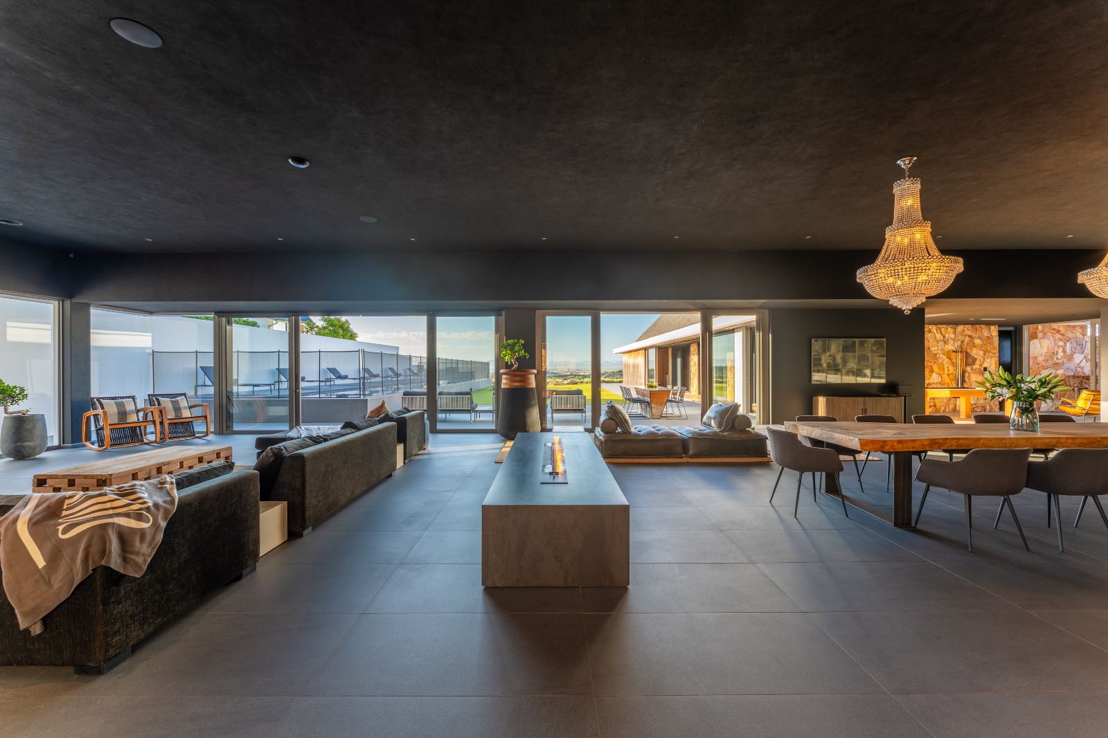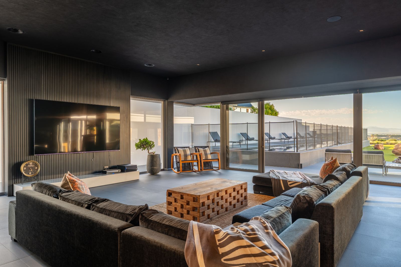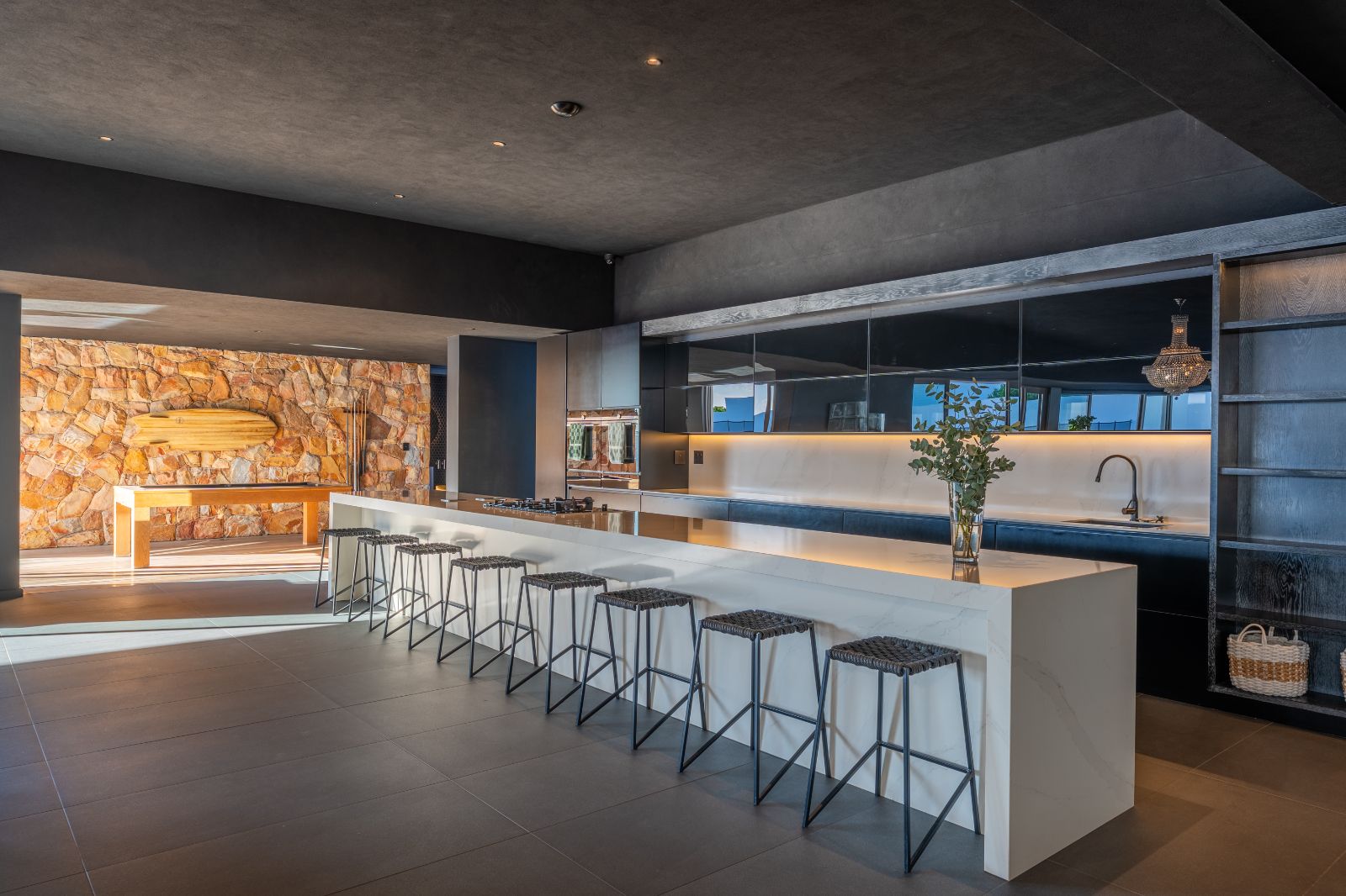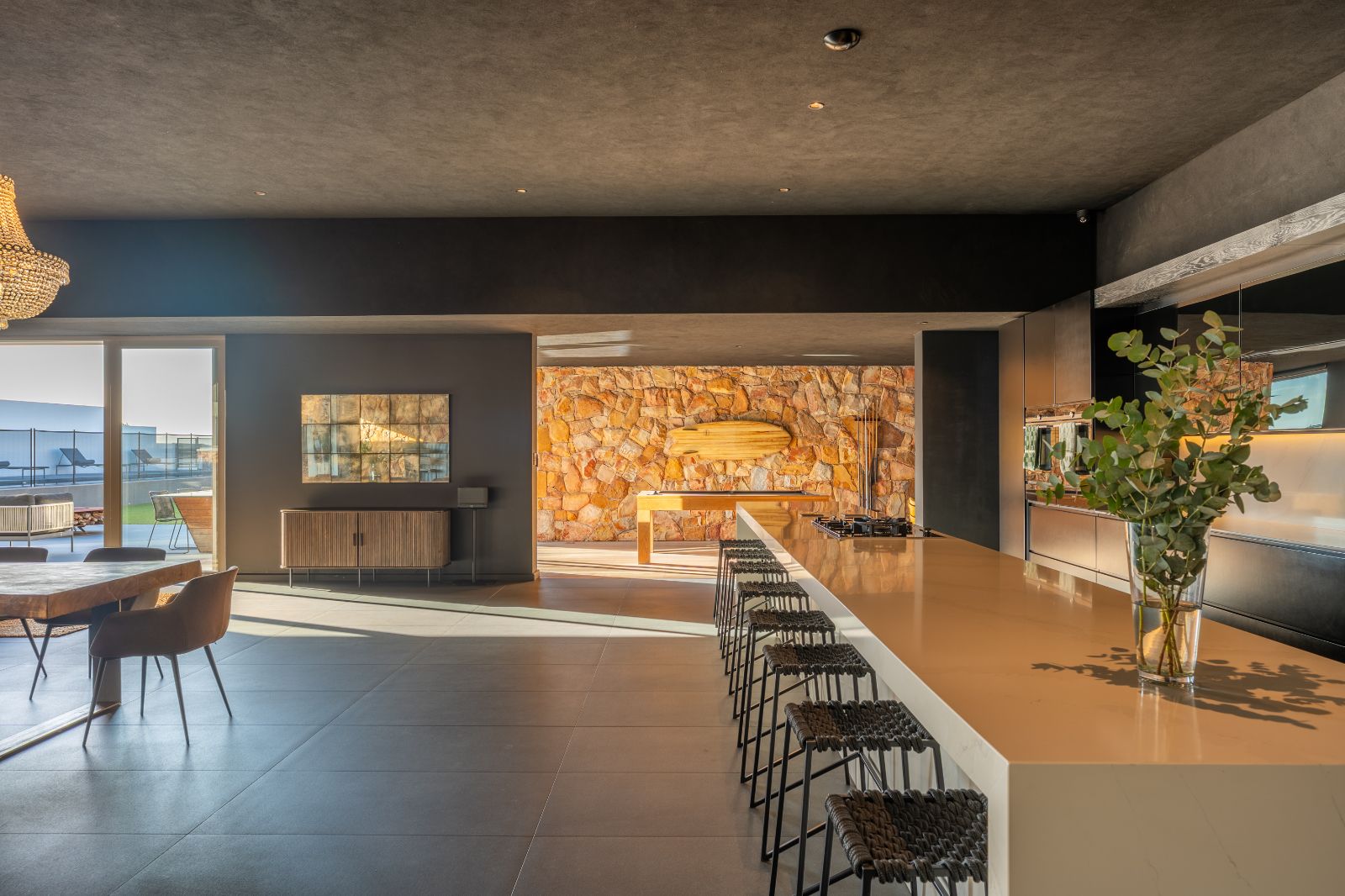 From the moment you enter, the home opens into an expansive open-plan living environment where the kitchen, dining room, lounge, bar and entertainment spaces flow seamlessly together. Aluminium stacker doors open the entire living area onto a dramatic deck and an extraordinary lap pool, creating a truly seamless indoor-outdoor lifestyle.