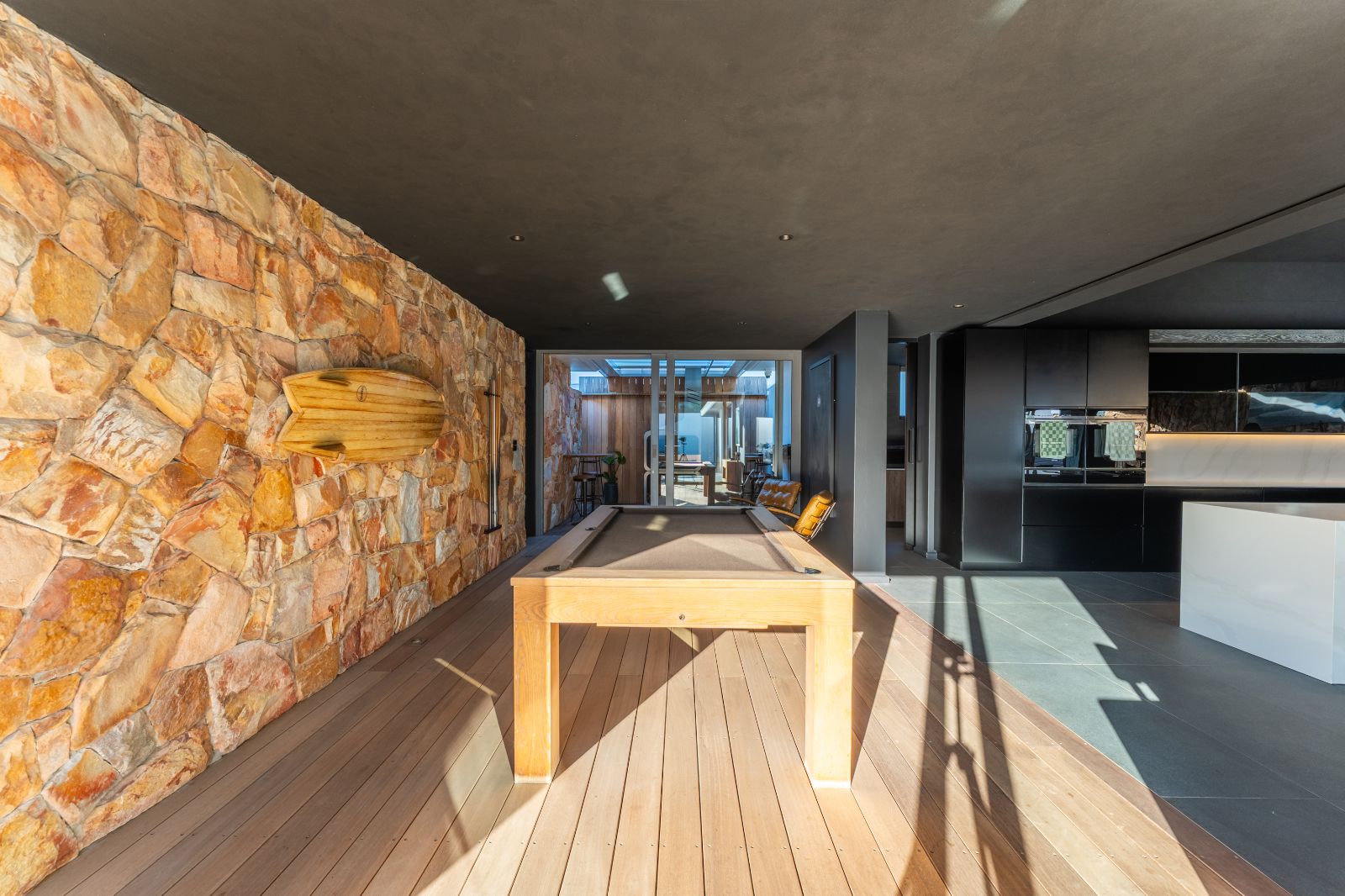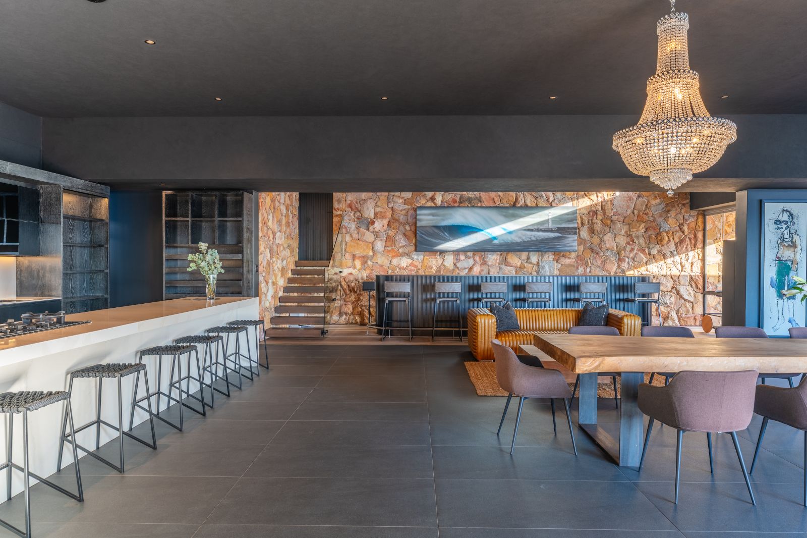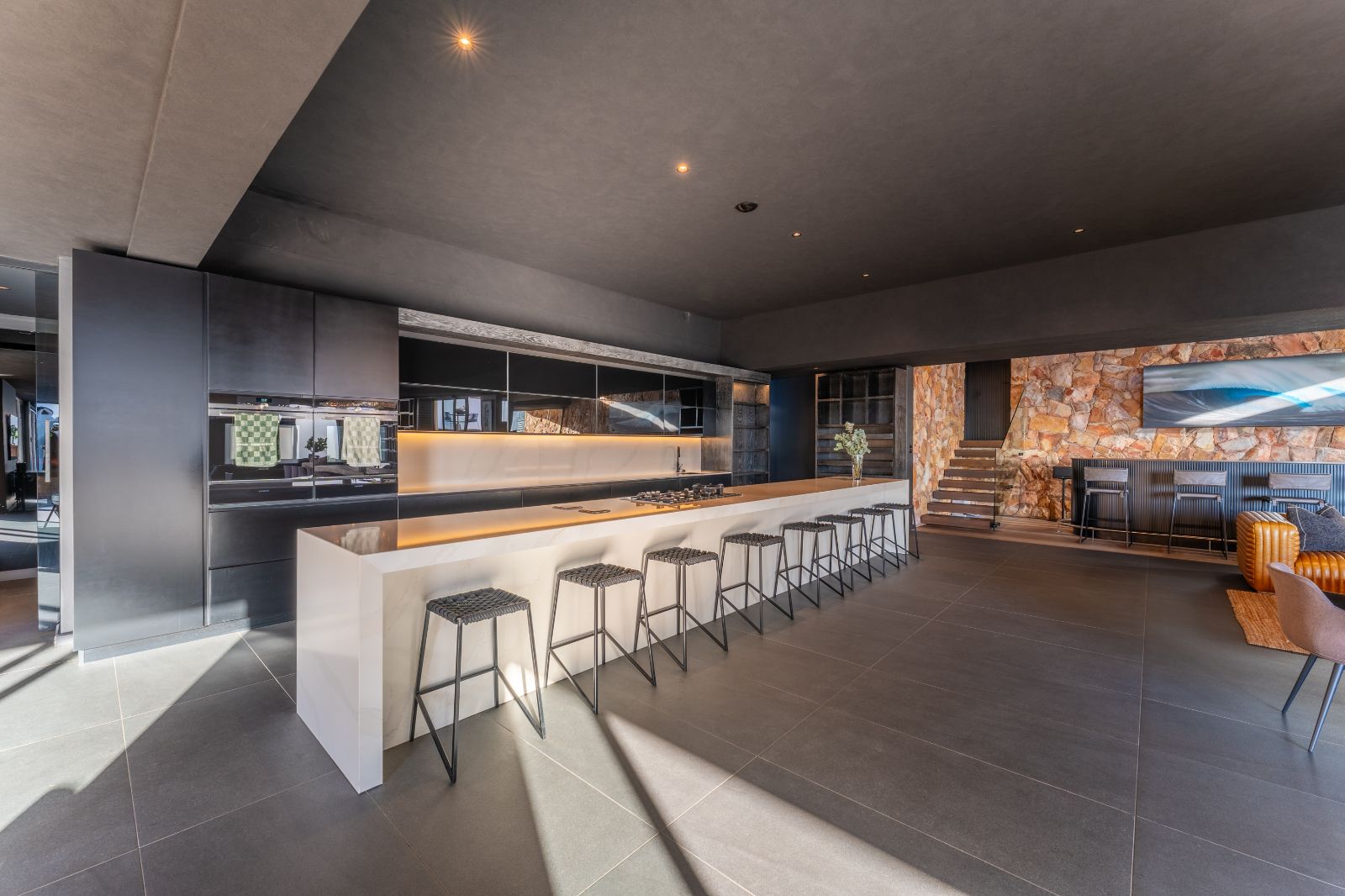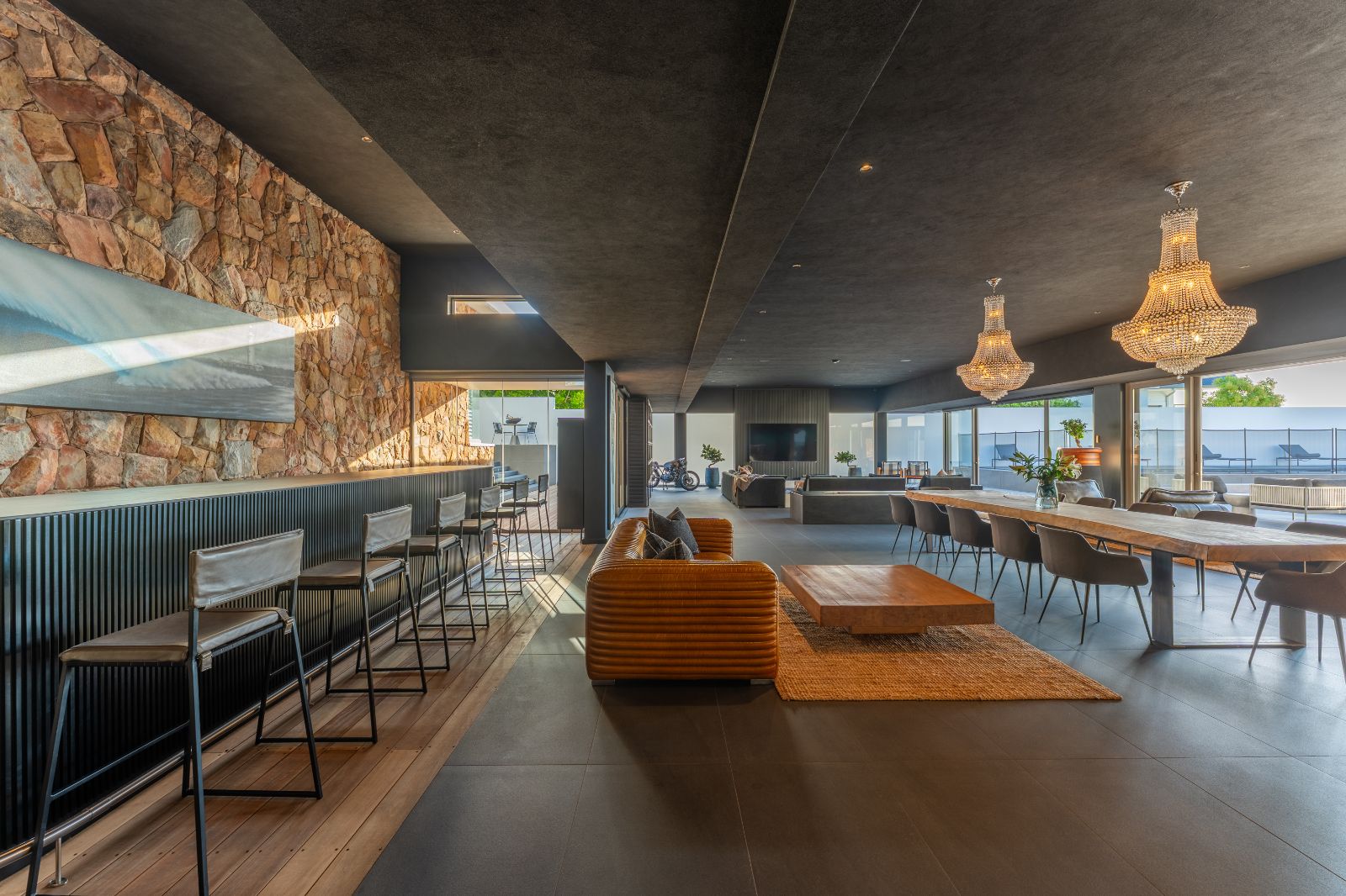From the moment you enter, the home opens into an expansive open-plan living environment where the kitchen, dining room, lounge, bar and entertainment spaces flow seamlessly together. Aluminium stacker doors open the entire living area onto a dramatic deck and an extraordinary lap pool, creating a truly seamless indoor-outdoor lifestyle.