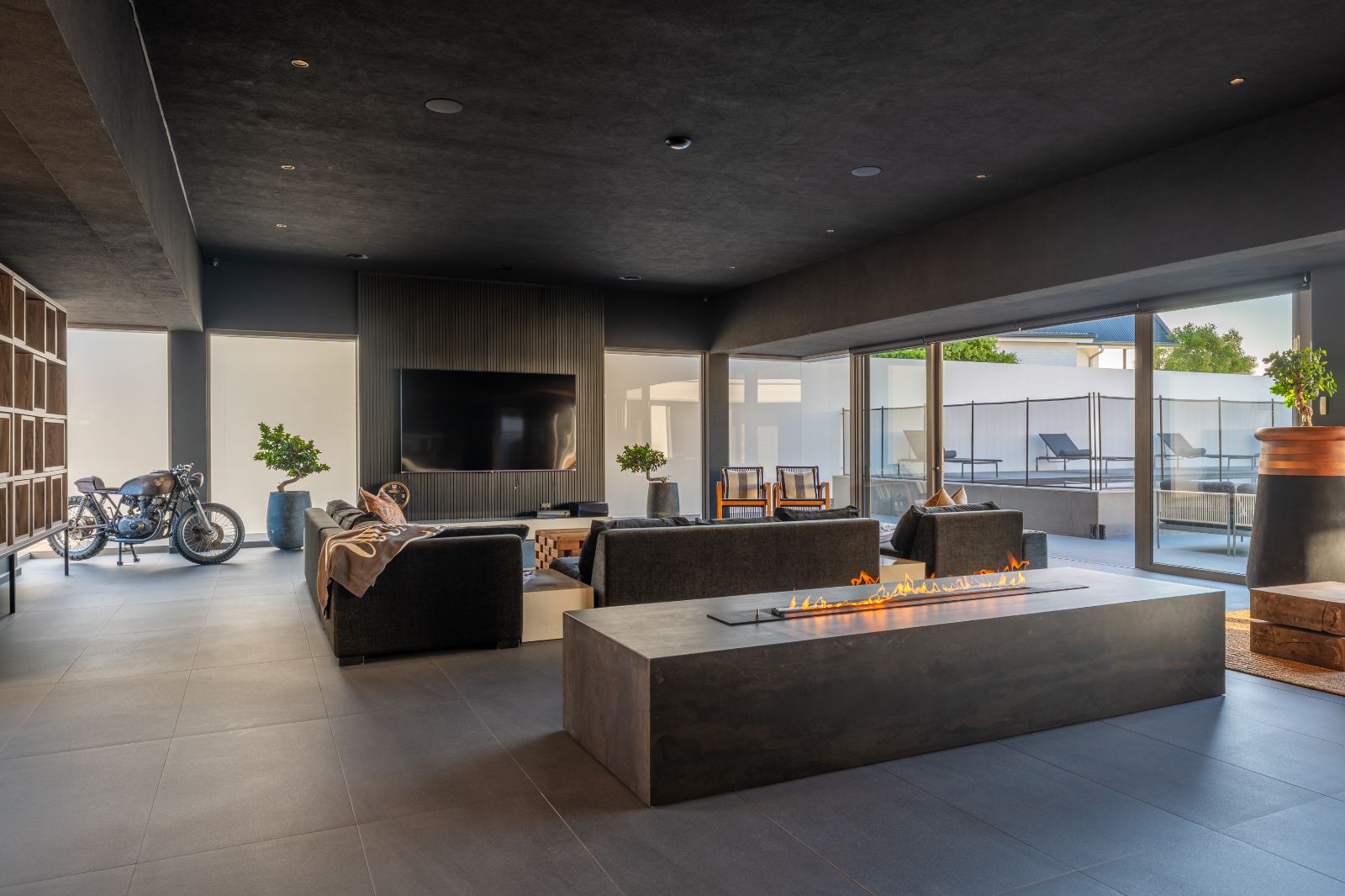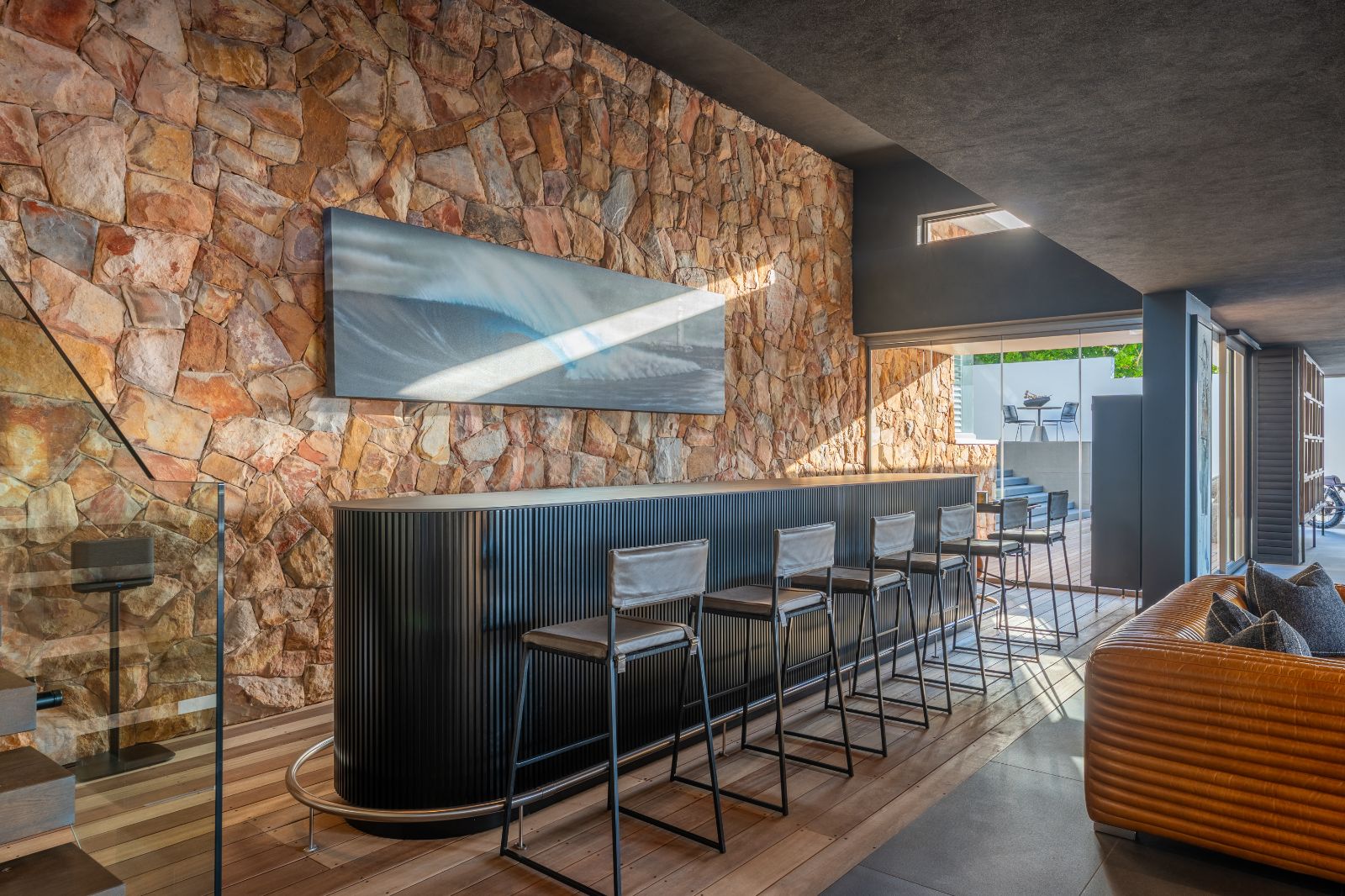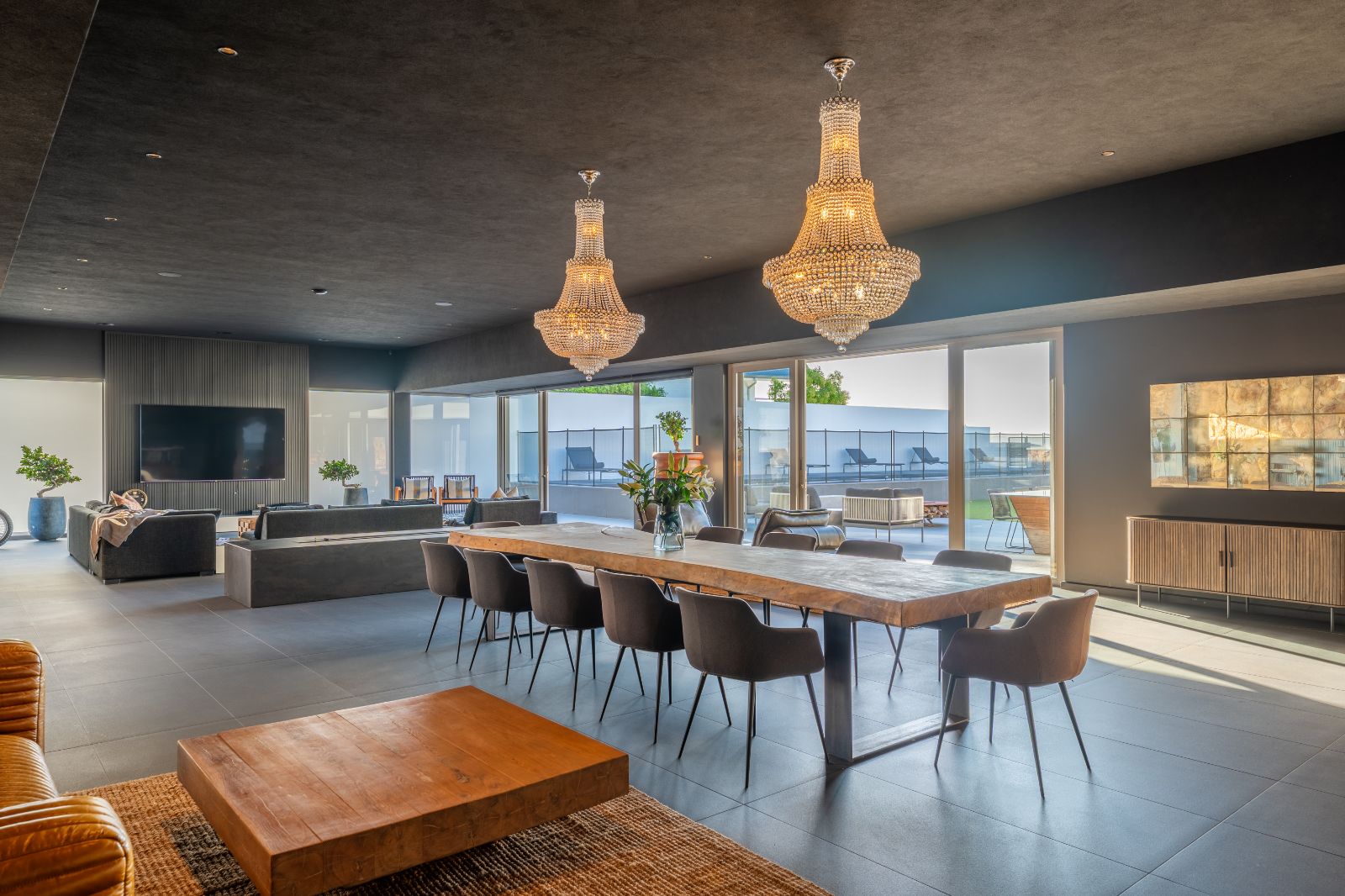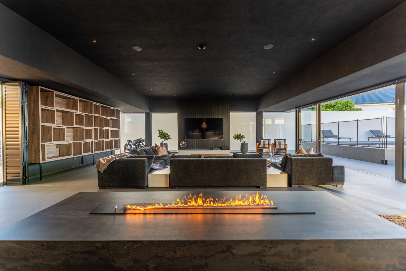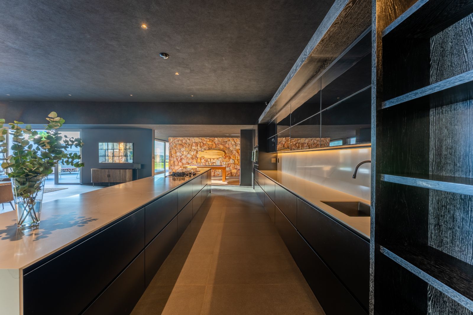 From the moment you enter, the home opens into an expansive open-plan living environment where the kitchen, dining room, lounge, bar and entertainment spaces flow seamlessly together. Aluminium stacker doors open the entire living area onto a dramatic deck and an extraordinary lap pool, creating a truly seamless indoor-outdoor lifestyle.