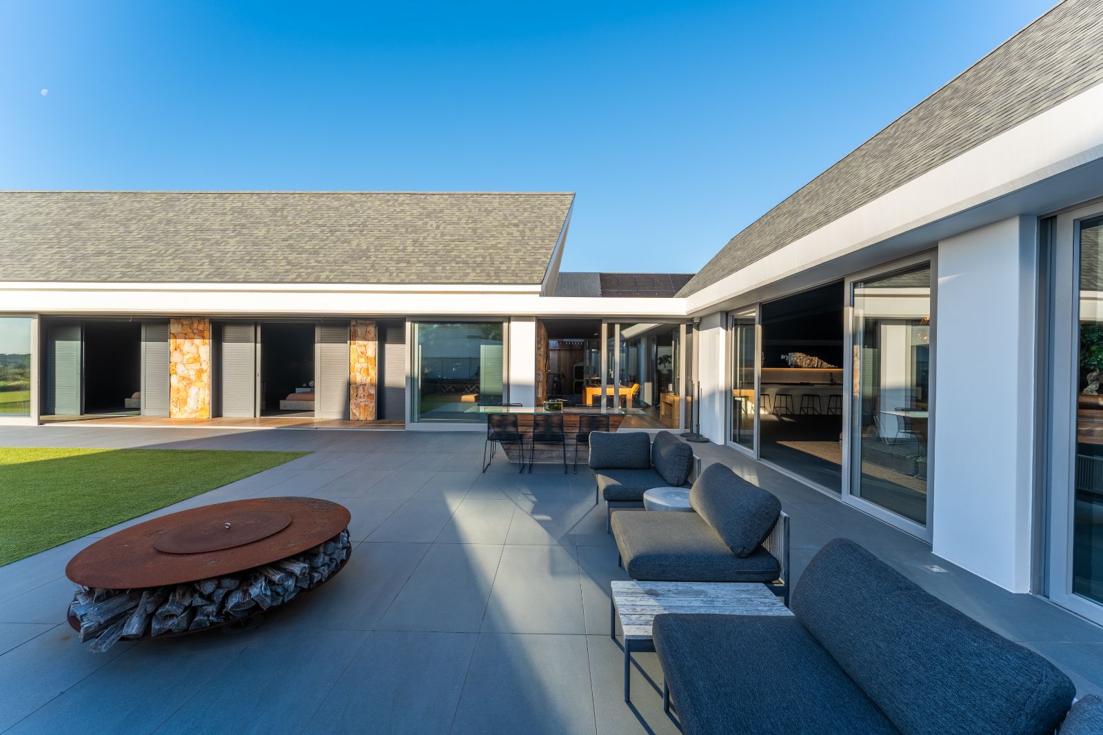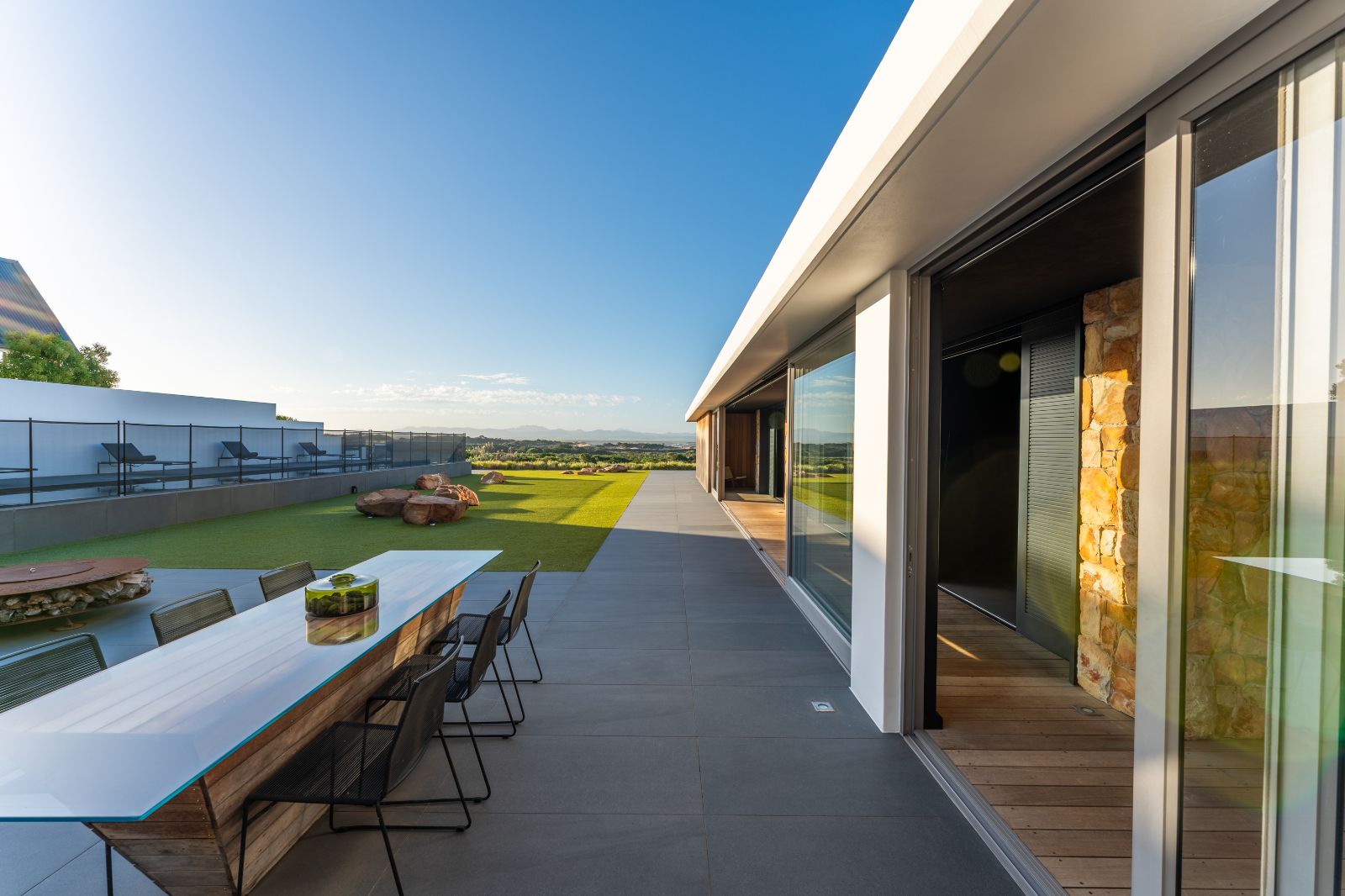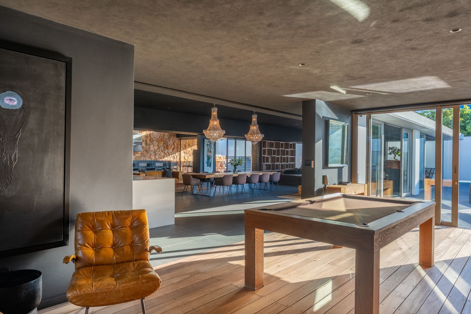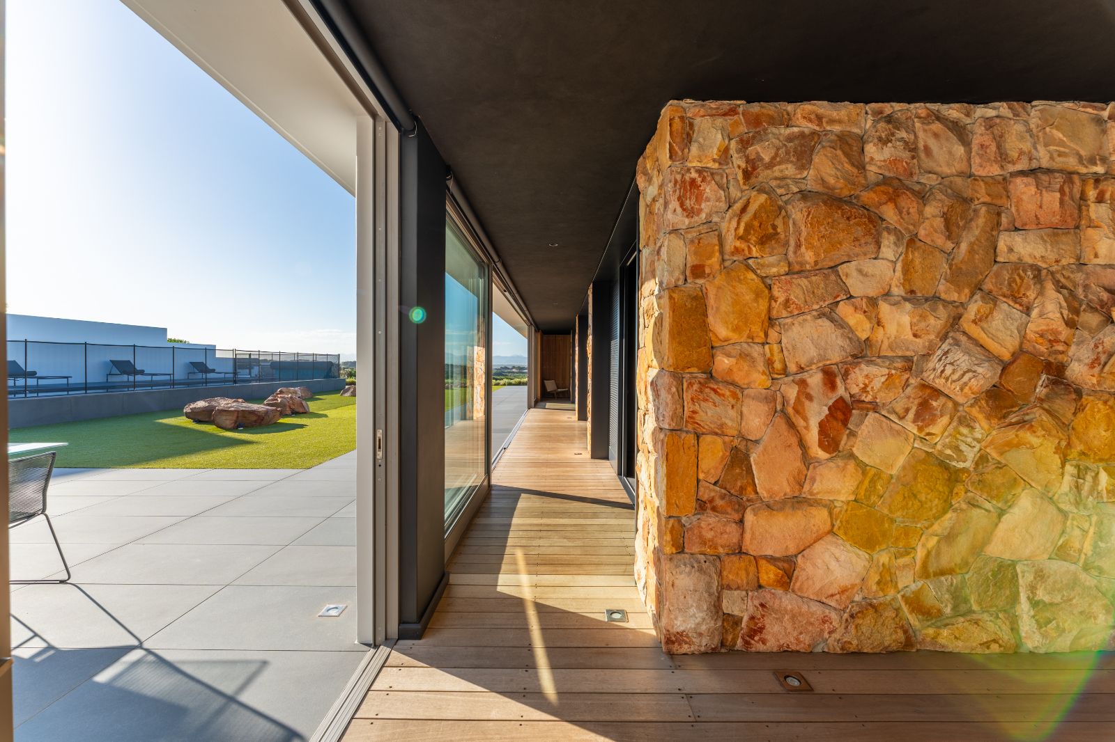 From the moment you enter, the home opens into an expansive open-plan living environment where the kitchen, dining room, lounge, bar and entertainment spaces flow seamlessly together. Aluminium stacker doors open the entire living area onto a dramatic deck and an extraordinary lap pool, creating a truly seamless indoor-outdoor lifestyle.