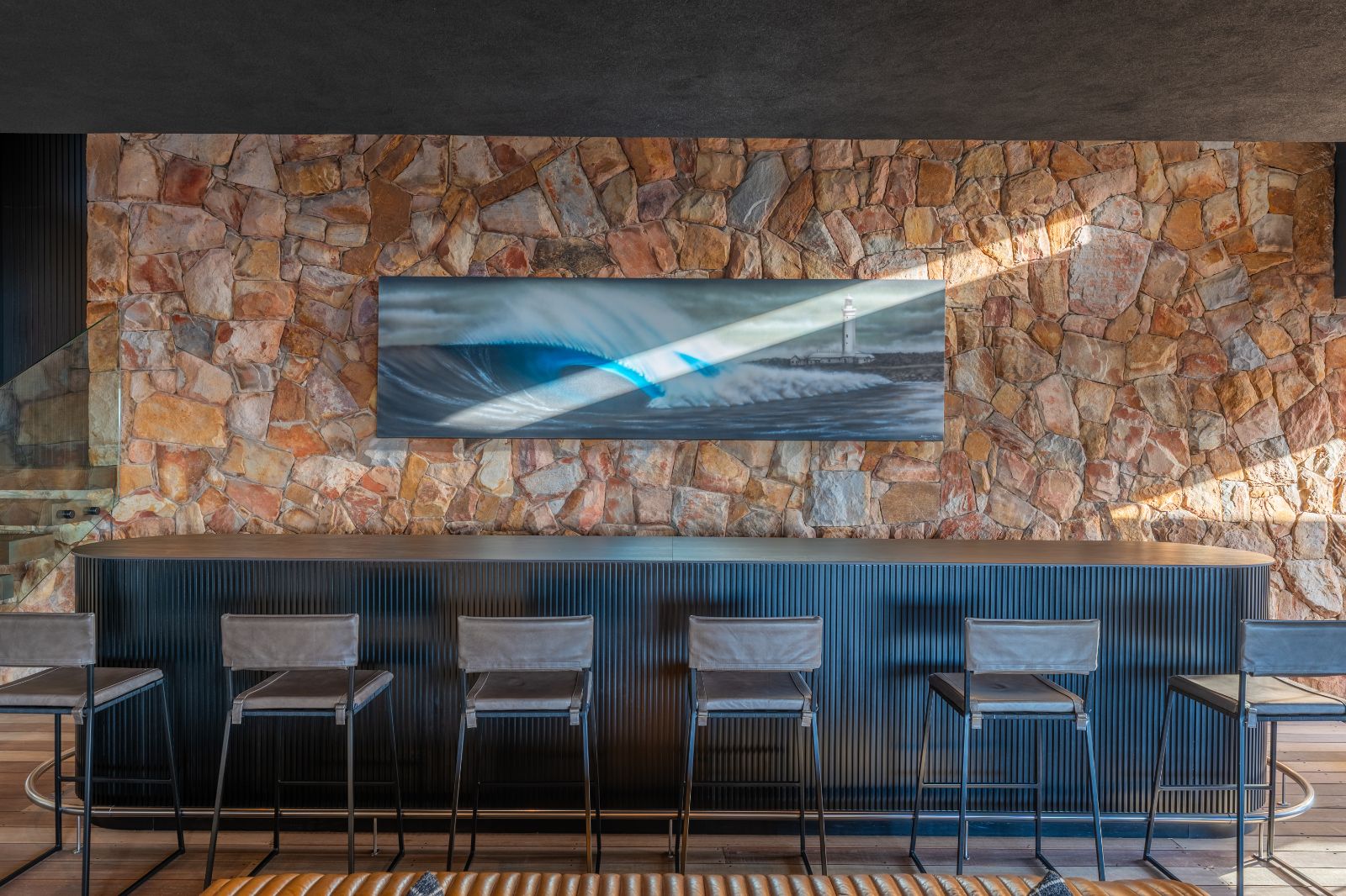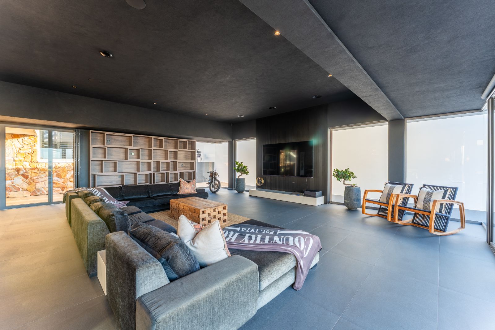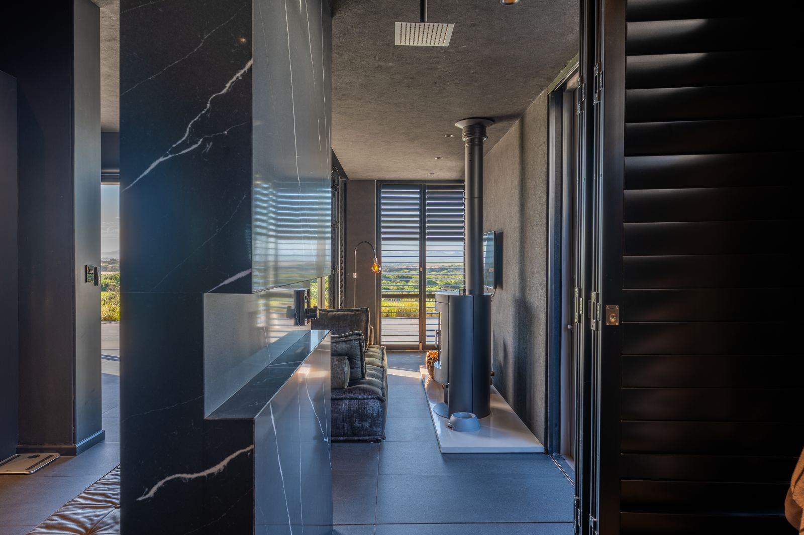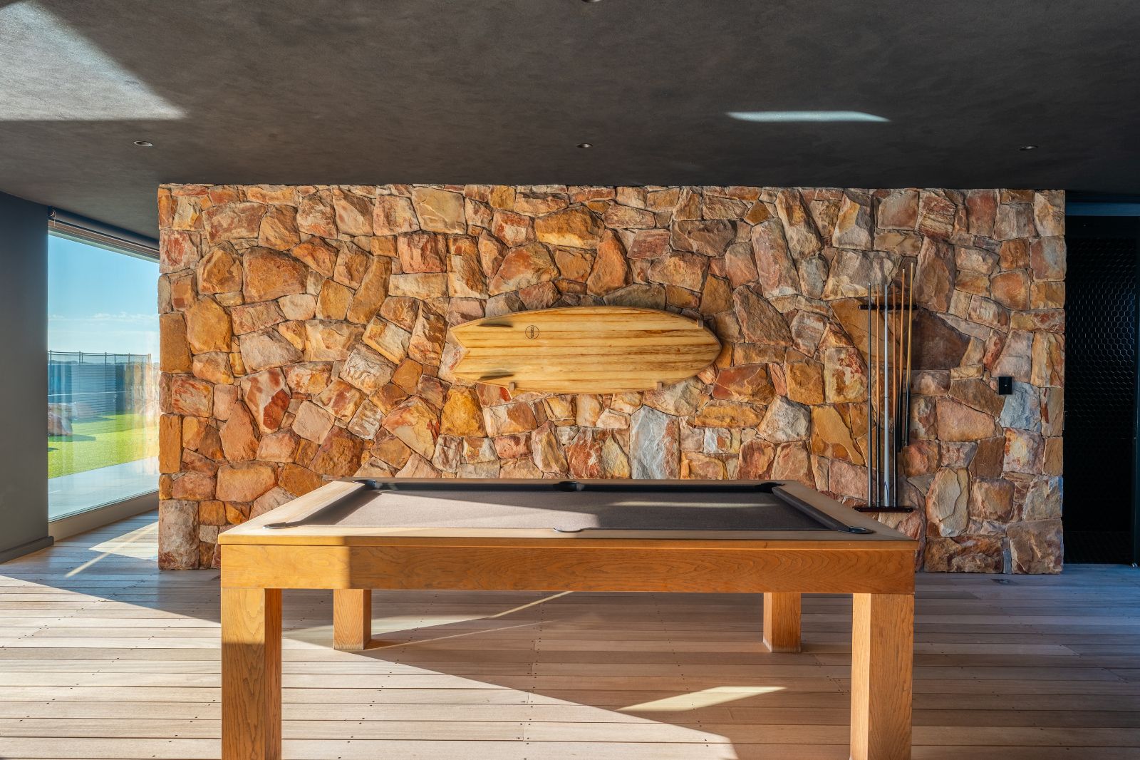 From the moment you enter, the home opens into an expansive open-plan living environment where the kitchen, dining room, lounge, bar and entertainment spaces flow seamlessly together. Aluminium stacker doors open the entire living area onto a dramatic deck and an extraordinary lap pool, creating a truly seamless indoor-outdoor lifestyle.
