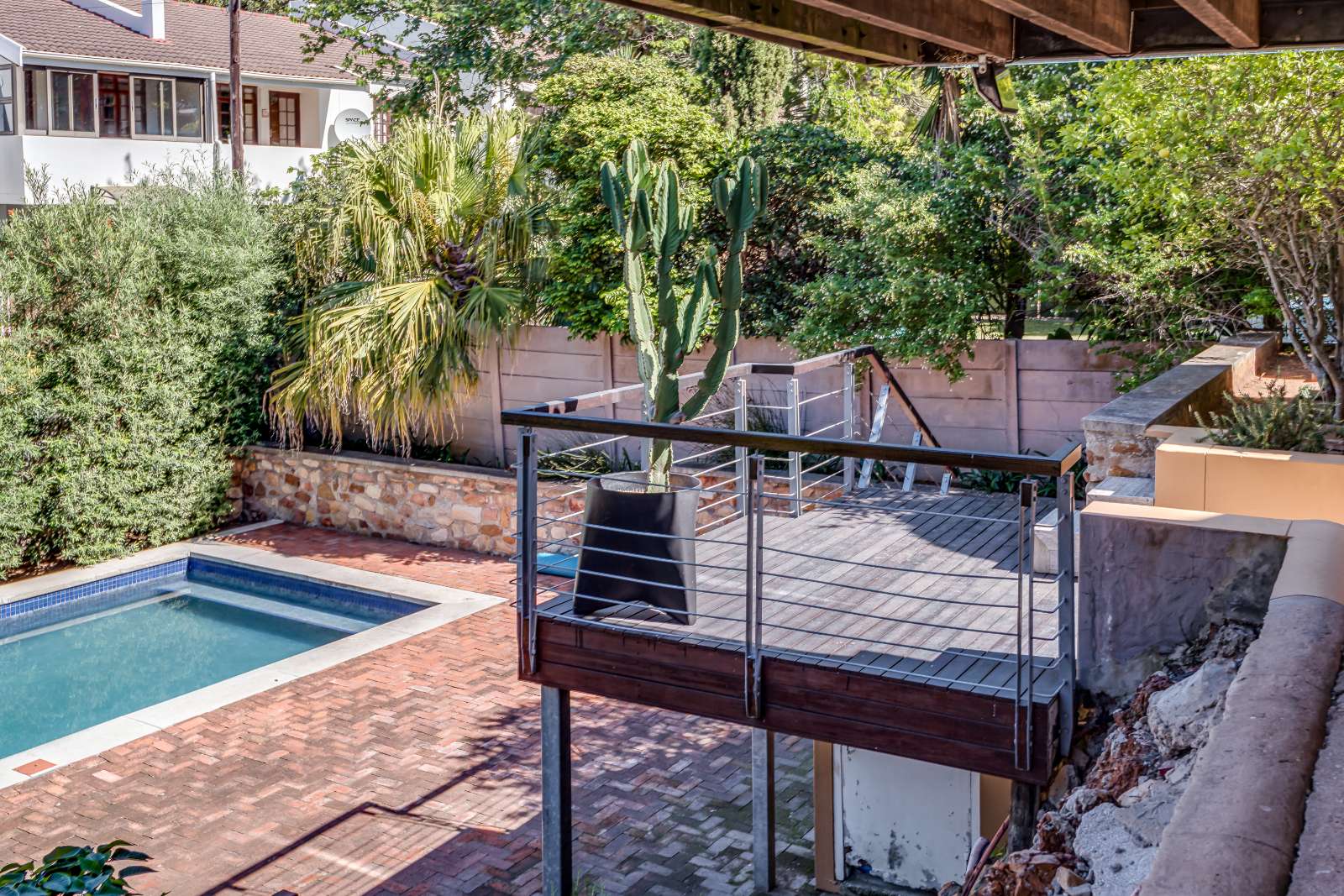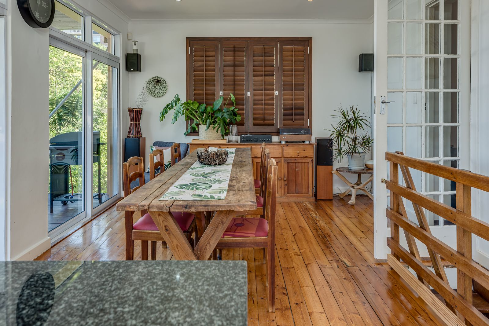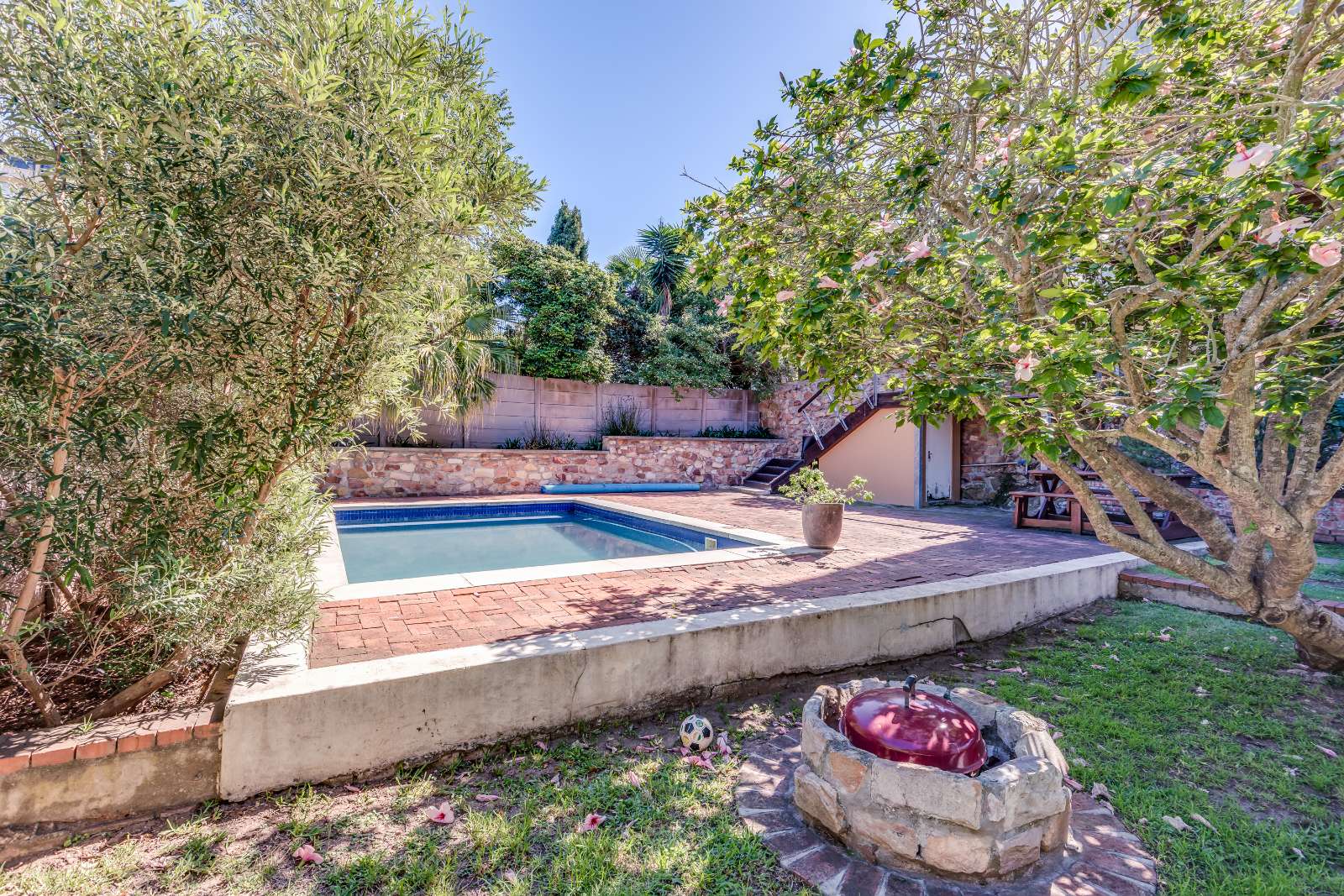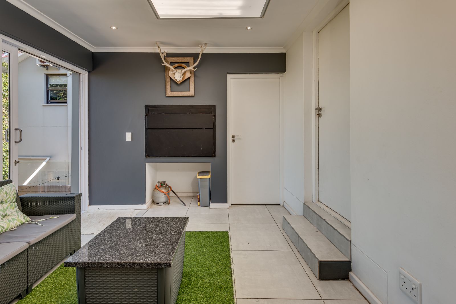 Glass sliding doors open from this space onto a balcony, creating an effortless extension of the dining and kitchen area, ideal for entertaining. This elevated outdoor space is currently used with a portable braai and enjoys lovely views over the pool and garden below. A separate braai room on this level further enhances the home’s entertainment offering.