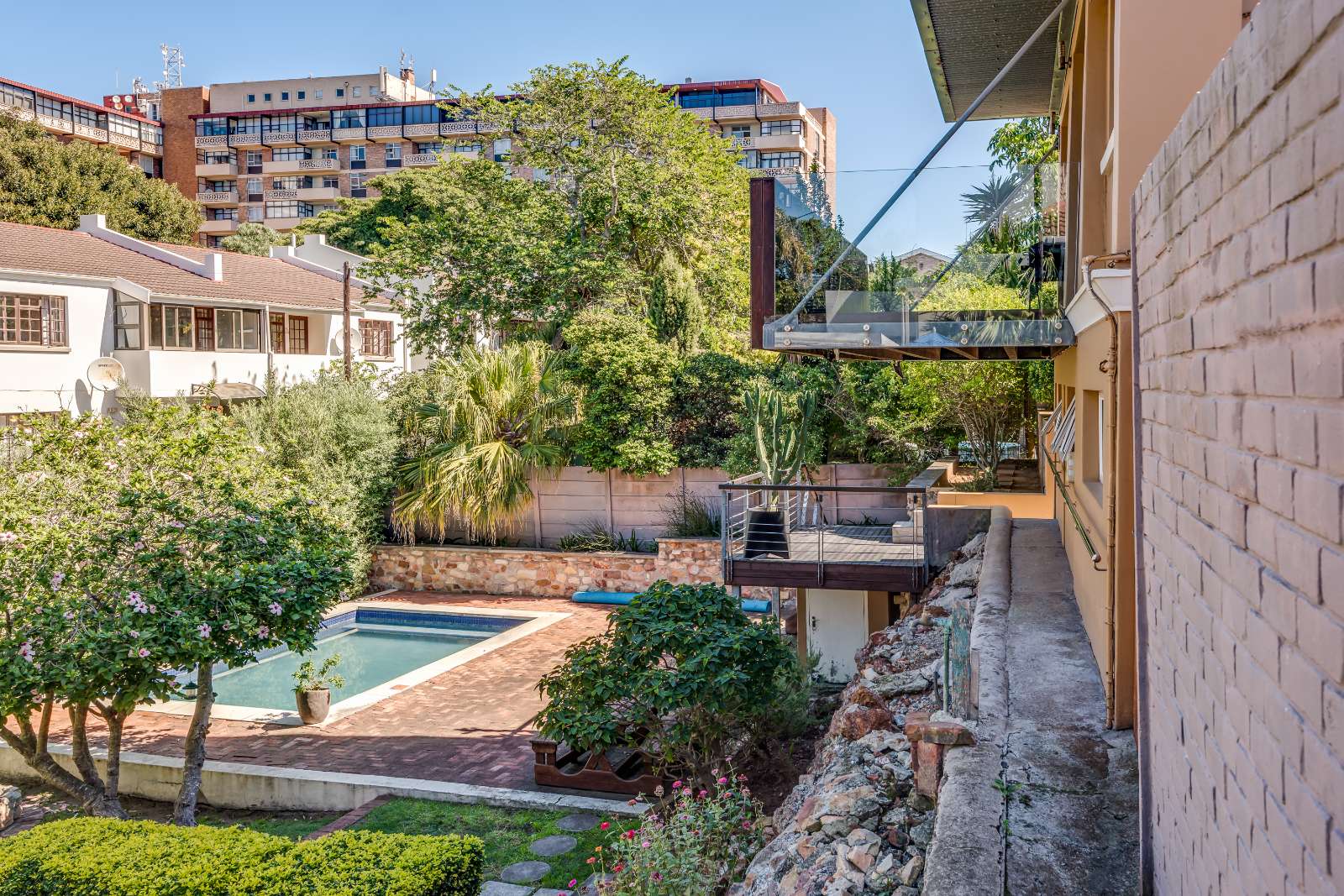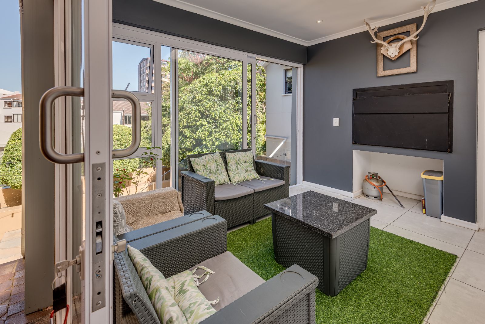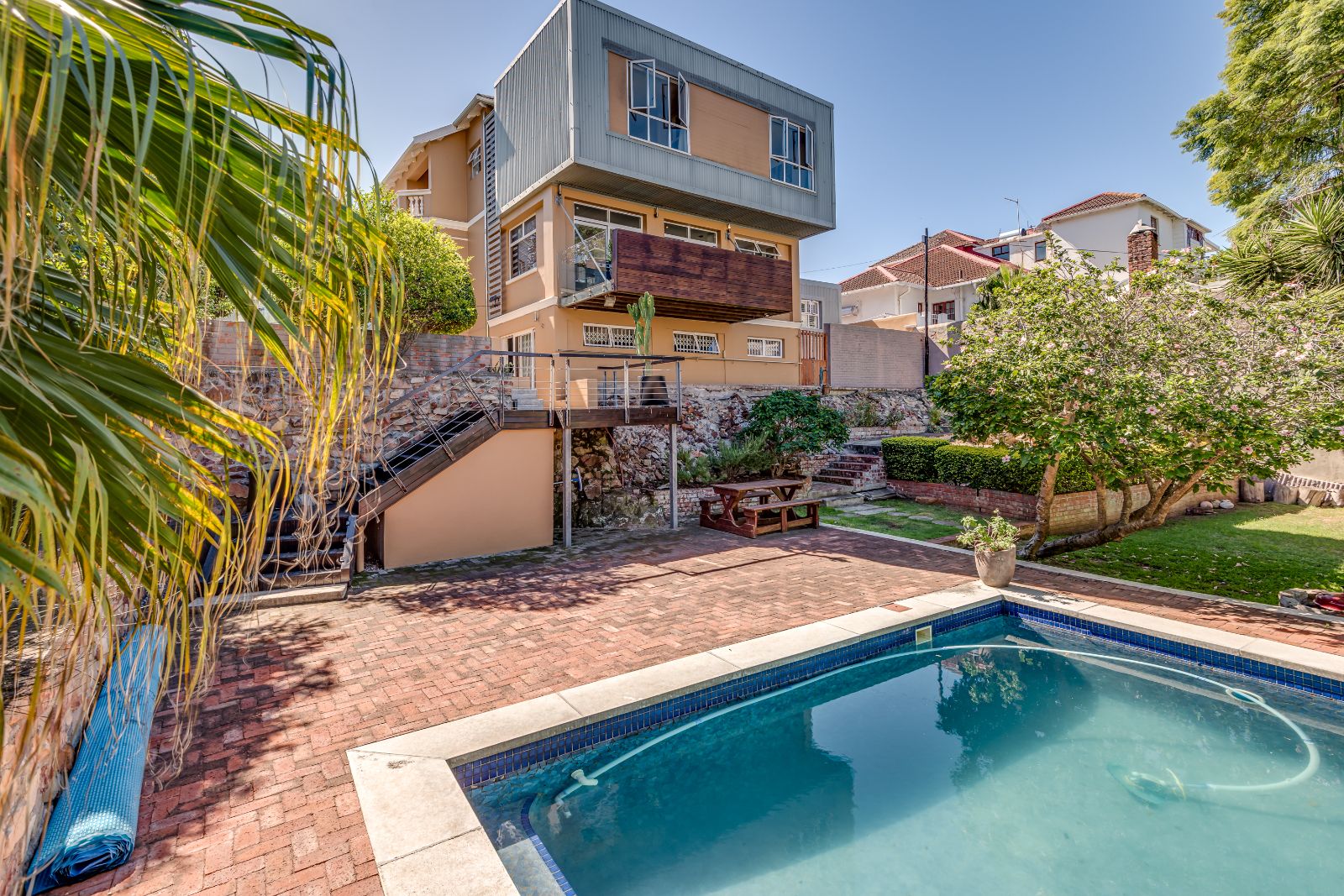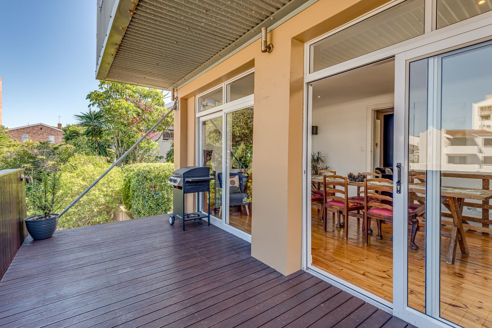 Glass sliding doors open from this space onto a balcony, creating an effortless extension of the dining and kitchen area, ideal for entertaining. This elevated outdoor space is currently used with a portable braai and enjoys lovely views over the pool and garden below. A separate braai room on this level further enhances the home’s entertainment offering.