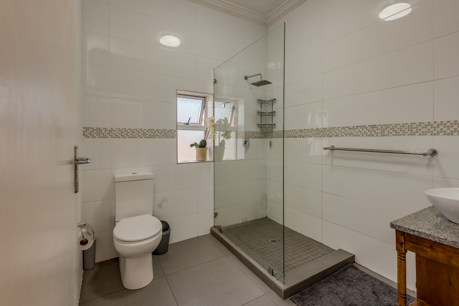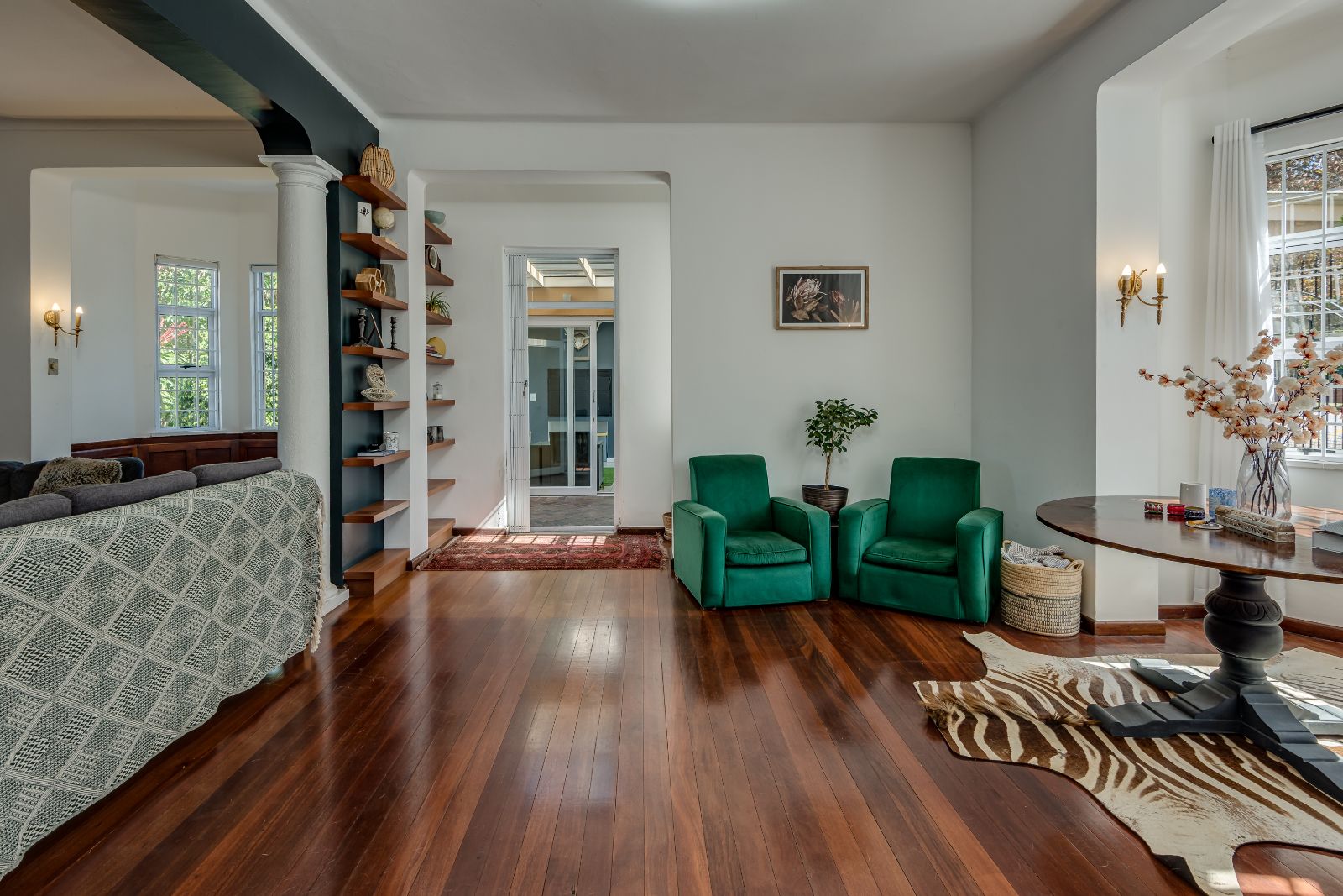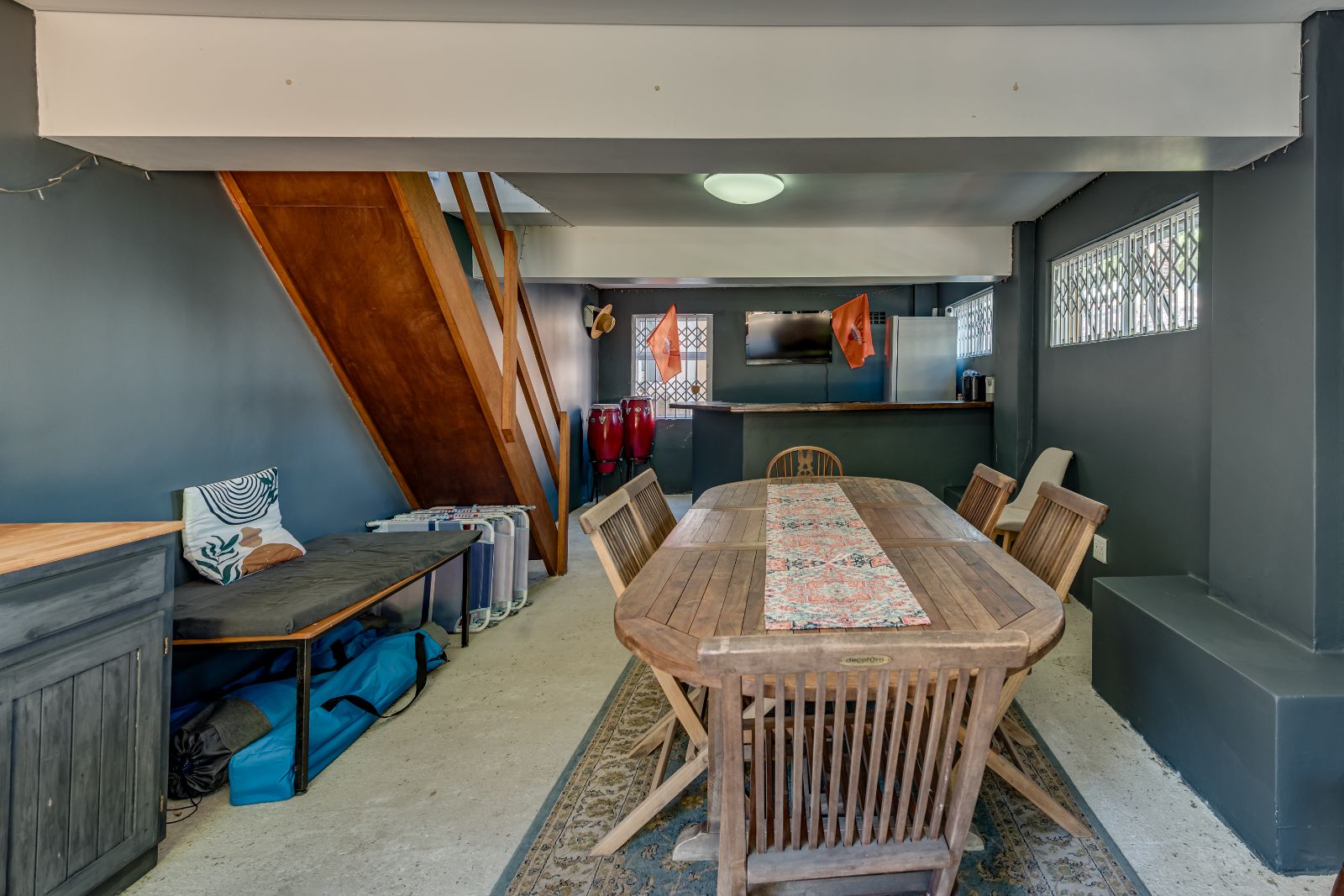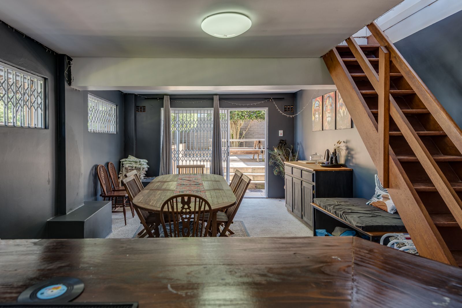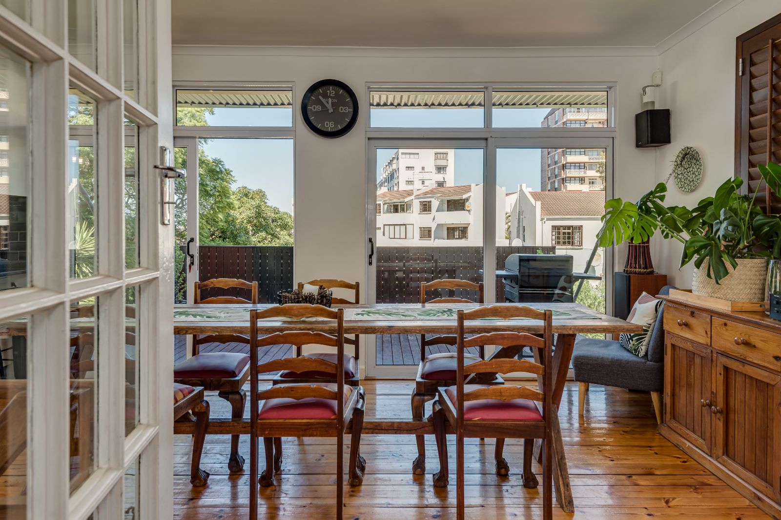 Glass sliding doors open from this space onto a balcony, creating an effortless extension of the dining and kitchen area, ideal for entertaining. This elevated outdoor space is currently used with a portable braai and enjoys lovely views over the pool and garden below. A separate braai room on this level further enhances the home’s entertainment offering.