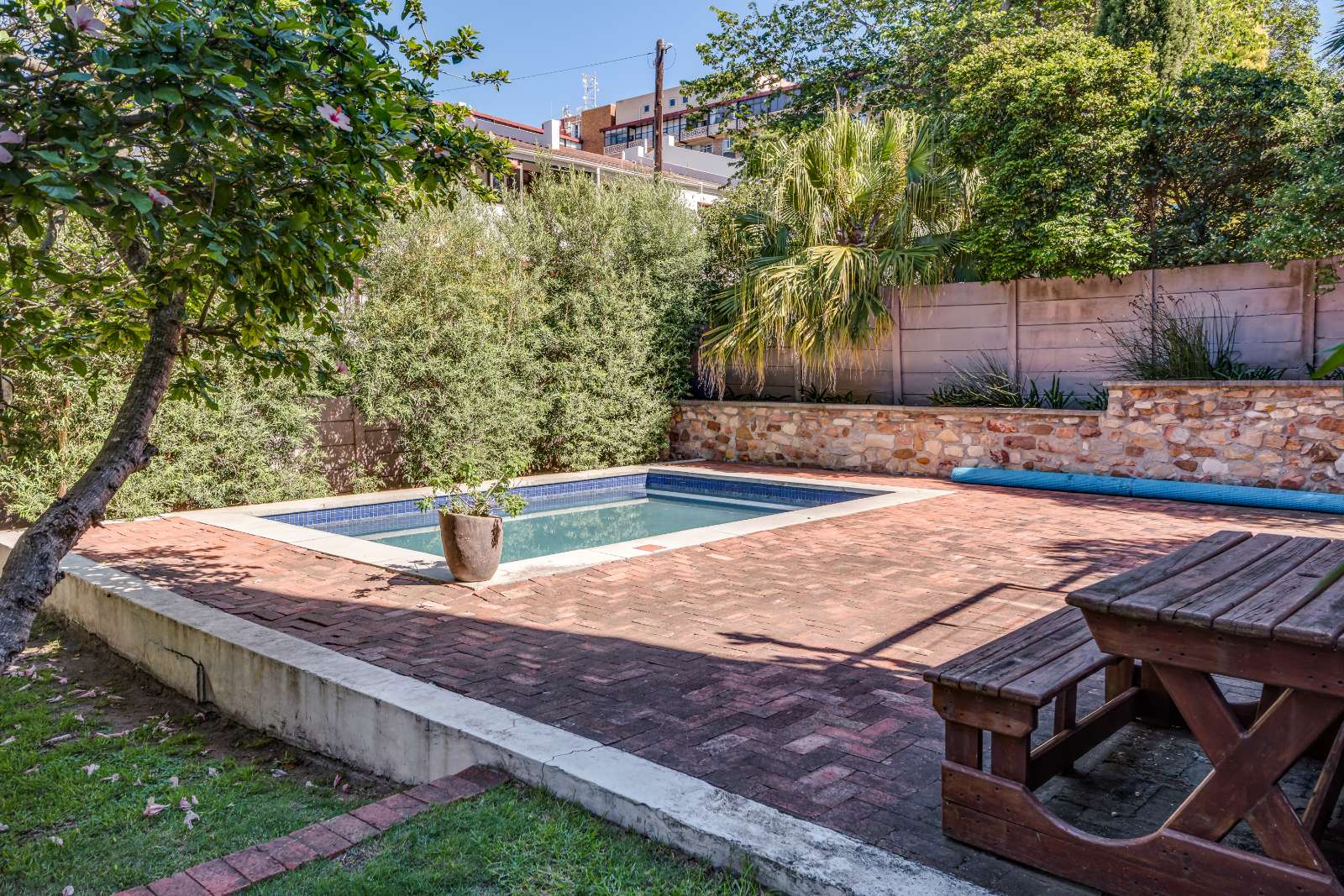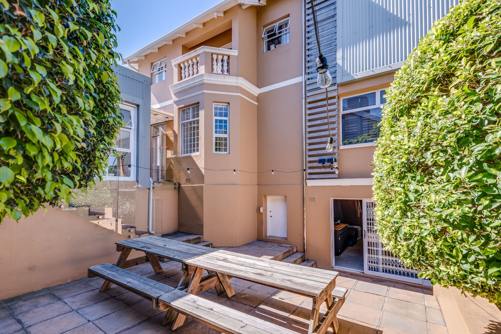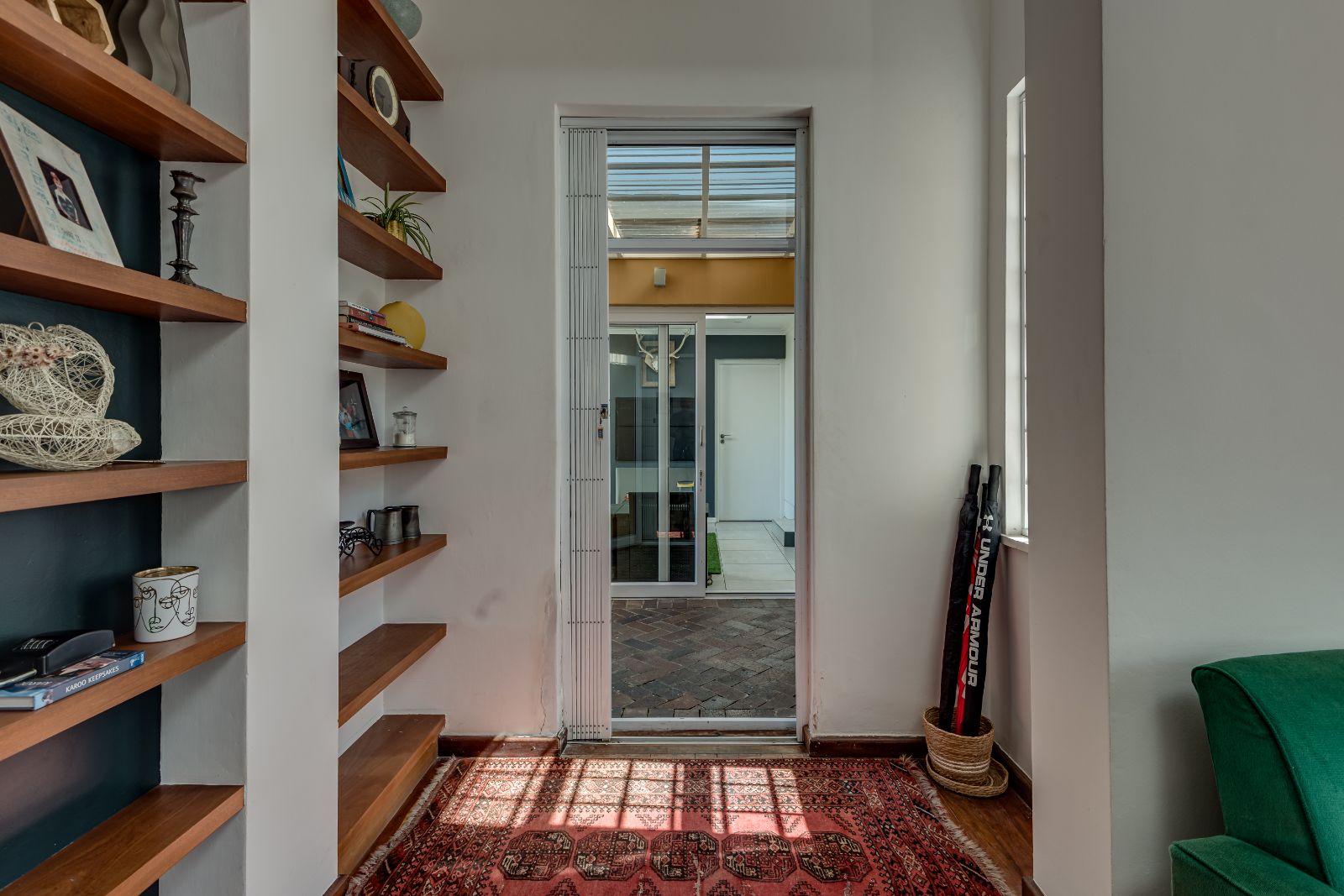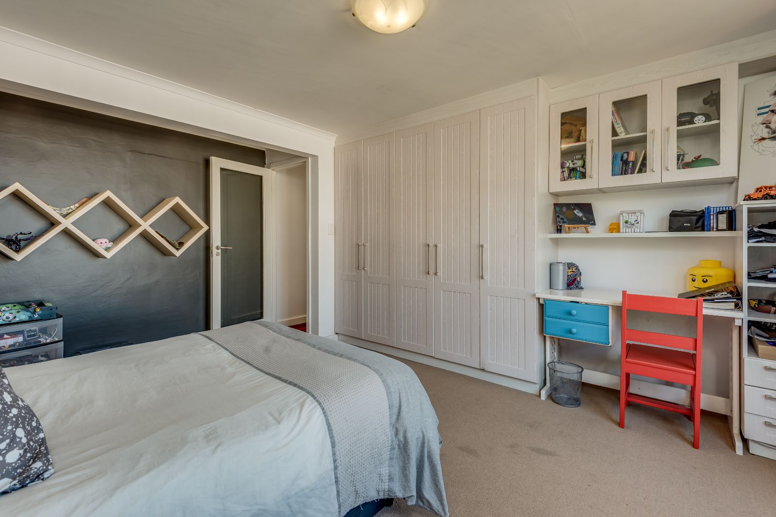 Glass sliding doors open from this space onto a balcony, creating an effortless extension of the dining and kitchen area, ideal for entertaining. This elevated outdoor space is currently used with a portable braai and enjoys lovely views over the pool and garden below. A separate braai room on this level further enhances the home’s entertainment offering.