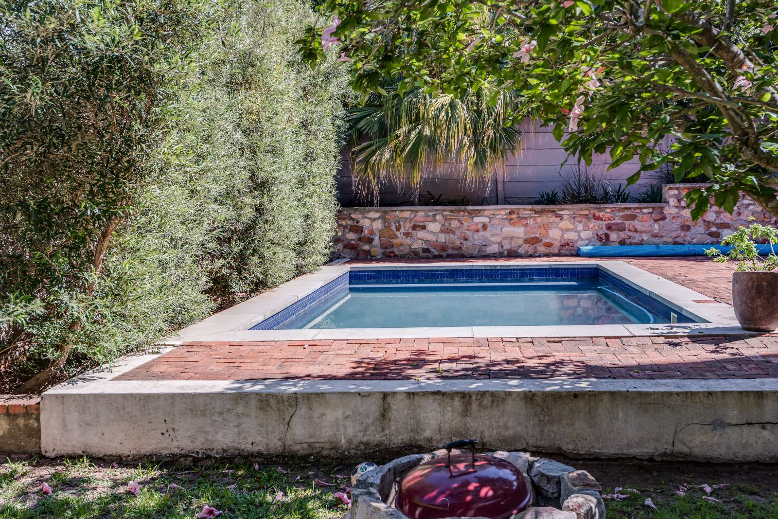 The lower level is designed for relaxed living and entertaining, offering a spacious entertainment room with a built-in bar area and direct stair access back up into the kitchen. From here, you step down into a large garden with a sparkling salt-chlorinated swimming pool (with cover) and a dedicated fire pit area, perfect for enjoying evenings with family and friends.