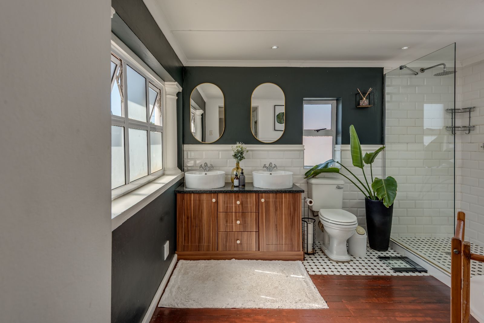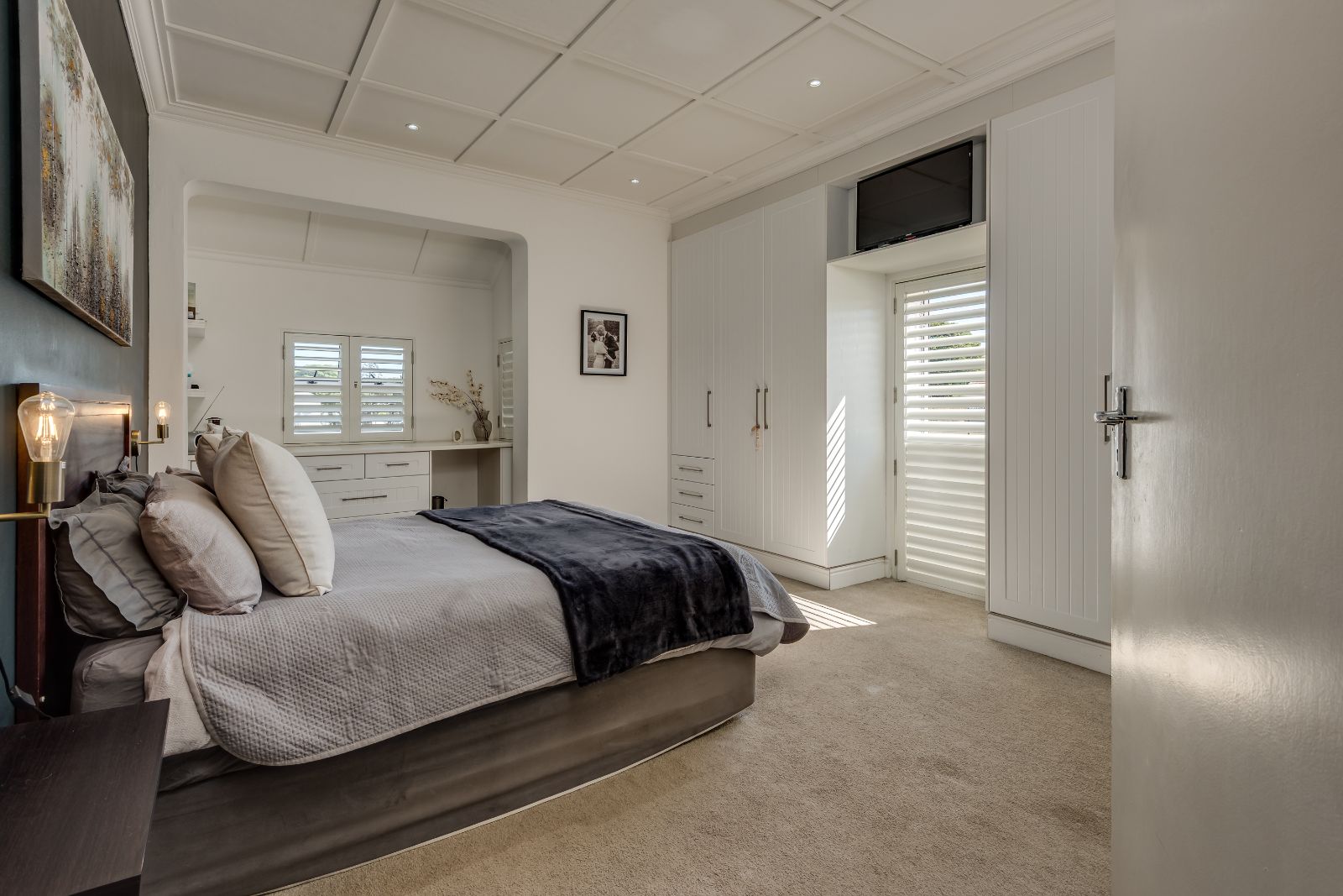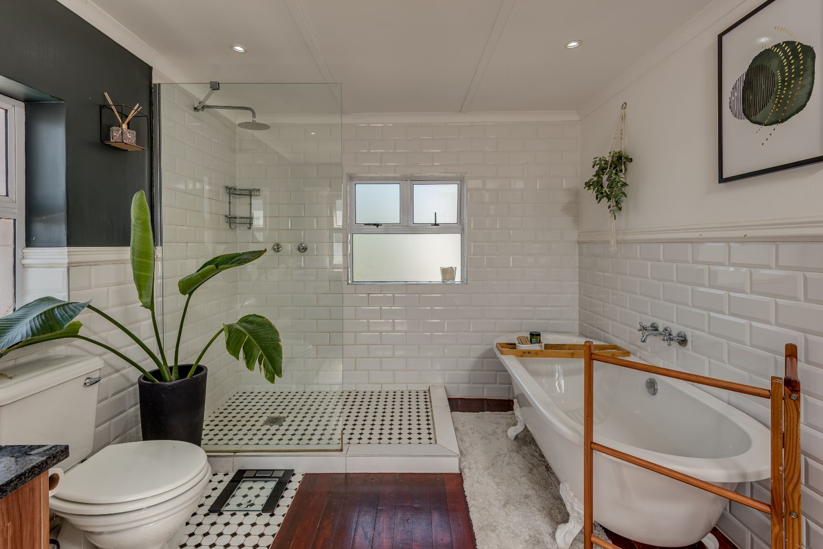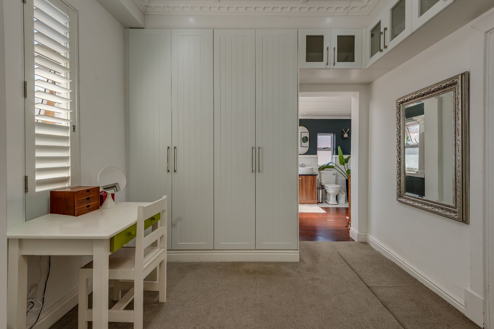A beautiful wooden staircase leads to the upper level, where four generously sized bedrooms provide comfortable family accommodation. The main bedroom is a true retreat, complete with American shutters, a private balcony, a spacious dressing room with ample cupboards, and a full en-suite bathroom with double basins, shower, and a classic freestanding ball-and-claw bath. The remaining bedrooms are all double in size with built-in cupboards, and are serviced by a modern family bathroom.