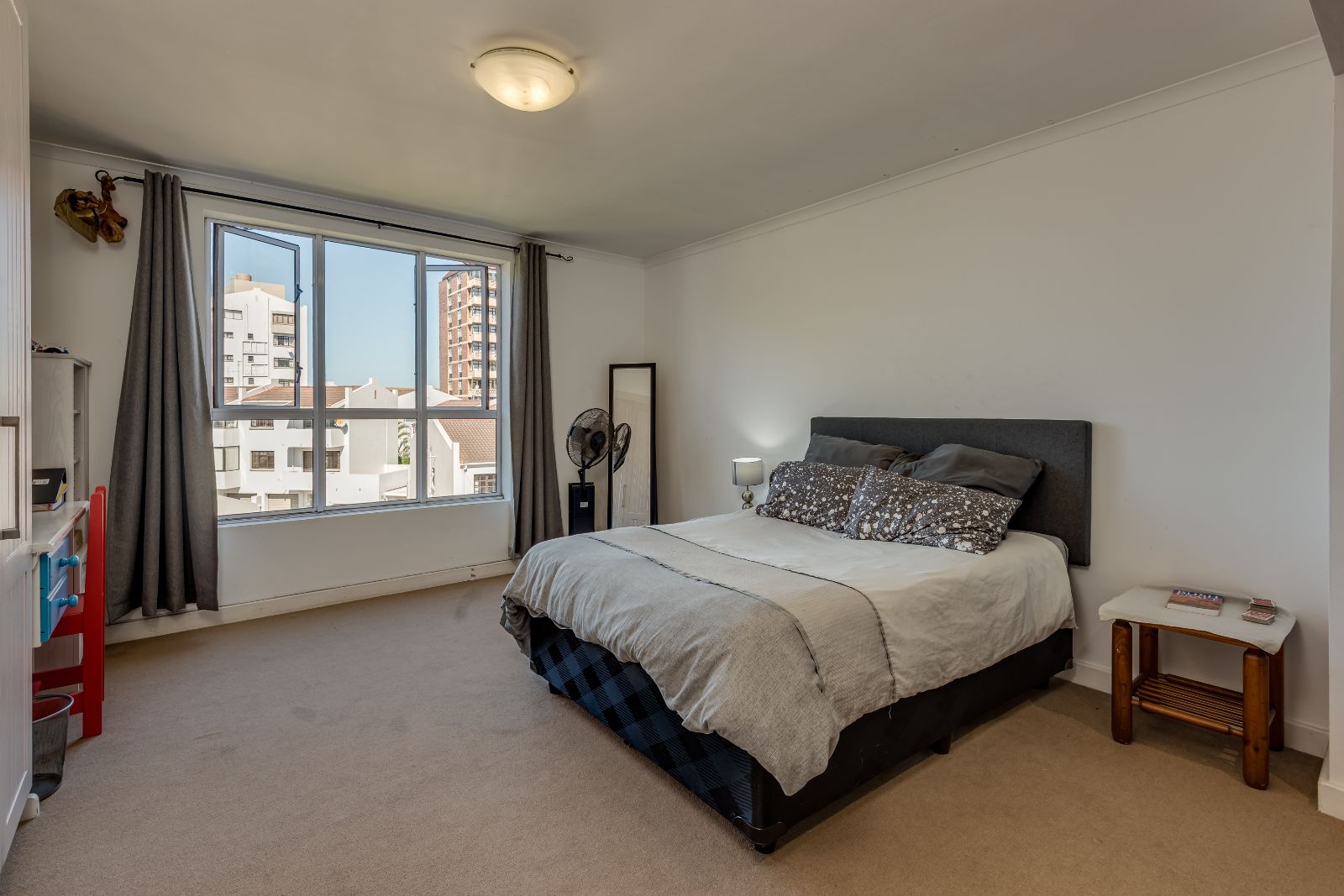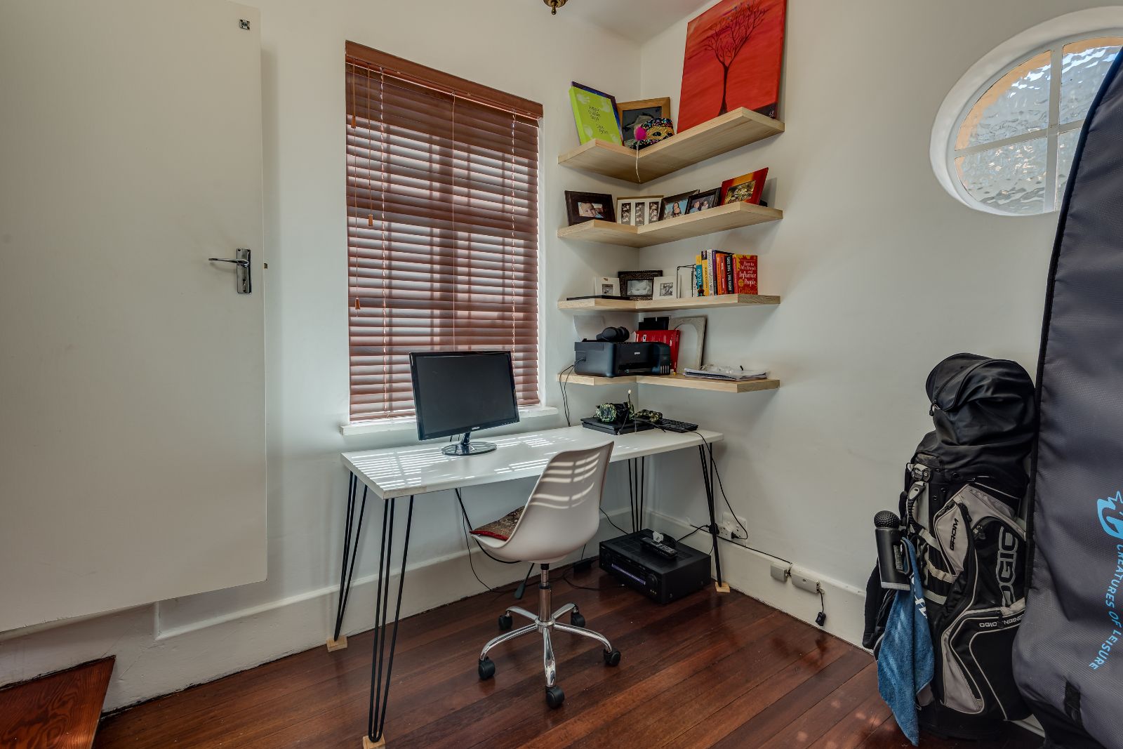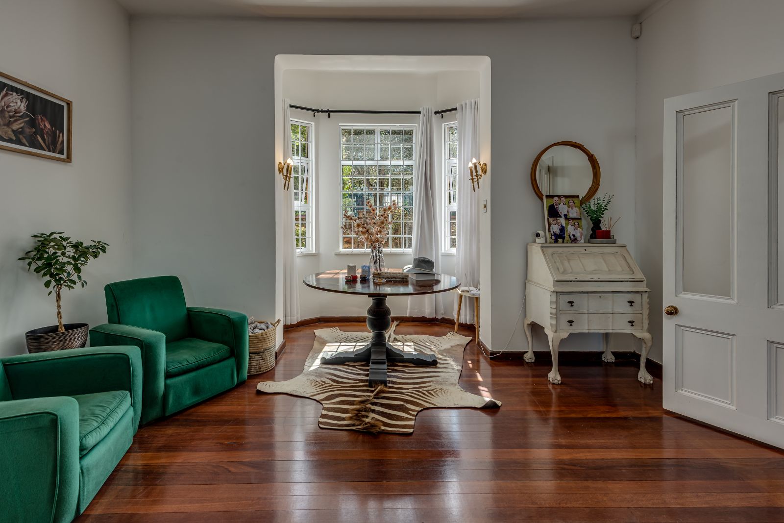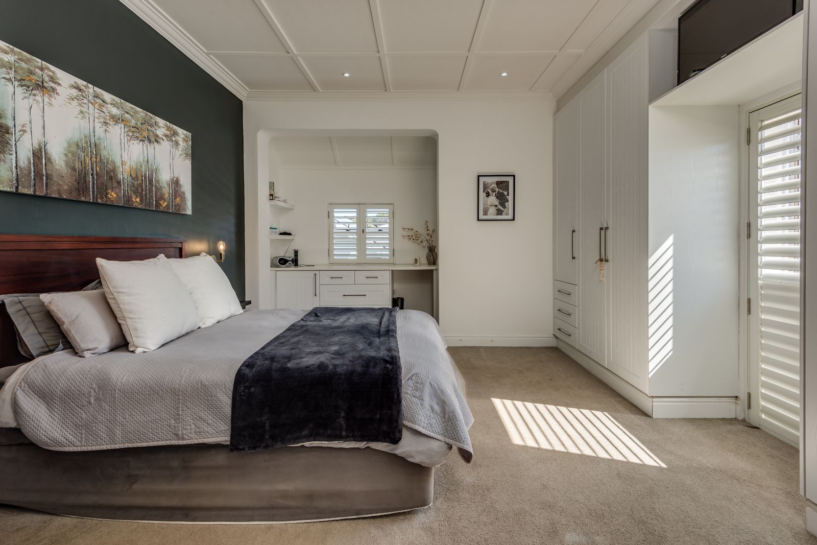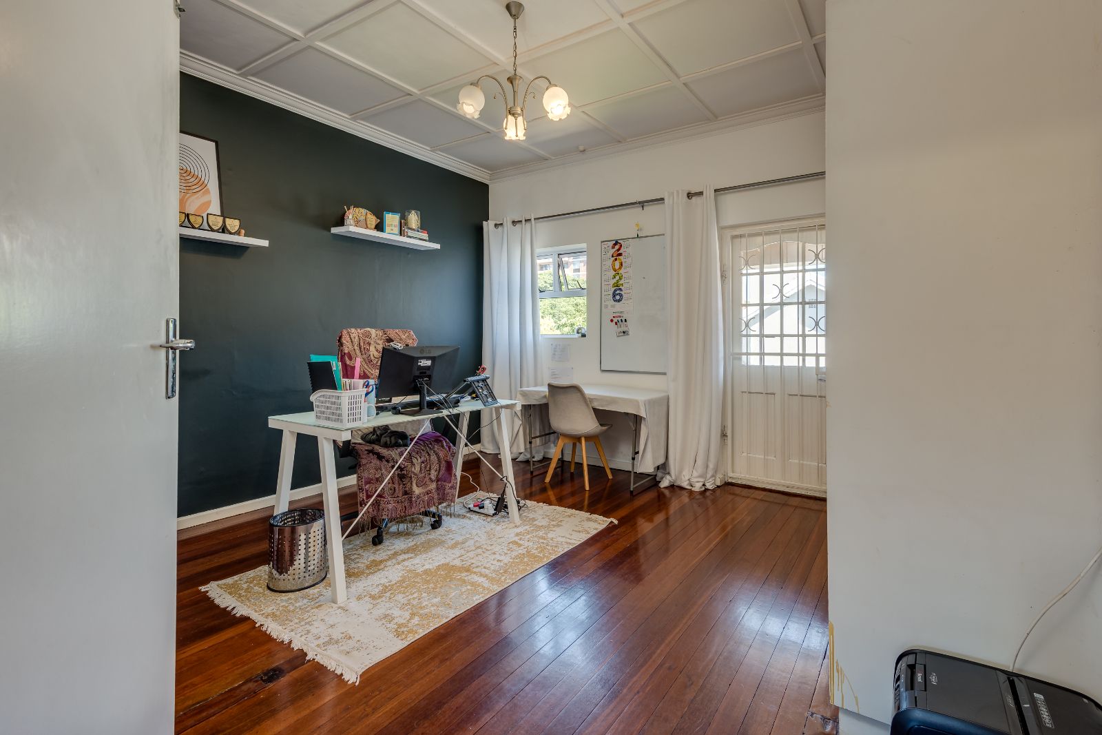 A beautiful wooden staircase leads to the upper level, where four generously sized bedrooms provide comfortable family accommodation. The main bedroom is a true retreat, complete with American shutters, a private balcony, a spacious dressing room with ample cupboards, and a full en-suite bathroom with double basins, shower, and a classic freestanding ball-and-claw bath. The remaining bedrooms are all double in size with built-in cupboards, and are serviced by a modern family bathroom.