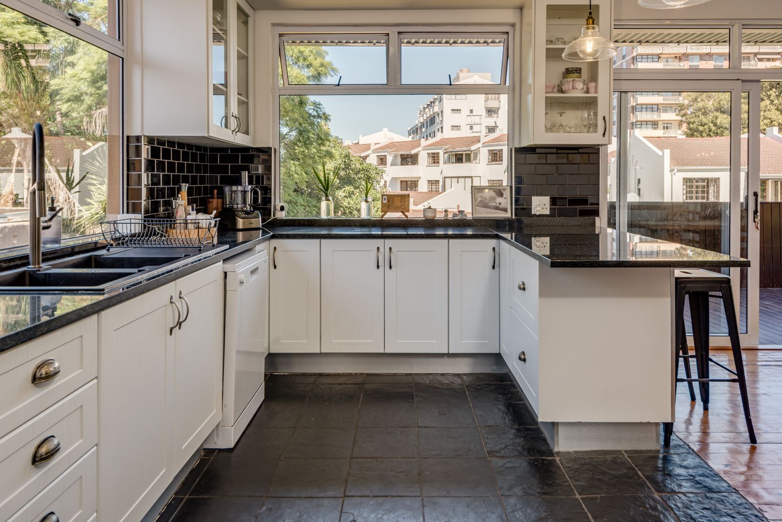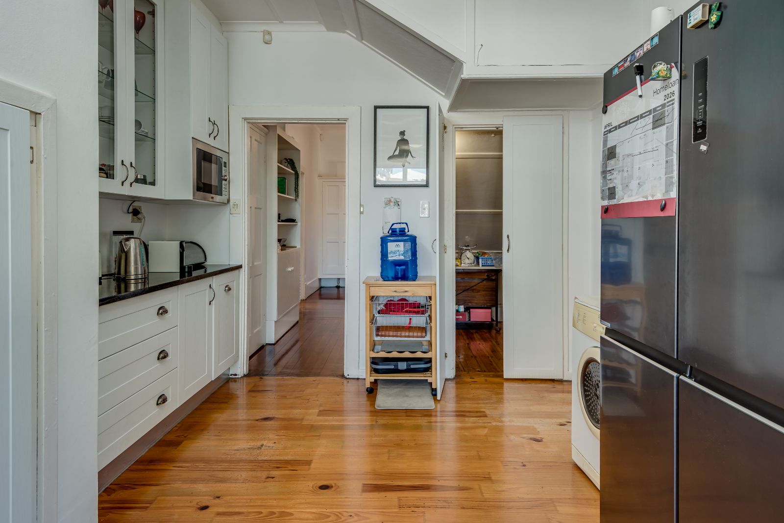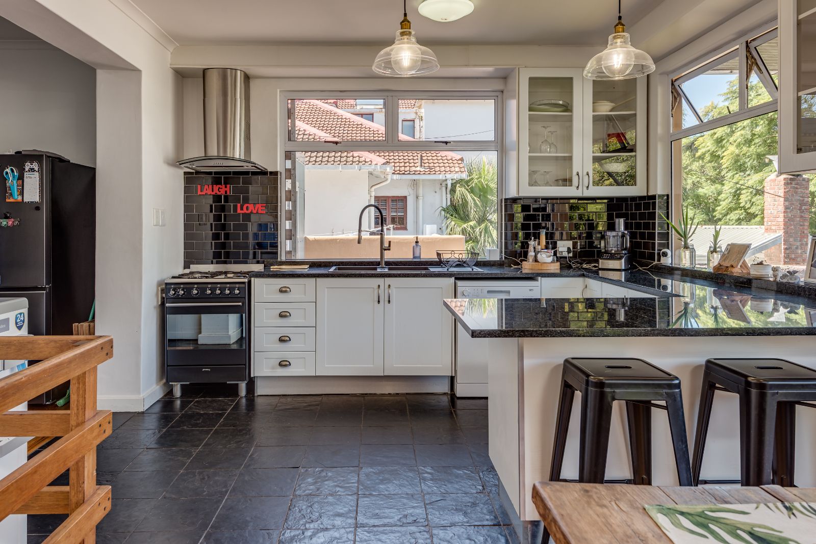 The kitchen is both practical and stylish, featuring granite countertops, a breakfast bar, gas hob, a walk-in pantry cleverly created beneath the staircase, and a separate scullery.