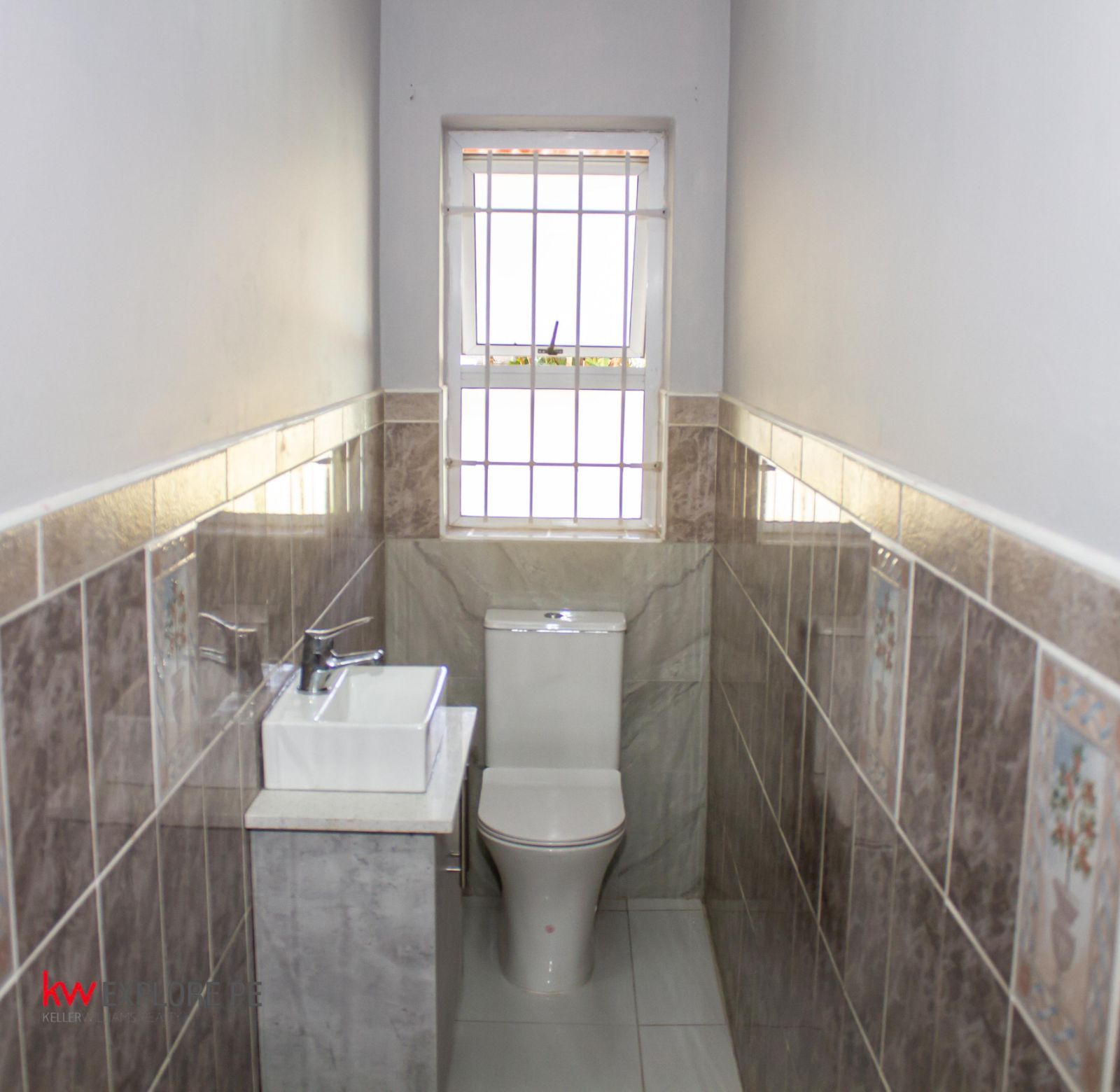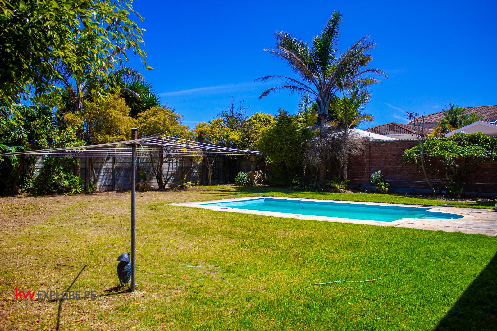Downstairs features a bright open-plan lounge and dining area with an indoor braai, ideal for year-round entertaining. A separate TV room provides extra space for the family, while a guest bathroom adds convenience. The indoor entertainment area flows seamlessly out to a sparkling swimming pool and generous yard, creating the perfect setting for relaxed outdoor living.