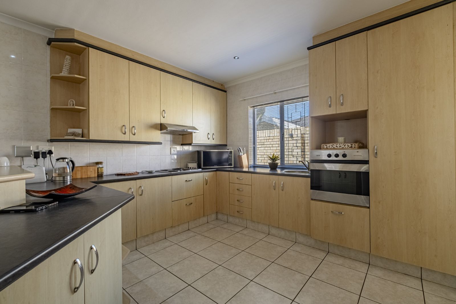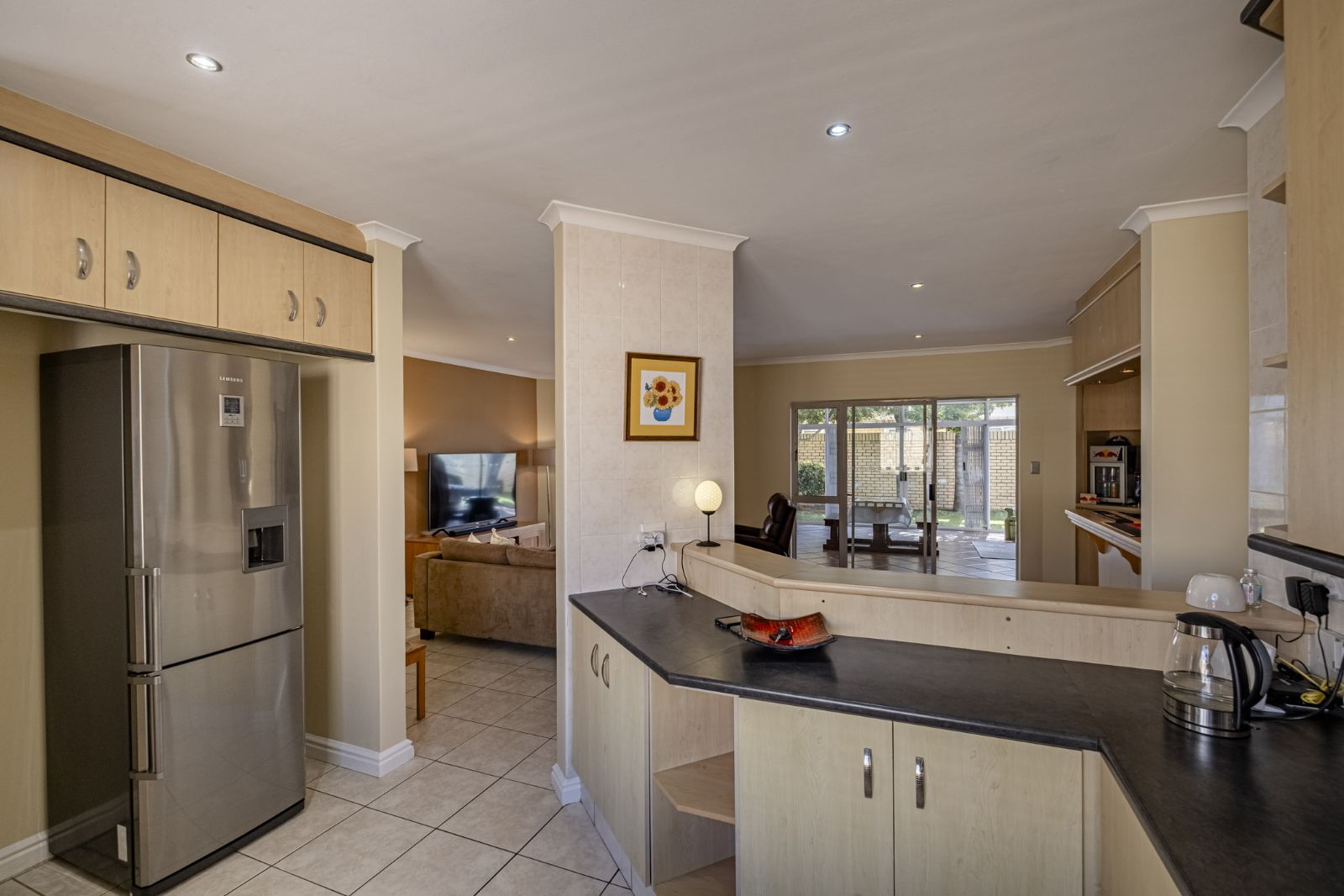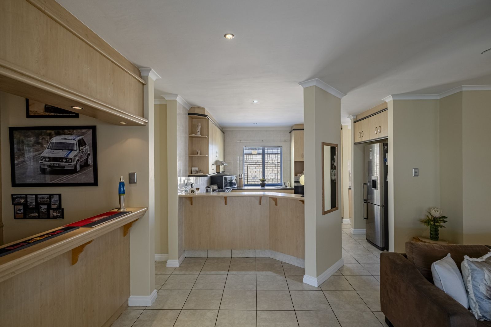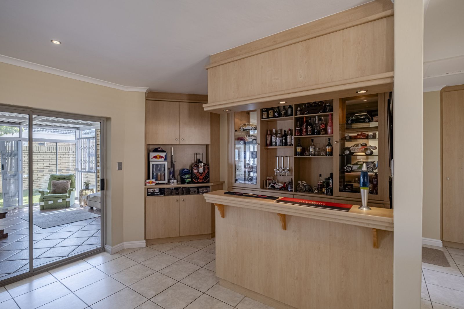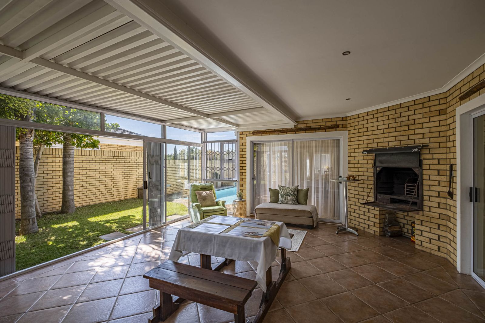 The modern kitchen offers ample cupboard space and a separate scullery, flowing effortlessly into the open-plan dining and lounge area. Entertain in style in the enclosed braai room, complete with a built-in bar, opening out to the pool area — perfect for year-round gatherings with friends and family.